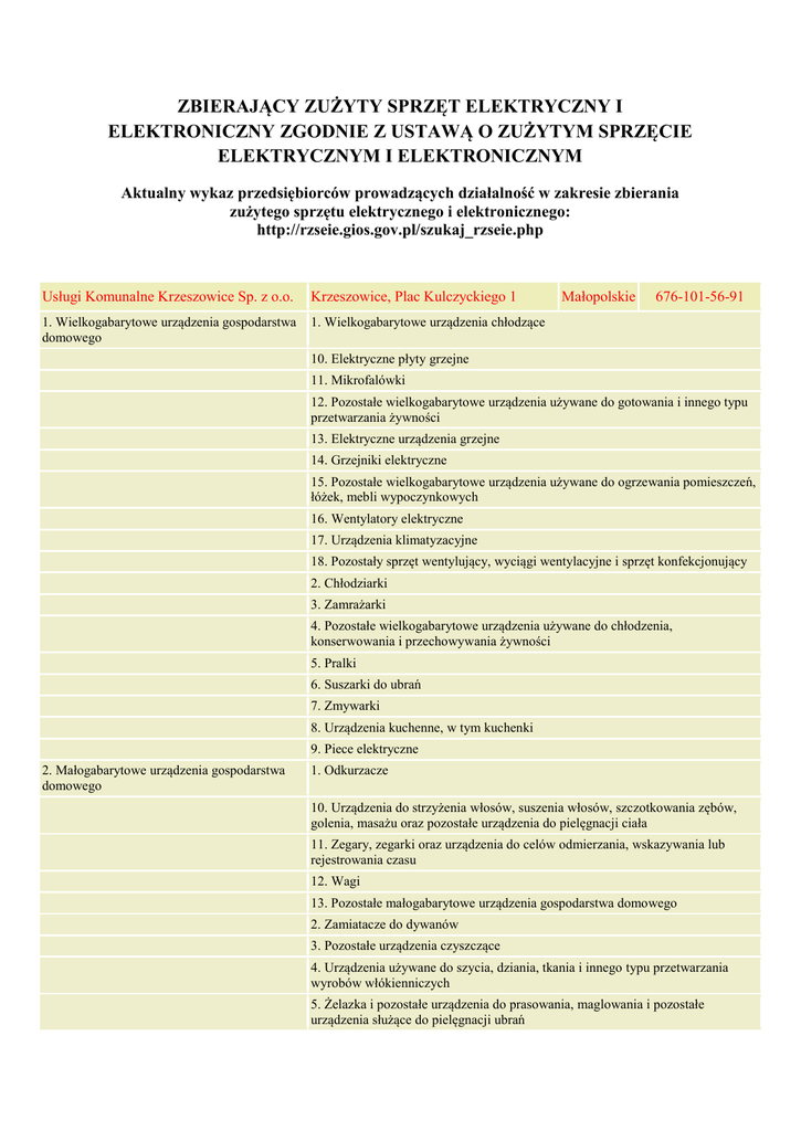 ZBIERAJĄCY ZUŻYTY SPRZĘT ELEKTRYCZNY I ELEKTRONICZNY ZGODNIE Z USTAWĄ O ZUŻYTYM SPRZĘCIE ELEKTRYCZNYM I ELEKTRONICZNYM Aktualny wykaz przedsiębiorców prowadzących działalność w zakresie zbierania zużytego sprzętu elektrycznego i elektronicznego: http://rzseie.gios.gov.pl/szukaj_rzseie.php Usługi Komunalne Krzeszowice Sp. z o.o. Krzeszowice, Plac Kulczyckiego 1 1. Wielkogabarytowe urządzenia gospodarstwa domowego 1. Wielkogabarytowe urządzenia chłodzące Małopolskie 676-101-56-91 10. Elektryczne płyty grzejne 11. Mikrofalówki 12. Pozostałe wielkogabarytowe urządzenia używane do gotowania i innego typu przetwarzania żywności 13. Elektryczne urządzenia grzejne 14. Grzejniki elektryczne 15. Pozostałe wielkogabarytowe urządzenia używane do ogrzewania pomieszczeń, łóżek, mebli wypoczynkowych 16. Wentylatory elektryczne 17. Urządzenia klimatyzacyjne 18. Pozostały sprzęt wentylujący, wyciągi wentylacyjne i sprzęt konfekcjonujący 2. Chłodziarki 3. Zamrażarki 4. Pozostałe wielkogabarytowe urządzenia używane do chłodzenia, konserwowania i przechowywania żywności 5. Pralki 6. Suszarki do ubrań 7. Zmywarki 8. Urządzenia kuchenne, w tym kuchenki 9. Piece elektryczne 2. Małogabarytowe urządzenia gospodarstwa domowego 1. Odkurzacze 10. Urządzenia do strzyżenia włosów, suszenia włosów, szczotkowania zębów, golenia, masażu oraz pozostałe urządzenia do pielęgnacji ciała 11. Zegary, zegarki oraz urządzenia do celów odmierzania, wskazywania lub rejestrowania czasu 12. Wagi 13. Pozostałe małogabarytowe urządzenia gospodarstwa domowego 2. Zamiatacze do dywanów 3. Pozostałe urządzenia czyszczące 4. Urządzenia używane do szycia, dziania, tkania i innego typu przetwarzania wyrobów włókienniczych 5. Żelazka i pozostałe urządzenia do prasowania, maglowania i pozostałe urządzenia służące do pielęgnacji ubrań 6. Tostery 7. Frytownice 8. Rozdrabniacze, młynki do kawy oraz urządzenia do otwierania i zamykania pojemników i opakowań 9. Noże elektryczne 3. Sprzęt teleinformatyczny i telekomunikacyjny a1. Scentralizowane przetwarzanie danych: Komputery duże a2. Scentralizowane przetwarzanie danych: Stacje robocze a3. Scentralizowane przetwarzanie danych: Jednostki drukujące b1. Komputery osobiste: Komputery osobiste stacjonarne, w tym procesor, mysz, monitor i klawiatura b10. Komputery osobiste: Terminale i systemy użytkownika b11. Komputery osobiste: Faksy b12. Komputery osobiste: Teleksy b13. Komputery osobiste: Telefony b14. Komputery osobiste: Automaty telefoniczne b15. Komputery osobiste: Telefony bezprzewodowe b16. Komputery osobiste: Telefony komórkowe b17. Komputery osobiste: Systemy zgłoszeniowe/ sekretarki automatyczne b18. Komputery osobiste: Pozostałe produkty lub sprzęt służący do transmisji głosu, obrazu lub innych informacji za pomocą technologii telekomunikacyjnej b2. Komputery osobiste: Laptopy, w tym procesor, mysz, monitor i klawiatura b3. Komputery osobiste: Notebooki b4. Komputery osobiste: Notepady b5. Komputery osobiste: Drukarki b6. Komputery osobiste: Sprzęt kopiujący b7. Komputery osobiste: Elektryczne i elektroniczne maszyny do pisania b8. Komputery osobiste: Kalkulatory kieszonkowe i biurowe b9. Komputery osobiste: Pozostały sprzęt do zbierania, przechowywania, przetwarzania, prezentowania lub przekazywania informacji drogą elektroniczną 4. Sprzęt audiowizualny 1. Odbiorniki radiowe 2. Odbiorniki telewizyjne 3. Kamery video 4. Sprzęt video 5. Sprzęt hi-fi 6. Wzmacniacze dźwięku 7. Instrumenty muzyczne 8. Pozostałe produkty lub sprzęt do celów nagrywania lub odtwarzania dźwięku lub obrazów, w tym sygnałów lub innych technologii, dystrybucji dźwięku i obrazu za pomocą technologii telekomunikacyjnych 5. 5.1,6 Sprzęt oświetleniowy - Urządzenia i oprawy oświetleniowe 1. Oprawy oświetleniowe do lamp fluorescencyjnych, z wyjątkiem opraw oświetleniowych stosowanych w gospodarstwach domowych 5. 5.2-5 Sprzęt oświetleniowy - Lampy wszelkiego rozaju 2. Liniowe lampy fluorescencyjne 3. Kompaktowe lampy fluorescencyjne 4. Wysokoprężne lampy wyładowcze, w tym ciśnieniowe lampy sodowe oraz lampy metalohalogenkowe 5. Niskoprężne lampy sodowe 5. 5.1,6 Sprzęt oświetleniowy - Urządzenia i oprawy oświetleniowe 6. Pozostałe urządzenia oświetleniowe służące do celów rozpraszania i kontroli światła, z wyjątkiem żarówek 6. Narzędzia elektryczne i elektroniczne, z wyjątkiem wielkogabarytowych, stacjonarnych narzędzi przemysłowych 1. Wiertarki 2. Piły 3. Maszyny do szycia 4. Urządzenia do skręcania, mielenia, piaskowania, przemiału, piłowania, cięcia, nawiercania, robienia otworów, nabijania, składania, gięcia lub podobnych metod przetwarzania drewna, metalu i innych materiałów 5. Narzędzia do nitowania, przybijania lub przyśrubowania lub usuwania nitów, gwoździ, śrub lub podobnych zastosowań 6. Narzędzia do spawania, lutowania lub podobnych zastosowań 7. Urządzenia do rozpylania, rozprowadzania, rozpraszania lub innego typu nanoszenia cieczy lub substancji gazowych innymi metodami 8. Narzędzia do koszenia trawy lub innych prac ogrodniczych 9. Pozostałe narzędzia elektryczne i elektroniczne 7. Zabawki, sprzęt rekreacyjny i sportowy 1. Kolejki elektryczne lub tory wyścigowe 2. Kieszonkowe konsole do gier video 3. Gry video 4. Komputerowo sterowane urządzenia do uprawiania sportów rowerowych, nurkowania, biegania, wiosłowania 5. Sprzęt sportowy z elektrycznymi lub elektronicznymi częściami składowymi GREKO Grzegorz Gąsior Krzeszowice, ul. Legionów Polskich 1 Małopolskie 676-112-08-44 1. Wielkogabarytowe urządzenia gospodarstwa 10. Elektryczne płyty grzejne domowego 11. Mikrofalówki 13. Elektryczne urządzenia grzejne 14. Grzejniki elektryczne 16. Wentylatory elektryczne 17. Urządzenia klimatyzacyjne 2. Chłodziarki 3. Zamrażarki 5. Pralki 6. Suszarki do ubrań 7. Zmywarki 8. Urządzenia kuchenne, w tym kuchenki 9. Piece el