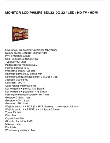 MONITOR LCD PHILIPS BDL3210Q 32 / LED / HD TV / HDMI Gwarancja: 36 miesięcy gwarancji fabrycznej Numer części EAN: 8712581657628 P/N: 8712581657628 Kod Producenta: BDL3210Q Typ matrycy: LCD Podświetlenie matrycy: LED Format obrazu: 16 :9 Przekątna ekranu: 32 cale Rozmiar plamki: 0.17 x 0.51 mm Nominalna rozdzielczość: HDTV (1.366 x 768) Jasność: 300 cd/m2 Kontrast: 1200 :1 Czas reakcji matrycy: 8 ms Kąt widzenia w pionie: 178 Stopni Kąt widzenia w poziomie: 178 Stopni Ilość wyświetlanych kolorów: 16,7 mln Gniazdo D-Sub: 1 szt. Gniazdo HDMI: 2 szt. Gniazdo USB: 2 szt. Wejście audio: 4 x RCA (2 x RCA Stereo), 1 x mini-jack 3.5 mm Wyjście audio: 1 x SPDIF, 1 x mini-jack 3.5 mm Tuner TV: Nie Pilot: Tak Czytnik kart: Nie Głośniki: 2 x 10 W RMS Mikrofon: Nie Pivot: Nie Wbudowany zasilacz: Tak Możliwość zawieszenia na ścianie: Tak Zgodność z normami: Lead Free, ROHS compliant, Energy Star Kolor obudowy: Czarny Wysokość: 462 mm Szerokość: 745 mm Głębokość: 57 mm Waga: 8 kg Wyposażenie: Instrukcja obsługi, pilot z bateriami, przewód zasilający i VGA Pobór mocy Wł./Wył.: 100/ 0,5 W Informacje dodatkowe: Q-line to seria profesjonalnych monitorów PHILIPS wyposażonych w podświetlenie typu LED (gwarantujące niski pobór prądu oraz niewielką wagę) przeznaczona dla rynku Digital Signage. Dzięki występującym w serii Q-line rozwiązaniom oszczędzającym energię, takim jak Ambient Light Sensor (czujnik oświetlenia zewnętrznego) możliwe jest zredukowanie przyszłych kosztów użytkowania urządzenia (TCO). Takie rozwiązanie jest również niezwykle „zielone” (ekologiczne) co w przypadku serii Q-line potwierdza certyfikat Energy Star. Monitory serii Q-line wyposażono w złącze USB z którego odtwarzane są filmy, muzyka i obrazy zapisane na pamięci przenośnej (np. pendrive). Funkcje: - Intelligent Brightness Control; - Pixel Shift; - Low Bright; - Smart Control; zarządzanietygodniowym harmonogramem pracy monitora. Żywotność panelu: 50.000h; - szerokość ramki: 22 mm (część dolna: 45 mm); - dodatkowe wyjścia Video: Component, Composite; - dodatkowe porty komunikacyjne: RS232 (in/ out); - standard VESA: 200 x 100; - gwarancja:3 lata. Wyposażenie opcjonalne: statyw, podstawa, uchwyt ścienny, uchwyt sufitowy. www: Link na stronę opisu technicznego Cena: 2662.96 PLN Powered by TCPDF (www.tcpdf.org)
