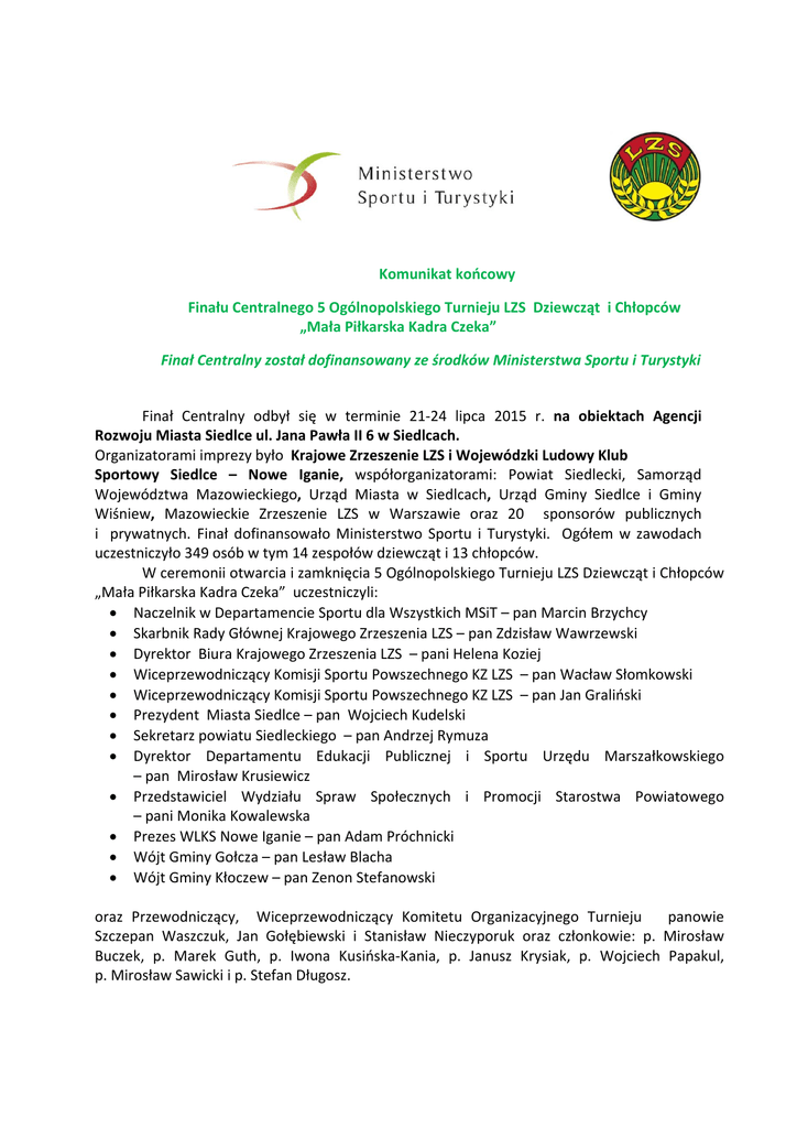 Komunikat końcowy Finału Centralnego 5 Ogólnopolskiego Turnieju LZS Dziewcząt i Chłopców „Mała Piłkarska Kadra Czeka” Finał Centralny został dofinansowany ze środków Ministerstwa Sportu i Turystyki Finał Centralny odbył się w terminie 21‐24 lipca 2015 r. na obiektach Agencji Rozwoju Miasta Siedlce ul. Jana Pawła II 6 w Siedlcach. Organizatorami imprezy było Krajowe Zrzeszenie LZS i Wojewódzki Ludowy Klub Sportowy Siedlce – Nowe Iganie, współorganizatorami: Powiat Siedlecki, Samorząd Województwa Mazowieckiego, Urząd Miasta w Siedlcach, Urząd Gminy Siedlce i Gminy Wiśniew, Mazowieckie Zrzeszenie LZS w Warszawie oraz 20 sponsorów publicznych i prywatnych. Finał dofinansowało Ministerstwo Sportu i Turystyki. Ogółem w zawodach uczestniczyło 349 osób w tym 14 zespołów dziewcząt i 13 chłopców. W ceremonii otwarcia i zamknięcia 5 Ogólnopolskiego Turnieju LZS Dziewcząt i Chłopców „Mała Piłkarska Kadra Czeka” uczestniczyli: Naczelnik w Departamencie Sportu dla Wszystkich MSiT – pan Marcin Brzychcy Skarbnik Rady Głównej Krajowego Zrzeszenia LZS – pan Zdzisław Wawrzewski Dyrektor Biura Krajowego Zrzeszenia LZS – pani Helena Koziej Wiceprzewodniczący Komisji Sportu Powszechnego KZ LZS – pan Wacław Słomkowski Wiceprzewodniczący Komisji Sportu Powszechnego KZ LZS – pan Jan Graliński Prezydent Miasta Siedlce – pan Wojciech Kudelski Sekretarz powiatu Siedleckiego – pan Andrzej Rymuza Dyrektor Departamentu Edukacji Publicznej i Sportu Urzędu Marszałkowskiego – pan Mirosław Krusiewicz Przedstawiciel Wydziału Spraw Społecznych i Promocji Starostwa Powiatowego – pani Monika Kowalewska Prezes WLKS Nowe Iganie – pan Adam Próchnicki Wójt Gminy Gołcza – pan Lesław Blacha Wójt Gminy Kłoczew – pan Zenon Stefanowski oraz Przewodniczący, Wiceprzewodniczący Komitetu Organizacyjnego Turnieju panowie Szczepan Waszczuk, Jan Gołębiewski i Stanisław Nieczyporuk oraz członkowie: p. Mirosław Buczek, p. Marek Guth, p. Iwona Kusińska‐Kania, p. Janusz Krysiak, p. Wojciech Papakul, p. Mirosław Sawicki i p. Stefan Długosz. Gospodarze życzyli wszystkim uczestniczkom i uczestnikom Turnieju niezapomnianych wrażeń z pobytu na gościnnej Ziemi Siedleckiej oraz jak najlepszych wyników sportowych podczas rozgrywek. Obowiązki sędziego głównego pełnił pan Marek Guth. Lista zgłoszonych drużyn do Finału Ogólnopolskiego Turnieju „Mała Piłkarska Kadra Czeka” 21‐24.07.2015 r. w Siedlcach LP NAZWA DRUŻYNY WOJEWÓDZTWO Dziewczęta 1 dolnośląskie 2 Chłopcy UKS „Zorza” Pęgów lubelskie UKS „Dubler” Opole Lubelskie Szkoła Podstawowa w Goździe 3 lubuskie UKS „Jedynka” Strzelce MKS „Łucznik” Strzelce Krajeńskie Krajeńskie 4 łódzkie Złote Piaski LKS Świnice Warckie GLKS „Włókniarz” Moszczenica 5 małopolskie LKS „Naprzód” Sobolów Akademia Piłkarska Gołcza 6 mazowieckie LUKS „Sportowa Czwórka” Radom LKS „Chojniak” Wieniawa 7 opolskie LKS „Rolnik” Biedrzychowice UKS „Orlik” Prudnik 8 podlaskie UKS „Orkan” Poświętne Szkoła Podstawowa w Jaświłach 9 pomorskie KTS‐K LZS GOSRiT Luzino LZS Bojano 10 śląskie UKS „Tygryski” Świętochłowice LKS „Pasjonat” Dankowice 11 świętokrzyskie LUKS „Wisła” Nowy Korczyn MKS „Wierna” Małogoszcz 12 warmińsko ‐ mazurskie LUKS „Kormoran” Brzydowo UKS BUKS Barczewo 13 wielkopolskie KKPK „Medyk” Konin KKS „Biały Orzeł” Koźmin Wielkopolski 14 zachodniopomorskie LUKS „Kusy” Suchań LKS „Olimpia” Bobolice Wyniki turnieju dziewcząt W turnieju wystartowało 14 drużyn. W pierwszym etapie drużyny drogą losowania zostały podzielone na cztery grupy. W grupach grano systemem „każdy z każdym”, następnie dwie pierwsze drużyny z każdej grupy rywalizowały o miejsca I‐VIII, pozostałe o miejsca IX‐XIV Wyniki Grupa: A LUKS „Czwórka” Radom ‐ UKS „Tygryski” Świętochłowice 5:1 UKS „Zorza” Pęgów ‐ LKS „Złote Piaski” Świnice Warckie 4:4 LUKS „Czwórka” Radom ‐ LKS „Złote Piaski” Świnice Warckie 7:1 UKS „Zorza” Pęgów ‐ UKS „Tygryski” Świętochłowice 0:1 LUKS „Czwórka” Radom ‐ UKS „Zorza” Pęgów 3:1 UKS „Tygryski” Świętochłowice ‐ LKS „Złote Piaski” Świnice Warckie 4:0 1. LUKS „Czwórka” Radom 9 15‐3 2. UKS „Tygryski” Świętochłowice 6 6‐5 3. UKS „Zorza” Pęgów 1 5‐8 4. LKS „Złote Piaski” Świnice Warckie 1 5‐15 Grupa: B KKPK „Medyk” Konin ‐ LKS „Rolnik” Biedrzychowice 8:2 KKPK „Medyk” Konin ‐ UKS „Dubler” Opole Lubelskie 1:0 LKS „Rolnik” Biedrzychowice ‐ UKS „Dubler” Opole Lubelskie 0:1 1. KKPK „Medyk” Konin 6 9‐2 2. UKS „Dubler” Opole Lubelskie 3 1‐1 3. LKS „Rolnik” Biedrzychowice 0 2‐9 Grupa: C LUKS „Wisła” Nowy Korczyn ‐ UKS „Jedynka” Strzelce Krajeńskie 1:1 LUKS „Kusy” Suchań ‐ LKS „Naprzód” Sobolów 3:1 LUKS „Wisła” Nowy Korczyn ‐LKS „Naprzód” Sobolów 2:6 LUKS „Kusy” Suchań ‐ UKS „Jedynka” Strzelce Krajeńskie 4:1 LUKS „Wisła” Nowy Korczyn ‐ LUKS „Kusy” Suchań 0:0 LKS „Naprzód” Sobolów ‐ UKS „Jedynka” Strzelce Krajeńskie 3:0 1. LUKS „Kusy” Suchań 7 7‐2 2. LKS „Naprzód” Sobolów 6 10‐5 3. LUKS „Wisła” Nowy Korczyn 2 3‐6 4. UKS „Jedynka” Strzelce Krajeńskie 1 2‐8 Grupa: D GOSRiT Luzino ‐ UKS „Orkan” Poświętne 3:3 GOSRiT Luzino ‐ LUKS „Kormoran” Brzydowo 2:3 LUKS „Kormoran” Brzydowo ‐ UKS „Orkan” Poświętne 4:1 1. LUKS „Kormoran” Brzydowo 4 6‐3 2. GOSRiT Luzino 1 5‐5 3. UKS „Orkan” Poświętne 1 4‐7 Mecze o miejsca IX‐XIV UKS „Zorza” Pęgów ‐ UKS „Jedynka” Strzelce Krajeńskie 2:0 LUKS „Wisła” Nowy Korczyn ‐ LKS „Złote Piaski” Świnice Warckie 1:2 LKS „Rolnik” Biedrzychowice ‐ UKS „Orkan” Poświętne 7:5 Zwycięzcy ww. spotkań tworzyli grupę E grając 