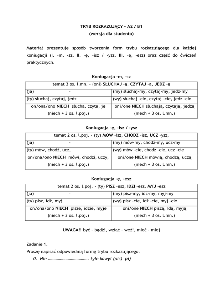 TRYB ROZKAZUJĄCY – A2 / B1 (wersja dla studenta) Materiał prezentuje sposób tworzenia form trybu rozkazującego dla każdej koniugacji (I. –m, -sz, II. –ę, -isz / -ysz, III. –ę, -esz) oraz część do ćwiczeń praktycznych. Koniugacja –m, -sz temat 3 os. l.mn. - (oni) SŁUCHAJ –ą, CZYTAJ –ą, JEDZ –ą (ja) – (my) słuchaj-my, czytaj-my, jedz-my (ty) słuchaj, czytaj, jedz (wy) słuchaj –cie, czytaj –cie, jedz -cie on/ona/ono NIECH słucha, czyta, je oni/one NIECH słuchają, czytają, jedzą (niech + 3 os. l.poj.) (niech + 3 os. l.mn.) Koniugacja –ę, -isz / -ysz temat 2 os. l.poj. - (ty) MÓW –isz, CHODZ –isz, UCZ –ysz, (ja) – (my) mów-my, chodź-my, ucz-my (ty) mów, chodź, ucz, (wy) mów –cie, chodź –cie, ucz -cie on/ona/ono NIECH mówi, chodzi, uczy, oni/one NIECH mówią, chodzą, uczą (niech + 3 os. l.poj.) (niech + 3 os. l.mn.) Koniugacja –ę, -esz temat 2 os. l.poj. - (ty) PISZ –esz, IDZI –esz, MYJ -esz (ja) – (ty) pisz, idź, myj (my) pisz-my, idź-my, myj-my (wy) pisz –cie, idź –cie, myj –cie on/ona/ono NIECH pisze, idzie, myje oni/one NIECH piszą, idą, myją (niech + 3 os. l.poj.) (niech + 3 os. l.mn.) UWAGA!! być – bądź!, wziąć – weź!, mieć - miej Zadanie 1. Proszę napisać odpowiednią formę trybu rozkazującego: 0. Nie ………………………………. tyle kawy! (pić) pij 1. Aniu, ……………………………………………. tu do mnie na chwilę. (chodzić) 2. …………………………………….……. mi, skąd wiedziałeś, że miałam urodziny? (powiedzieć) 3. (my) Jesteśmy zmęczeni, ………………………………………………………. krótką przerwę. (zrobić) 4. (ty) …………………………….. mi trochę czasu. (dać) 5. ……………………….. Janek wreszcie ………………………………… tutaj sprzątać! (skończyć) 6. (wy) ……………………………………………… mi coś do jedzenia po drodze do domu. (kupić) 7. (ty) ……………………………………………….. mnie zrozumieć. (spróbować) 8. Nie ……………………………………………… tak dużo telewizji. Tracisz tylko czas. (oglądać) 9. ……………………………… dzieci …………………………. to zadanie domowe na wtorek. (napisać) 10. (wy) Nie …………………………………………….. tacy uparci! (być) 11. ………………………………………… tego na pamięć, bo inaczej nie zdasz testu. (nauczyć się) 12. Piotrek! ………………………………………….. już do domu! (iść) 13. (wy) ……………………………………. stąd tego kota, mam alergię! (wziąć) 14. (ty) ………………………………… to dla mnie, proszę. (zrobić) 15. ………………………………….. każdy sam …………………………………., co chciałby zmienić w firmie. (zdecydować) Zadanie 2. Proszę wybrać czasownik dokonany lub niedokonany i użyć formy trybu rozkazującego: 0. myć/umyć a. …………………………………… proszę naczynia. Umyj b. Nie ………………………………. głowy zimną wodą! myj 1. jeść/zjeść a. (ty) Nie …………………………………… tak szybko, to jest bardzo gorące! b. (wy) …………………………………. wszystko, to dla was. 2. kupować/kupić a. (my) ………………………………… coś dobrego na kolację! b. (ty) Nie ………………………………….. nigdy więcej lodów w tym miejscu! 3. robić/zrobić a. Janek, nie ………………………………. tego! b. (wy) ……………………………………….. tu porządek! 4. pisać/napisać a. (my) ………………………………….. list do znajomych z wakacji. b. …………………… Marysia …………………….. codziennie dyktanda. 5. pić/wypić a. (ty) Nie ……………………………………………… tyle kawy! b. (ty) ……………………………… to szybko! 6. iść/chodzić a. (wy) …………………………………….. tutaj, coś wam pokażę. b. (ty) ………………………….. stąd! 7. otwierać/otworzyć a. (ty) Nigdy nie …………………………………….. drzwi nieznajomym. b. (wy) ……………………………………. książki na stronie 57. 8. rozmawiać/porozmawiać a. (my) …………………………………….. o tym problemie. b. (ty) Nie ……………………………………….. ze mną w ten sposób! 9. mówić/powiedzieć a. …………………………… trochę ciszej, Hania śpi. b. (wy) ……………………………………. Agnieszce, że się trochę spóźnię. 10. powtarzać/powtórzyć a. (ty) ……………………………………. proszę ostatnie zdanie. b. (wy) ……………………………………… czasowniki nieregularne każdego dnia. Zadanie 3. GRA PLANSZOWA – MÓWIENIE / PISANIE Jeśli masz możliwość, zagraj z kimś, kto mówi po polsku. Jeśli nie, zapisz odpowiedzi. Proszę powiedzieć / napisać, co można zrobić w tej sytuacji. Proszę użyć form trybu rozkazującego, np. Pij mniej kawy!, Nie rób tego!, itp. 1. Znajomi 2. Twoja 3. Mąż za dużo muszą szybko się przyjaciółka źle pracuje i nie ma przeprowadzić, ale nie jeszcze się czuje od czasu mają kilku dni… dla rodziny… nowego mieszkania… 4. Koleżance 5. Kasia i Tomek 6. Dzieci popsuł się chcą przyjaciółki komputer, ale zorganizować niegrzeczne… nie ma pieniędzy przyjęcie, na naprawę… mają za są ale małe mieszkanie… 7. Ania kupiła 8. Przyjaciel 9. Babcia kolegi nową płytę, ale wyjeżdża na jest chora i leży nie działa… za w szpitalu… stypendium granicę… 10. Za kilka dni 11. Twój Adam nie 12. Sąsiedzi znajomy wie, jak spędzić zgubili klucze do ma egzamin na weekend… prawo jazdy… mieszkania… Odpowiedzi: Zadanie 1. 1. chodź, 2. powiedz, 3. zróbmy, 4. Daj, 5
