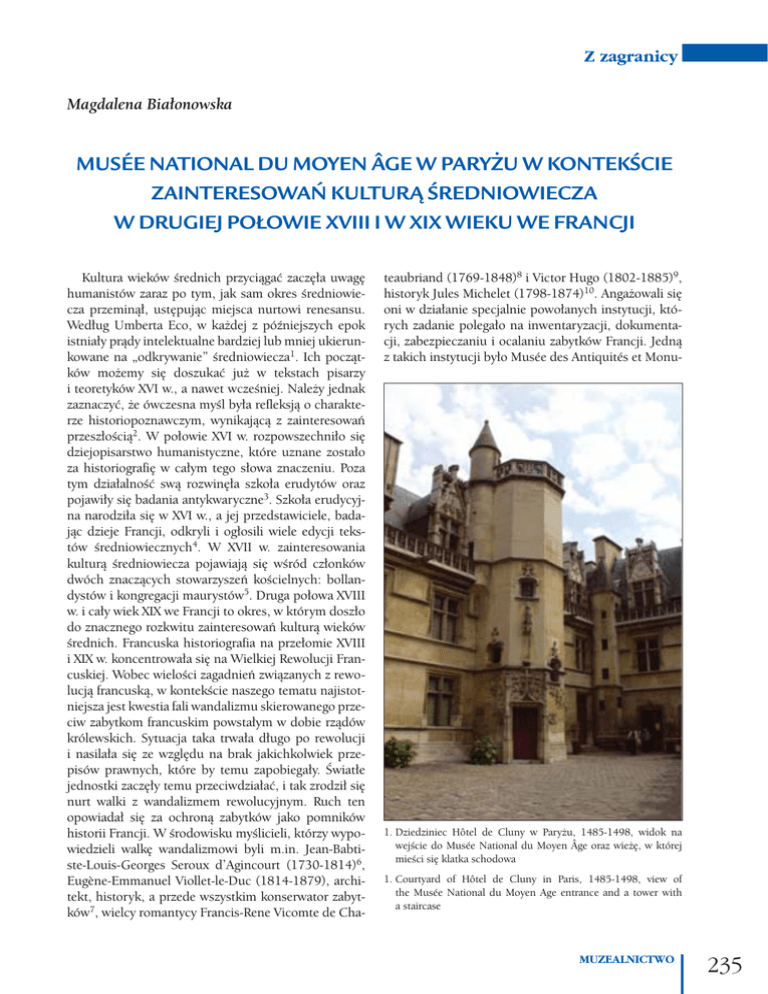 Z zagranicy Magdalena Białonowska MUSÉE NATIONAL DU MOYEN ÂGE W PARYŻU W KONTEKŚCIE ZAINTERESOWAŃ KULTURĄ ŚREDNIOWIECZA W DRUGIEJ POŁOWIE XVIII I W XIX WIEKU WE FRANCJI Kultura wieków średnich przyciągać zaczęła uwagę humanistów zaraz po tym, jak sam okres średniowiecza przeminął, ustępując miejsca nurtowi renesansu. Według Umberta Eco, w każdej z późniejszych epok istniały prądy intelektualne bardziej lub mniej ukierunkowane na „odkrywanie” średniowiecza1. Ich początków możemy się doszukać już w tekstach pisarzy i teoretyków XVI w., a nawet wcześniej. Należy jednak zaznaczyć, że ówczesna myśl była refleksją o charakterze historiopoznawczym, wynikającą z zainteresowań przeszłością2. W połowie XVI w. rozpowszechniło się dziejopisarstwo humanistyczne, które uznane zostało za historiografię w całym tego słowa znaczeniu. Poza tym działalność swą rozwinęła szkoła erudytów oraz pojawiły się badania antykwaryczne3. Szkoła erudycyjna narodziła się w XVI w., a jej przedstawiciele, badając dzieje Francji, odkryli i ogłosili wiele edycji tekstów średniowiecznych4. W XVII w. zainteresowania kulturą średniowiecza pojawiają się wśród członków dwóch znaczących stowarzyszeń kościelnych: bollandystów i kongregacji maurystów5. Druga połowa XVIII w. i cały wiek XIX we Francji to okres, w którym doszło do znacznego rozkwitu zainteresowań kulturą wieków średnich. Francuska historiografia na przełomie XVIII i XIX w. koncentrowała się na Wielkiej Rewolucji Francuskiej. Wobec wielości zagadnień związanych z rewolucją francuską, w kontekście naszego tematu najistotniejsza jest kwestia fali wandalizmu skierowanego przeciw zabytkom francuskim powstałym w dobie rządów królewskich. Sytuacja taka trwała długo po rewolucji i nasilała się ze względu na brak jakichkolwiek przepisów prawnych, które by temu zapobiegały. Światłe jednostki zaczęły temu przeciwdziałać, i tak zrodził się nurt walki z wandalizmem rewolucyjnym. Ruch ten opowiadał się za ochroną zabytków jako pomników historii Francji. W środowisku myślicieli, którzy wypowiedzieli walkę wandalizmowi byli m.in. Jean-Babtiste-Louis-Georges Seroux d’Agincourt (1730-1814)6, Eugène-Emmanuel Viollet-le-Duc (1814-1879), architekt, historyk, a przede wszystkim konserwator zabytków7, wielcy romantycy Francis-Rene Vicomte de Cha- teaubriand (1769-1848)8 i Victor Hugo (1802-1885)9, historyk Jules Michelet (1798-1874)10. Angażowali się oni w działanie specjalnie powołanych instytucji, których zadanie polegało na inwentaryzacji, dokumentacji, zabezpieczaniu i ocalaniu zabytków Francji. Jedną z takich instytucji było Musée des Antiquités et Monu- 1. Dziedziniec Hôtel de Cluny w Paryżu, 1485-1498, widok na wejście do Musée National du Moyen Âge oraz wieżę, w której mieści się klatka schodowa 1. Courtyard of Hôtel de Cluny in Paris, 1485-1498, view of the Musée National du Moyen Age entrance and a tower with a staircase MUZEALNICTWO 235 Z zagranicy 2. Północne skrzydło Hôtel de Cluny z kaplicą pałacową, widok na fragment ogrodu – łąka z instalacją Brigitte Nahon, zatytułowana Fontaine aux roseaux d’argent 2. Northern wing of Hôtel de Cluny with a palace chapel, view of a part of the garden – a meadow with a Brigitte Nahon installation entitled Fontaine aux roseaux d’argent 236 MUZEALNICTWO ments Français (Muzeum Starożytności i Zabytków Kultury Francuskiej) Alexandre’a Lenoira. Jak już powiedziano, myśl o kulturze wieków średnich była żywa przez wszystkie późniejsze stulecia i trwa po dzień dzisiejszy. Na początku jako refleksja o przeszłości, a później jako nurt konkretnie ustosunkowany do ogólnie rozumianej epoki średniowiecznej. Należałoby się zastanowić, czy istniały inne mediewalizmy11, przybierające różne formy w zależności od uwarunkowań epoki. Umberto Eco wyróżnił dziesięć rodzajów mediewalizmu, a dzisiejsi badacze kultury średniowiecznej operują pojęciami „premediewalizmu”, „nowego mediewalizmu” czy „neomediewalizmu”12. Obecnie badacze budują paralele między czasami wieków średnich a światem współczesnym, doszukując się źródeł różnych zjawisk naszej rzeczywistości w średniowieczu. Ostatnie dwudziestolecie XX w. charakteryzowało się rozwojem tej dyscypliny i dziś studia nad mediewalizmem stanowią odrębną dziedzinę naukową13. W związku z aktualnością badań nad historią zainteresowań średniowieczem, warto przywołać dzieje kształtowania się Musée National du Moyen Âge – Thermes et Hôtel de Cluny (Muzeum Narodowe Średniowiecza – Termy i Pałac Cluny) w Paryżu na tle zainteresowań kulturą tej epoki w 2 połowie XVIII i XIX w. we Francji, a jednocześnie określić rolę, jaką to muzeum spełnia w dzisiejszym nurcie mediewalizmu. Z zagranicy Dzieje muzeum Historia Musée National du Moyen Âge w Paryżu sięga początków XIX wieku. Jego powstanie było ukoronowaniem wysiłków powziętych w celu odtworzenia Musée des Antiquités et Monuments Français, zamkniętego w 1816 roku. Nostalgia za muzeum Alexandre’a Lenoira była tak ogromna, iż miłośnicy sztuki gotyckiej już od długiego czasu szukali lokalu, gdzie nieliczne prywatne kolekcje sztuki średniowiecznej mogłyby być wystawiane. Brano pod uwagę Sainte-Chapelle, jednakże kaplica pełniła wówczas funkcję archiwum dworu królewskiego. Kolejnym rozważanym miejscem był Hôtel de Cluny, zamieszkany wtedy przez światłego amatora sztuki, Alexandre’a Du Sommerarda. Zebrał on, sklasyfikował i wystawił publicznie niezwykłą wówczas kolekcję sztuki średniowiecznej, którą od 1830 r. udostępniał artystom14. I to właśnie Alexandre Du Sommerard z synem Edmondem oraz Albertem Lenoirem, synem Alexandre’a, byli głównymi postaciami, które przyczyniły się do stworzenia Musée de Cluny (Muzeum Cluny). Ich inicjatywę pop