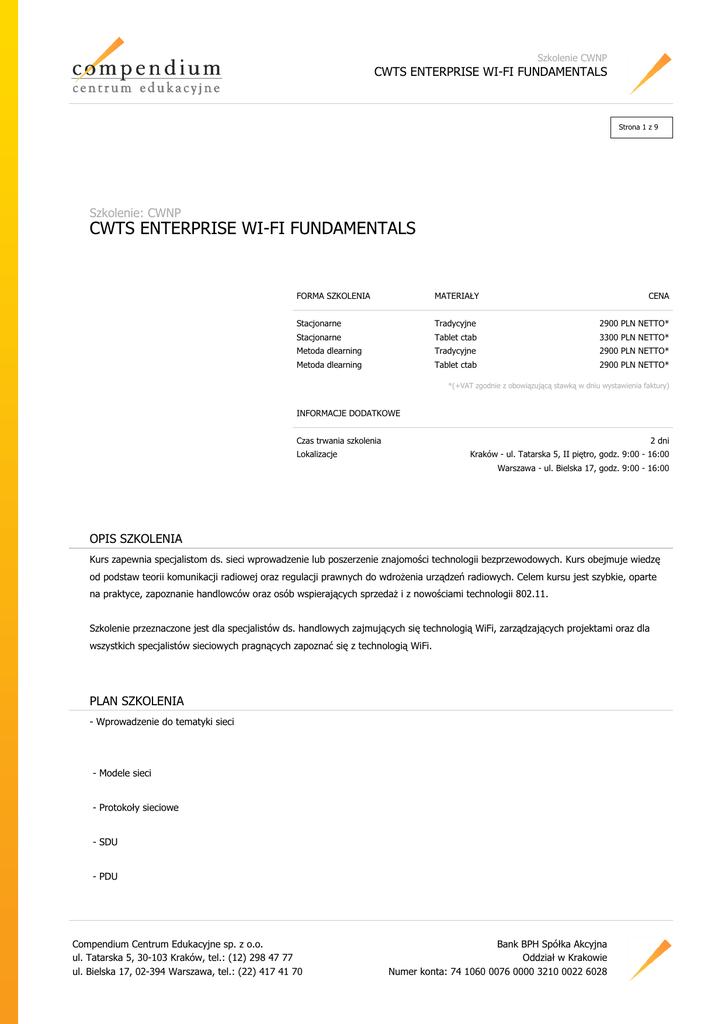 Szkolenie CWNP CWTS ENTERPRISE WI-FI FUNDAMENTALS Strona 1 z 9 Szkolenie: CWNP CWTS ENTERPRISE WI-FI FUNDAMENTALS FORMA SZKOLENIA MATERIAŁY CENA Stacjonarne Tradycyjne 2900 PLN NETTO* Stacjonarne Tablet ctab 3300 PLN NETTO* Metoda dlearning Tradycyjne 2900 PLN NETTO* Metoda dlearning Tablet ctab 2900 PLN NETTO* *(+VAT zgodnie z obowiązującą stawką w dniu wystawienia faktury) INFORMACJE DODATKOWE Czas trwania szkolenia 2 dni Lokalizacje Kraków - ul. Tatarska 5, II piętro, godz. 9:00 - 16:00 Warszawa - ul. Bielska 17, godz. 9:00 - 16:00 OPIS SZKOLENIA Kurs zapewnia specjalistom ds. sieci wprowadzenie lub poszerzenie znajomości technologii bezprzewodowych. Kurs obejmuje wiedzę od podstaw teorii komunikacji radiowej oraz regulacji prawnych do wdrożenia urządzeń radiowych. Celem kursu jest szybkie, oparte na praktyce, zapoznanie handlowców oraz osób wspierających sprzedaż i z nowościami technologii 802.11. Szkolenie przeznaczone jest dla specjalistów ds. handlowych zajmujących się technologią WiFi, zarządzających projektami oraz dla wszystkich specjalistów sieciowych pragnących zapoznać się z technologią WiFi. PLAN SZKOLENIA - Wprowadzenie do tematyki sieci - Modele sieci - Protokoły sieciowe - SDU - PDU Compendium Centrum Edukacyjne sp. z o.o. ul. Tatarska 5, 30-103 Kraków, tel.: (12) 298 47 77 ul. Bielska 17, 02-394 Warszawa, tel.: (22) 417 41 70 Bank BPH Spółka Akcyjna Oddział w Krakowie Numer konta: 74 1060 0076 0000 3210 0022 6028 Szkolenie CWNP CWTS ENTERPRISE WI-FI FUNDAMENTALS Strona 2 z 9 - OSI - "de facto" model referencyjny - Model siedmiowarstwowy - Sprzęt - warstwa - Mapowanie innych protokołów do modelu OSI - TCP/IP - model czterowarstwowy - Organizacje i standardy Wi-Fi - Kontrolerzy - IEEE - Wi-Fi Alliance - Łączność WLAN - Bezpieczeństwo sieci WLAN - WLAN QoS i tryb oszczędzania energii - Standard IEEE 802.11 - Rozszerzenia i propozycje standardów - 802.11-2007 - 802.11a/b/g - 802.11e/h/i - Propozycja standardu 802.11n Compendium Centrum Edukacyjne sp. z o.o. ul. Tatarska 5, 30-103 Kraków, tel.: (12) 298 47 77 ul. Bielska 17, 02-394 Warszawa, tel.: (22) 417 41 70 Bank BPH Spółka Akcyjna Oddział w Krakowie Numer konta: 74 1060 0076 0000 3210 0022 6028 Szkolenie CWNP CWTS ENTERPRISE WI-FI FUNDAMENTALS Strona 3 z 9 - Sprzęt i oprogramowanie Wi-Fi - Punkty dostępu - "Lightweight" - Autonomiczne - Rutery WLAN - Bridge WLAN - Repeatery WLAN - Kontrolery/przełączniki WLAN - AP przyłączane bezpośrednio - Rozproszone AP - Infrastruktura PoE - Urządzenia "Midspan" - Urządzenia "Endpoint" - Sprzęt i oprogramowanie klienta - Typy i zastosowanie anten - Bezpieczeństwo sieci Wi-Fi i zgodność z polityką bezpieczeństwa - Historyczne metody bezpieczeństwa 802.11 - Szyfrowanie - TKIP/CCMP - Uwierzytelnienie przez hasło oraz 802.1X/EAP - Standard personalny WPA/WPA2 Compendium Centrum Edukacyjne sp. z o.o. ul. Tatarska 5, 30-103 Kraków, tel.: (12) 298 47 77 ul. Bielska 17, 02-394 Warszawa, tel.: (22) 417 41 70 Bank BPH Spółka Akcyjna Oddział w Krakowie Numer konta: 74 1060 0076 0000 3210 0022 6028 Szkolenie CWNP CWTS ENTERPRISE WI-FI FUNDAMENTALS Strona 4 z 9 - Rozwiązania dla dużych i średnich firm WPA/WPA2-Enterprise - Konfiguracja WPS typu Pushbutton/PIN - Kontrola dostępu w oparciu o role (RBAC) - Bezpieczeństwo VPN - Wykrywanie włamań w sieciach radiowych "Wireless Intrusion" - Systemy zabezpieczające przed włamaniami (WIPS) - Zgodność z wymaganiami PCI - Zgodność z wymaganiami HIPAA - Wymuszanie zgodności - Pomiary sieci Wi-Fi - Zbieranie informacji i raportowanie - Podstawy planowania instalacji wielokanałowej "Multiple Channel Architecture" - Podstawy planowania instalacji jednokanałowej "Single Channel Architecture" - Prognozowanie zasięgu sieci radiowej "Predictive Site Survey" - Manualne pomiary sieci WiFi - Pomiary pasywne "Passive Survey" - Pomiary aktywne "Active Survey" - Sieci typu "Mesh" - Wykorzystanie analizatorów sieci - Protokół Compendium Centrum Edukacyjne sp. z o.o. ul. Tatarska 5, 30-103 Kraków, tel.: (12) 298 47 77 ul. Bielska 17, 02-394 Warszawa, tel.: (22) 417 41 70 Bank BPH Spółka Akcyjna Oddział w Krakowie Numer konta: 74 1060 0076 0000 3210 0022 6028 Szkolenie CWNP CWTS ENTERPRISE WI-FI FUNDAMENTALS Strona 5 z 9 - Pomiar - Spektrum - Identyfikacja i lokalizacja źródeł interferencji RF - Wi-Fi vs. non-Wi-Fi - Ograniczenia w lokalizacji sprzętu - Najlepsze praktyki w wykorzystaniu anten - Operacja sieci Wi-Fi - Zasięg, pokrycie i pojemność - Częstotliwości i kanały - Wykorzystanie kanałów i kolokacja - Skanowanie aktywne i pasywne - Oszczędzanie energii - Prędkości przesyłu danych i przepustowość - Dynamiczne dopasowanie prędkości przesyłu danych - Uwierzytelnianie i przyłączanie - System dystrybucyjny i roaming - Operacja w trybie infrastrukturalnym i "ad hoc" - BSSID oraz ESSID - Mechanizmy ochronne Compendium Centrum Edukacyjne sp. z o.o. ul. Tatarska 5, 30-103 Kraków, tel.: (12) 298 47 77 ul. Bielska 17, 02-394 Warszawa, tel.: (22) 417 41 70 Bank BPH Spółka Akcyjna Oddział w Krakowie Numer konta: 74 1060 0076 0000 3210 0022 6028 Szkolenie CWNP CWTS ENTERPRISE WI-FI FUNDAMENTALS Strona 6 z 9 - Aplikacje, wsparcie i diagnostyka - Instalacja i konfiguracja najczęściej wykorzystywanych typów sieci - Sieci domowe i biurowe (SOHO) - Rozszerzanie istniejących sieci do lokalizacji zdalnych - Połączenia międzybudynkowe - Publiczne sieci "hot spot" - Mobilne biuro, klasa, przemysł i opieka zdrowotna - Sieci municypalne i łączność dla organów ścigania/porządkowych - Dostęp do danych korporacyjnych i mobilność użytkowników - Dostęp ostatniej mili (WISP) - Sieci podkładowe - Rozpoznawanie i diagnostyka problemów sieci bezprzewodowych - Zmniejszona przepustowość - Niestabilne połączenia lub brak łączności - Niska moc sygnału - Uaktualnienia urządzeń - Procedury optymalizacji sieci Wi-Fi - Wybór urządzeń i ich rozmieszczenia