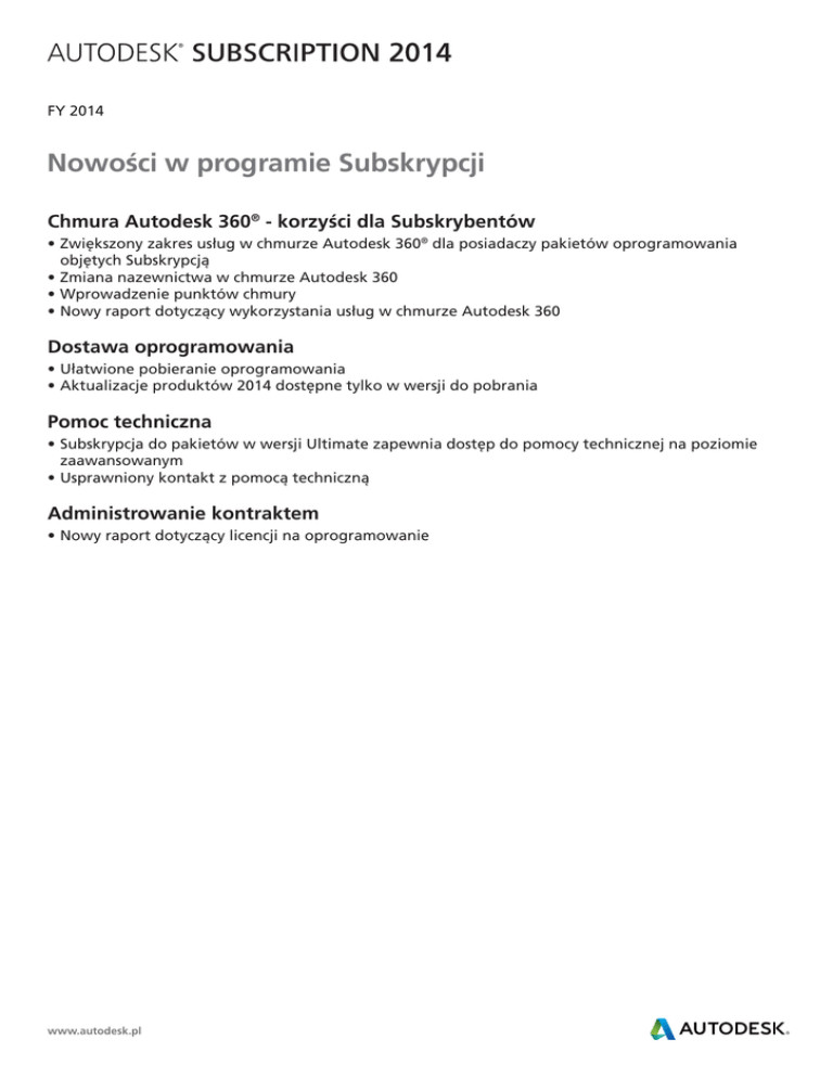 FY 2014 Nowości w programie Subskrypcji Chmura Autodesk 360® - korzyści dla Subskrybentów • Zwiększony zakres usług w chmurze Autodesk 360® dla posiadaczy pakietów oprogramowania objętych Subskrypcją • Zmiana nazewnictwa w chmurze Autodesk 360 • Wprowadzenie punktów chmury • Nowy raport dotyczący wykorzystania usług w chmurze Autodesk 360 Dostawa oprogramowania • Ułatwione pobieranie oprogramowania • Aktualizacje produktów 2014 dostępne tylko w wersji do pobrania Pomoc techniczna • Subskrypcja do pakietów w wersji Ultimate zapewnia dostęp do pomocy technicznej na poziomie zaawansowanym • Usprawniony kontakt z pomocą techniczną Administrowanie kontraktem • Nowy raport dotyczący licencji na oprogramowanie www.autodesk.pl Nowości w programie Subskrypcji Chmura Autodesk 360® – korzyści dla Subskrybentów Zwiększony zakres usług w chmurze Autodesk 360® dla posiadaczy pakietów oprogramowania objętych Subskrypcją W roku fiskalnym 2014 więcej pakietów objętych Subskrypcją zapewnia dostęp do usług w chmurze Autodesk. Usługa w chmurze Autodesk 360 Dostępna wraz z pakietem Wersja pakietu Optymalizacja dla Autodesk Inventor Autodesk® Factory Design Suite Autodesk® Building Design Suite Autodesk® Plant Design Suite Premium Ultimate Ultimate Autodesk® Green Building Studio® Autodesk® Infrastructure Design Suite Premium, Ultimate ® ® Pełen zakres usług dostępnych dla Subskrybentów opisuje Tabela Korzyści dostępna na stronie Centrum Subskrypcyjnego Zmiana nazewnictwa w chmurze Autodesk 360 W celu uproszczenia nazewnictwa w chmurze Autodesk 360, nazwy wybranych usług zostały zmienione. Stara nazwa Nowa nazwa Autodesk® 360 Infrastructure Modeler Autodesk® InfraWorks™ 360 Analiza energetyczna w chmurze Autodesk® 360 dla Autodesk® Revit® Analiza energetyczna dla Autodesk® Revit® Optymalizacja w chmurze Autodesk 360 dla Autodesk® Inventor® Optymalizacja dla Autodesk® Inventor® Renderowanie Autodesk® 360 Renderowanie Analiza konstrukcyjna w chmurze Autodesk® 360 dla Autodesk® Revit® Analiza konstrukcyjna www.autodesk.pl Nowości w programie Subskrypcji Wprowadzenie punktów chmury W roku fiskalnym 2014 wprowadzamy nowy, ulepszony model korzystania z usług w chmurze. „Jednostki chmury”, znane też jako „jobs”, zmienione zostały w „punkty chmury”. Punkty chmury to jednostki miary. Do wykonania konkretnych zadań w chmurze Autodesk 360, na przykład renderowania lub symulacji, konieczne jest posiadanie określonej ilości punktów chmury. Subskrybenci otrzymują 100 punktów chmury rocznie, do każdego produktu objętego Subskrypcją, niezależnie od jego rodzaju i wersji. Obecnie punkty chmury potrzebne są do korzystania z następujących usług w chmurze Autodesk 360: • Renderowanie • Autodesk InfraWorks 360 Ilość punktów chmury potrzebnych do skorzystania z tych usług jest różna w zależności od indywidualnych potrzeb Klienta. Zapewnia to bardziej elastyczny i adekwatny sposób korzystania z tej usługi i jej ostatecznych kosztów – Klient płaci tylko za tyle mocy obliczeniowej chmury, ile zużyje. Nowy raport dotyczący wykorzystania usług w chmurze Autodesk 360 Kierownicy Kontraktu i Koordynatorzy Oprogramowania mogą obecnie przeglądać raporty dotyczące zużycia punktów chmury i dowiedzieć się ile punktów chmury zużyto, a ile pozostało - w odniesieniu do całego kontraktu lub konkretnego użytkownika. Od dnia 12 kwietnia 2013 Kierownicy Kontraktu mogą kupować dodatkowe punkty chmury. Zakupu można dokonać z poziomu interfejsu Raport Zużycia lub za pośrednictwem normalnych kanałów sprzedaży. Raport ten jest dostępny po kliknięciu w link Administrowanie Kontraktem na stronie Centrum Subskrypcyjnego. www.autodesk.pl Nowości w programie Subskrypcji Dostawa oprogramowania Ułatwione pobieranie oprogramowania Firma Autodesk usprawniła metodę pobierania aplikacji, dzięki czemu Subskrybenci uzyskują do nich szybszy dostęp. Spośród trzech poniższych metod Klient może wybrać taką, która najbardziej mu odpowiada: • Pobierz teraz - opcja obsługiwana przez Menedżera Pobierania Autodesk. Tę opcję zalecamy większości użytkowników, ponieważ umożliwia szybsze pobieranie, zwiększony komfort użytkowania oraz dostęp do przydatnych przycisków, pozwalających w razie potrzeby wstrzymać i wznowić pobieranie. • Zainstaluj teraz (Nowość) – przy pomocy tej opcji można zaznaczyć do pobrania konkretne produkty i elementy i skrócić w ten sposób czas pobierania. Instalator Autodesk można uruchomić bezpośrednio z internetu, bez konieczności czekania na pobranie wszystkich plików. • Pobieranie przez przeglądarkę - tę opcję zalecamy tylko Klientom, którzy nie mogą, lub nie chcą instalować na swoim komputerze aplikacji do pobierania plików. Ta metoda jest wolniejsza i mniej niezawodna, ponieważ pliki są pobierane i rozpakowywane oddzielnie, w segmentach po 4 GB. W przypadku dodatkowych pytań, Klienci mogą odwiedzić Internetowe Centrum Rozwiązań Programu Subskrypcji, gdzie znajdą więcej informacji: www.autodesk.com/subscriptionhelp www.autodesk.pl Nowości w programie Subskrypcji Aktualizacje produktów 2014 dostępne tylko w wersji do pobrania Dla aktualizacji produktów wprowadzonych w roku fiskalnym 2014 podstawową metodą dostawy będzie pobranie, dlatego Subskrybenci w większości krajów otrzymają aktualizacje oprogramowania właśnie w tej formie. Co oznacza ta zmiana? 1. Nie trzeba czekać na przesyłkę z oprogramowaniem - Klient od razu ma bezpośredni dostęp do swoich nowych produktów. 2. Nie trzeba już wybierać metody dostawy (przesyłka lub pobranie online) w Centrum Subskrypcyjnym - zostaje ona automatycznie zaznaczona jako pobranie oprogramowania. 3. Jeśli Klient potrzebuje fizycznych kopii oprogramowania, może złożyć wniosek w Centrum Subskrypcyjnym - bez żadnych opłat dodatkowych. Dodatkowe informacje: Inte