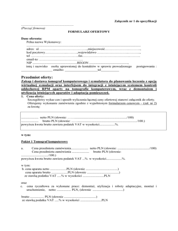 Załącznik nr 1 do specyfikacji ................................................................ (Pieczęć firmowa) FORMULARZ OFERTOWY Dane oferenta: Pełna nazwa Wykonawcy: ........................................................................................................................................... adres: ul. …………...………………………..,miejscowość………………….……….., kod pocztowy………………..……….,województwo ………………………..……….., tel ……………………………………..fax…………………………………….………. email-to: …………………………………. NIP ......................................................REGON ..............................................., imię i nazwisko osoby uprawnionej do kontaktów w sprawie prowadzonego postępowania : ___________________ emailto: ____________________tel___________ Przedmiot oferty: Zakup i dostawa tomograf komputerowego i symulatora do planowania leczenia z opcją wirtualnej symulacji oraz interfejsem do integracji z istniejącym systemem kontroli oddechowej RPM oparty na tomografie komputerowym, wraz z demontażem i utylizacją istniejących aparatów i adaptacją pomieszczeń. 1. Cena oferty: Szczegółowy wykaz cen i sposób wyliczenia łącznej ceny ofertowej stanowi załącznik do oferty. Oferujemy wykonanie zamówienia zgodnie z wypełnionym formularzem cenowym – (zał. nr 2) za kwotę: ..................... netto PLN (słownie: ……................................................................/100) ..................... brutto PLN (słownie: ……......................................................................../100.) powyższa kwota brutto zawiera podatek VAT w wysokości...................%. w tym: Pakiet 1 Tomograf komputerowy Cena przedmiotu zamówienia..................... netto PLN (słownie: ......................................./100) Cena przedmiotu zamówienia ..................... brutto PLN (słownie: ................................./100.) powyższa kwota brutto zawiera podatek VAT ...% w wysokości...................%. a. w tym: b. cena aparatu netto ....................PLN (słownie .......................................) cena aparatu brutto ....................PLN (słownie .......................................) ze stawką podatku VAT .....% w wysokości ..........................PLN oraz c. cena ryczałtowa za wykonane prace: demontaż, utylizacja i roboty adaptacyjne, montaż i uruchomienie, netto: ................. PLN, (słownie .....................................) brutto ................. PLN (słownie .......................................) ze stawką podatku VAT .....% w wysokości ..........................PLN Pakiet 2 Symulator do planowania leczenia z opcją wirtualnej symulacji oraz interfejsem do integracji z istniejącym systemem kontroli oddechowej RPM oparty na tomografie komputerowym Cena przedmiotu zamówienia..................... netto PLN (słownie: ......................................./100) Cena przedmiotu zamówienia ..................... brutto PLN (słownie: ................................./100.) powyższa kwota brutto zawiera podatek VAT ...% w wysokości...................%. a. w tym: b. cena aparatu netto ....................PLN (słownie .......................................) cena aparatu brutto ....................PLN (słownie .......................................) ze stawką podatku VAT .....% w wysokości ..........................PLN oraz c. cena ryczałtowa za wykonane prace: demontaż, utylizacja i roboty adaptacyjne, montaż i uruchomienie netto: ................. PLN, (słownie .....................................) brutto ................. PLN (słownie .......................................) ze stawką podatku VAT .....% w wysokości ..........................PLN 2. Wymagane oświadczenia i dokumenty wymienione w SIWZ. Dla wykazania wiarygodności ekonomicznej i technicznej naszej firmy oraz doświadczenia i praktyki w zakresie stanowiącym przedmiot niniejszego przetargu, przedkładamy oświadczenia i dokumenty wymagane w specyfikacji istotnych warunków zamówienia. 3. Potwierdzenie spełnienia wymogów dotyczących przedmiotu zamówienia. Zapewniamy, że oferowane przez nas przedmiot zamówienia posiadają odpowiednią jakość i właściwości użytkowe dopuszczające do stosowania w placówkach ochrony zdrowia. 4. Warunki płatności. Termin zapłaty w ciągu 30 dni licząc od dnia otrzymania faktury przez zamawiającego. 1. Termin gwarancji i rękojmi na aparaty wynosi ……….. m-cy. Minimalny okres gwarancji na zrealizowany przedmiot zamówienia tj. na tomograf komputerowego (pakiet 1) – 36 miesięcy i symulatora do planowania leczenia (pakiet 2) – 12 miesięcy, liczony od momentu zrealizowania i dokonania jego protokolarnego odbioru (podpisanie protokołu zdawczoodbiorczego). W okresie gwarancji wymaga się prowadzenie nieodpłatnego serwisu zamontowanych urządzeń. Oświadczamy, iż pozostałe warunki gwarancji obejmują: 1. Okres gwarancji zostaje przedłużony o czas naprawy urządzeń – przedmiotu zamówienia w przypadku naprawy trwającej powyżej 5 dni roboczych, liczonych od momentu pisemnego (również faksem) zgłoszenia awarii (usterki) do momentu jej usunięcia, 2. Czas reakcji serwisu od zgłoszenia awarii: max 48 godzin. W przypadku niedotrzymania powyższego terminu Zamawiający może naliczyć Wykonawcy karę umowną w wysokości 0,1 % wartości netto zamówienia, określonej w § 1 ust. 2 lit. b niniejszej umowy. Powyższe terminy dotyczą dni roboczych: od poniedziałku do piątku z wyłączeniem dni wolnych od pracy 3. Wykonawcy zobowiązuje się naprawić uszkodzone urządzenia – przedmiot zamówienia w terminie do 5 dni roboczych od momentu otrzymania zgłoszenia do naprawy, a w przypadku konieczności sprowadzania części spoza granic Polski – do 10 dni roboczych. W przypadku niedotrzymania termin