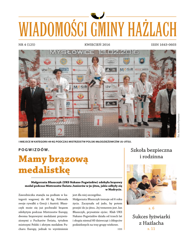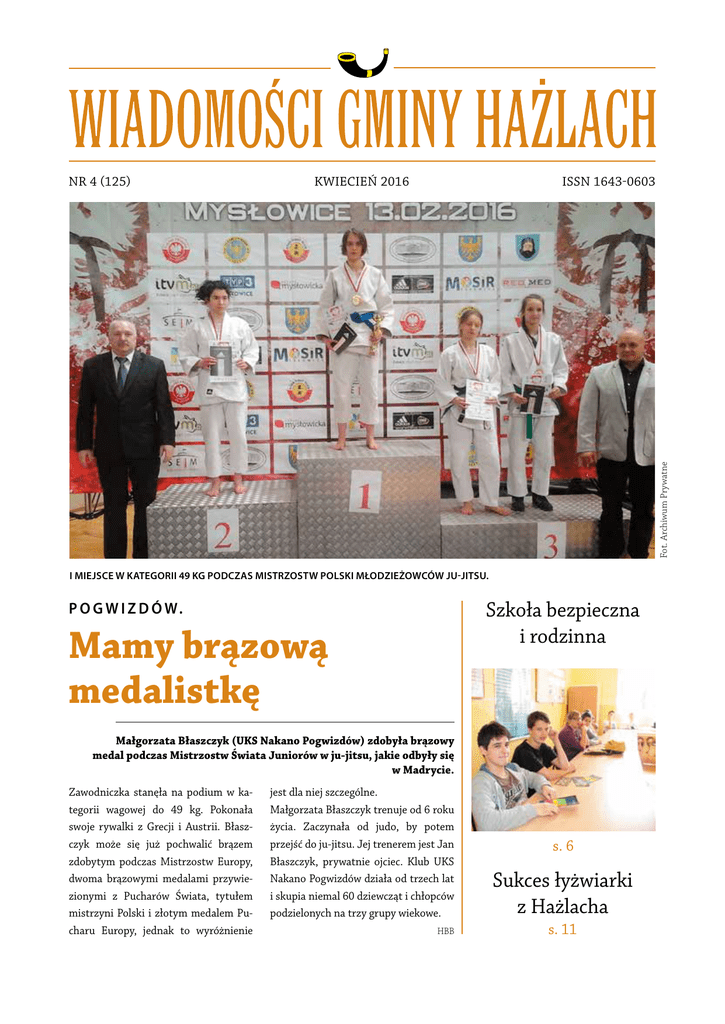 KWIECIEŃ 2016 ISSN 1643-0603 Fot. Archiwum Prywatne NR 4 (125) I MIEJSCE W KATEGORII 49 KG PODCZAS MISTRZOSTW POLSKI MŁODZIEŻOWCÓW JU-JITSU. Szkoła bezpieczna i rodzinna P O G W I Z D Ó W. Mamy brązową medalistkę Małgorzata Błaszczyk (UKS Nakano Pogwizdów) zdobyła brązowy medal podczas Mistrzostw Świata Juniorów w ju-jitsu, jakie odbyły się w Madrycie. Zawodniczka stanęła na podium w kategorii wagowej do 49 kg. Pokonała swoje rywalki z Grecji i Austrii. Błaszczyk może się już pochwalić brązem zdobytym podczas Mistrzostw Europy, dwoma brązowymi medalami przywiezionymi z Pucharów Świata, tytułem mistrzyni Polski i złotym medalem Pucharu Europy, jednak to wyróżnienie jest dla niej szczególne. Małgorzata Błaszczyk trenuje od 6 roku życia. Zaczynała od judo, by potem przejść do ju-jitsu. Jej trenerem jest Jan Błaszczyk, prywatnie ojciec. Klub UKS Nakano Pogwizdów działa od trzech lat i skupia niemal 60 dziewcząt i chłopców podzielonych na trzy grupy wiekowe. HBB s. 6 Sukces łyżwiarki z Hażlacha s. 11 S P OŁ E CZ E Ń S T WO Warsztaty florystyczne dla małych i dużych W Kończycach Wielkich i Pogwizdowie odbyły się wielkanocne warsztaty florystyczne. Pierwsze adresowane były do dzieci z całej gminy. Uczestnicy pod okiem Katarzyny Warzechy przygotowali stroiki wielkanocne w kształcie bukszpanowych drzewek. Tydzień później dorośli szykowali wielkanocne wianki na świąteczny stół. Pomagała im w tym Joanna Mazurek. KO Ń C Z YC E W I E L K I E. Powiatowy Konkurs Frazeologiczny „Tęga głowa” Kończyckie gimnazjum zorganizowało po raz pierwszy na szczeblu powiatowym Konkurs Frazeologiczny „Tęga głowa”. Wydarzenie miało miejsce 23 marca. Gościem honorowym był Wójt Gminy Hażlach Grzegorz Sikorski. W konkursie zmierzyli się ze sobą uczniowie z gimnazjów z Pogwizdowa, Kończyc Wielkich, Dębowca, Strumienia, Zebrzydowic, Kaczyc i Gimnazjum nr 2 w Cieszynie. WYNIKI: Rozgrywki indywidualne: 1. Mikołaj Szczypka – Gimnazjum im. Gabrieli hr. Thun-Hohenstein w Kończycach Wielkich 2. Ewa Gaszczyk – Gimnazjum w Kaczycach 3. Natalia Bijok – Gimnazjum w Kaczycach Rozgrywki drużynowe: 1. Gimnazjum w Pogwizdowie 2. Gimnazjum im. Gabrieli hr. Thun-Hohenstein w Kończycach Wielkich 3. Gimnazjum w Kaczycach W przerwie między kolejnymi etapami grupa kończyckich uczniów zaprezentowała program artystyczny o życiu i działalności patronki szkoły Gabrieli Thun–Hohenstein, a szkolny 2 KONKURS FRAZEOLOGICZNY NA SZCZEBLU POWIATOWYM ODBYŁ SIĘ W KOŃCZYCACH WIELKICH PO RAZ PIERWSZY. chór wykonał kilka piosenek. W tym czasie nauczyciele, którzy przyjechali z uczniami, zostali poproszeni o ocenę prac. Zwycięzcy otrzymali cenne nagrody książkowe. Wszystkim zwycięzcom gratulujemy i zapraszamy znów za rok. Nadesłała Małgorzata Banot Wiadomości Gminy Hażlach Anna Chwolek CZŁONEK KOMISJI REWIZYJNEJ CZŁONEK KOMISJI OŚWIATY I KULTURY CZŁONEK KOMISJI KOMUNALNEJ I ROZWOJU GOSPODARCZEGO Data i miejsce urodzenia: 19 października 1967 r. w Zebrzydowicach Miejsce zamieszkania: Kończyce Wielkie Zawód: sekretarz Gimnazjum im. G. Thun-Hohenstein w Kończycach Wielkich Kontakt przez Biuro Rady Gminy w Urzędzie Gminy w Hażlachu Twój R A D N Y S P OŁ E CZ E Ń S T WO Jako radnej Gminy Hażlach zależy mi w szczególności na wyrównywaniu szans edukacyjnych dzieci i młodzieży. Chciałabym aby nasze szkoły i przedszkola były bezpieczne i dobrze wyposażone, żeby mogły przyjąć wszystkie dzieci, a młodzież nie odchodziła do placówek poza gminę. Uważam, że pozyskiwanie środków zewnętrznych na polepszenie bazy edukacyjnej, sportowej i kulturalnej stanowi bardzo ważny element w rozwoju każdego sołectwa. Popieram każdą inicjatywę z tym związaną oraz te, które mają na celu poprawę życia mieszkańców Gminy. Złoty Klucz dla radnego Piotr Trzaskalski, radny Gminy Hażlach, został wyróżniony tytułem „Samorządowiec Roku”. Konkurs co roku organizują Oficyna Wydawnicza Regiony oraz Stowarzyszenie Dziennikarzy RP. Konkurs przeprowadzany jest na szczeblu miejskim, gminnym i powiatowym. Piotr Trzaskalski jest radnym pierwszej kadencji z Pogwizdowa. W Radzie Gminy pełni funkcję zastępcy przewodniczącego Komisji Rewizyjnej. Jest też członkiem Komisji Komunalnej i Rozwoju Gospodarczego. Nowe władze OSP Kontynuując temat z poprzedniego numeru „Wiadomości Gminy Hażlach”, podajemy władze wyłonione podczas tegorocznych zebrań sprawozdawczo-wyborczych w pozostałych jednostkach Ochotniczej Straż Pożarnej z terenu gminy Hażlach, to jest w Brzezówce, Kończycach Wielkich, Pogwizdowie i Rudniku. Wcześniej zaprezentowano skład zarządów i komisji rewizyjnych OSP Hażlach i OSP Zamarski. OSP Brzezówka: Jan Wawrzyczek - prezes, Marek Foltyn wiceprezes-naczelnik, Wiesław Karas - wiceprezes, Andrzej Kubicius - zastępca naczelnika, Rafał Machej - sekretarz, Leszek Spandel - skarbnik, Henryk Kałuża - gospodarz. Komisja Rewizyjna: Karol Żyła - przewodniczący, Józef Kwiczala - członek komisji, Arkadiusz Karas - członek komisji. OSP Kończyce Wielkie: Krzysztof Czakon - prezes, Krzysztof Kuchejda - wiceprezes-naczelnik, Mateusz Parchański - wiceprezes, Damian Czakon - zastępca naczelnika, Marcin Olszowy - sekretarz, Janusz Sztuchlik - skarbnik, Andrzej Czakon - gospodarz, Władysław Brachaczek - członek zarządu, kwiecień 2016 Mirosław Olszowy - członek zarządu, Dariusz Król - członek zarządu. Komisja Rewizyjna: Marian Morawiec - przewodniczący, Janusz Podżorski - sekretarz komisji, Jarosław Czyż członek komisji. OSP Pogwizdów: Adam Budziński - prezes, Mariusz Kunc wiceprezes-naczelnik, Przemysław Worek - wiceprezes, Lucjan Grzybek - zastępca naczelnika, Marek Tolasz - sekretarz, Zbigniew Wiater - skarbnik, Tomasz Pagieła - gospodarz, Stanisław Pieczonka - kronikarz, Robert Pillich - członek zarządu, Jan Grzybek - członek zarządu, Przemysław Borowian - cz