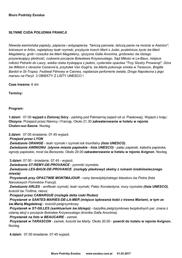 Biuro Podróży Exodus SŁYNNE CUDA POŁUDNIA FRANCJI Niewola awiniońska papieży, papierze i antypapierze, "tańczą panowie, tańczą panie na moście w Awinion", koloseum w Arles, największy teatr rzymski, przybycie trzech Marii z Judei, pustelnicze życie św.Marii Magdaleny, grób i czaszka św.Marii Magdaleny, ojczyzna Galla Anonima, grobowiec św.Idziego przywracający płodność, cudowne poczęcie Bolesława Krzywoustego, Sąd Miłości w Le-Baux, miejsce miłości Petrarki do Laury, wielka rzeka tryskająca z jaskini, cysterskie opactwa "Trzy Siostry Prowansji", Góra św.Wiktorii z obrazów Cezanne'a, przytułek Van Gogh'a, św.Marta pokonuje smoka w Tarascon, Brigitte Bardot w St-Tropez, Festiwal Filmowy w Cannes, najstarsze perfumerie świata, Droga Napoleona z jego marszu na Paryż 3 OBIEKTY Z LISTY UNESCO ! Czas trwania: 6 dni Terminy: Program: 1.dzień: 07.00 wyjazd z Zielonej Góry - parking pod Palmiarnią (wjazd od ul. Piaskowej). Wyjazd z kraju: Olszyna. Przejazd przez Niemcy i Francję. Około 21.30 zakwaterowanie w hotelu w rejonie Chalon-sur-Saone. Nocleg. 2.dzień: 07.00 śniadanie. 07.45 wyjazd. Przejazd przez LYON Zwiedzanie ORANGE - teatr rzymski i rzymski łuk triumfalny (lista UNESCO). Zwiedzanie AWINIONU (słynne miasto papieskie - lista UNESCO) - pałac papieski, katedra papieska, ogrody papieskie, most św.Benezeta. Około 20.00 zakwaterowanie w hotelu w rejonie Avignon. Nocleg. 3.dzień: 07.00 - śniadanie. 07.45 - wyjazd. Zwiedzanie ST-REMY-DE-PROVANCE - pomniki rzymskie. Zwiedzanie LES-BAUX-DE-PROVANCE (rozległy płaskowyż skalny z ruinami średniowiecznego miasta) Przystanek przy OPACTWIE MONTMAJOUR - ruiny benedyktyńskiego klasztoru św.Piotra (lista Narodowych Pomników Francji). Zwiedzanie ARLES - amfiteatr rzymski, teatr rzymski, Pałac Konstantyna, mury rzymskie (lista UNESCO), kościół św.Trofima, ratusz. Przejazd przez CAMARGUE (rozległa delta rzeki Rodan) Przystanek w SANTES-MARIES-DE-LA-MER (miejsce lądowania łodzi z trzema Mariami, w tym ze św.Marią Magdaleną) - kościół pielgrzymkowy. Przystanek w ST-GILLES (sanktuarium św.Idziego) - bazylika pielgrzymkowa bezpłodnych par, znana z udanej akcji o poczęcie Bolesław Krzywoustego (kronika Galla Anonima). Przystanek na foto w BEAUCAIRE - zamek. Przystanek w TARASCON - zamek, kościół św.Marty. Około 20.00 - powrót do hotelu w rejonie Avignon. Nocleg. 4.dzień: 07.00 śniadanie. 07.45 wyjazd. Biuro Podróży Exodus www.exodus.com.pl 01.03.2017 Zwiedzanie FONTAINE-DE-VAUCLUSE (miejsce miłości Petrarki do Laury) - fontannowe źródło rzeki Sorgue, najbardziej imponujące i obfite we Francji. Przystanek w SENANQUE (romańskie opactwo benedyktynów - jedna z"Trzech Sióstr Prowansji") Przejazd przez GORDES (malownicze średniowieczne miasteczko na szczycie wzgórza) Przystanek w ROUSSILLON - bajkowe formacje skalne w kolorze ochry. Przystanek w SILVACANE ( romańskie opactwo benedyktynów - jedna z"Trzech Sióstr Prowansji") Przystanek w AIX-EN-PROVENCE - aleja Cours Mirabeau, katedra św.Sewera. Przystanek w ST-MAXIMIN-LA-STE-BAUME - bazylika z grobem i relikwiarzem św.Marii Magdaleny. Przystanek w LE THORONET (romańskie opactwo benedyktynów - jedna z"Trzech Sióstr Prowansji"). Przystanek na foto w GRIMAUD - malownicza ruina średniowiecznego zamku. Spacer po ST-TROPEZ (słynny kurort gwiazd: Gerard Phillipe, Brigitte Bardot) port jachtowy, stare miasto. Około 21.00 zakwaterowanie w hotelu w rejonie Cannes. Nocleg. 5.dzień: 07.00 śniadanie. 07.45 - wyjazd. Spacer po CANNES (głowny kurort nadmorski Lazurowego Wybrzeża) Promenada Croisette, pałac festiwalowy słynnego festiwalu filmowego, aleja gwiazd, luksusowe hotele. Przejazd DROGĄ NAPOLEONA (trasa marszu cesarza na Paryż po ucieczce z wyspy Elby): - przystanek w GRASSE (światowa ojczyzna kosmetyków) - wizyta w jednej z najstarszych fabryk perfum na świecie, z możliwością zakupów. - przejazd przez CASTELLANE (malownicze miasteczko u wrót kanionu VERDON) - przejazd przez DIGNE-LES-BAINS (malownicze uzdrowisko termalne) - przejazd przez SISTERON (strategiczne miasto z wielką cytadelą) - przystanek w CORPS - jezioro zaporowe w skalistym kanionie. - przejazd przez GRENOBLE Około 21.00 - zakwaterowanie w hotelu w rejonie Genewy. Nocleg. 6.dzień: 07.00 - śniadanie. 07.45 - wyjazd. Wjazd do Szwajcarii. Spacer po GENEWIE - promenada nad jeziorem Genewskim, fontanna, stare miasto. Przejazd brzegami jezior: GENEWSKIEGO, NEUCHATEL i BIELER Przejazd przez Szwajcarię i Niemcy. Wjazd do kraju: Olszyna. Około 03.00 rozwiązanie imprezy w Zielonej Górze parking pod Palmiarnią. W cenie: autokar: wysokopokładowy, klimatyzacja, WC, video, napoje zimne i gorące (płatne) około 3800 km. noclegi: 5 x hotele kat.turystycznej - pokoje 2,3osobowe z łaz/WC. wyżywienie: 5 śniadań kontynentalnych. pilot BP EXODUS. ubezpieczenie NW, KL, bagaż. podatek VAT Dodatkowe opłaty: wstępy do obiektów turystycznych - około Uwaga: przy długich przejazdach autokar zatrzymuje się na 15-minutowe postoje każdorazowo po około 4-godzinnej jeździe. Nie bierzemy odpowiedzialności za punkty programu nie zrealizowane z przyczyn obiektywnych. Biuro Podróży Exodus www.exodus.com.pl 01.03.2017
