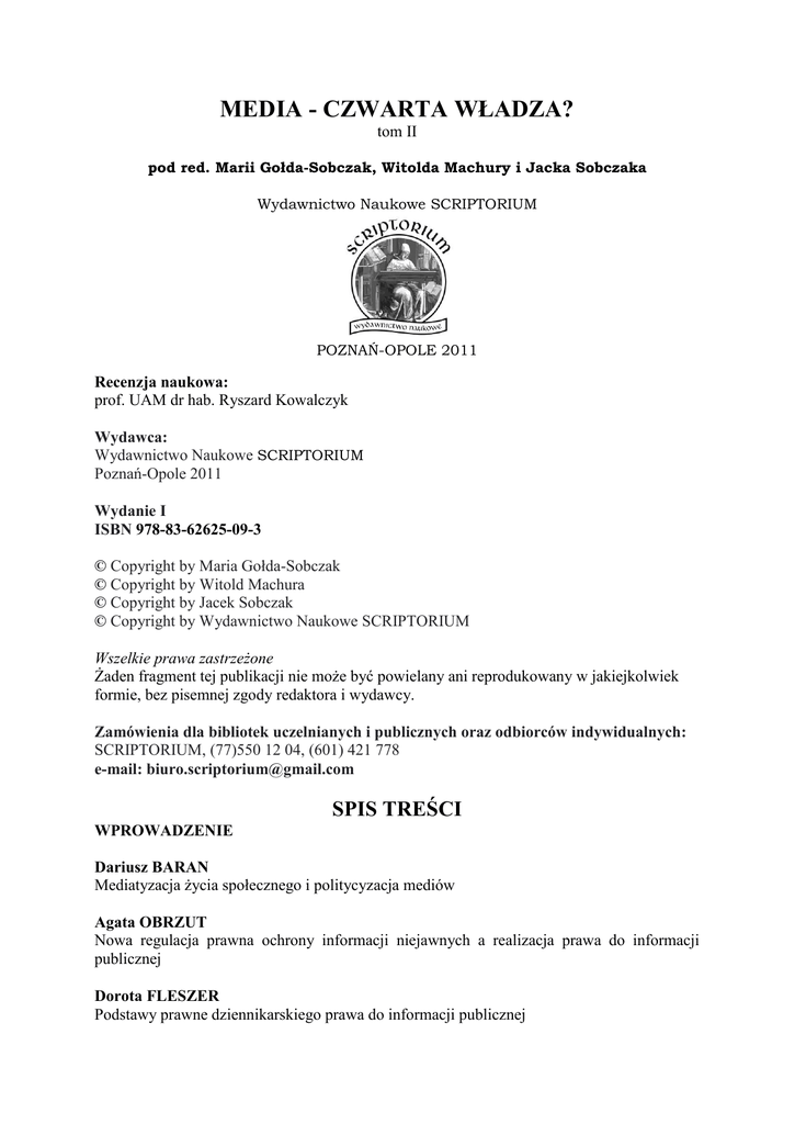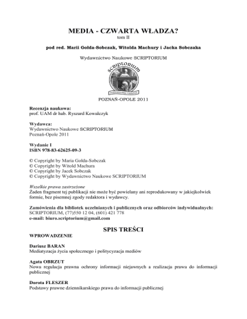 MEDIA - CZWARTA WŁADZA? tom II pod red. Marii Gołda-Sobczak, Witolda Machury i Jacka Sobczaka Wydawnictwo Naukowe SCRIPTORIUM POZNAŃ-OPOLE 2011 Recenzja naukowa: prof. UAM dr hab. Ryszard Kowalczyk Wydawca: Wydawnictwo Naukowe SCRIPTORIUM Poznań-Opole 2011 Wydanie I ISBN 978-83-62625-09-3 © Copyright by Maria Gołda-Sobczak © Copyright by Witold Machura © Copyright by Jacek Sobczak © Copyright by Wydawnictwo Naukowe SCRIPTORIUM Wszelkie prawa zastrzeżone Żaden fragment tej publikacji nie może być powielany ani reprodukowany w jakiejkolwiek formie, bez pisemnej zgody redaktora i wydawcy. Zamówienia dla bibliotek uczelnianych i publicznych oraz odbiorców indywidualnych: SCRIPTORIUM, (77)550 12 04, (601) 421 778 e-mail: [email protected] SPIS TREŚCI WPROWADZENIE Dariusz BARAN Mediatyzacja życia społecznego i politycyzacja mediów Agata OBRZUT Nowa regulacja prawna ochrony informacji niejawnych a realizacja prawa do informacji publicznej Dorota FLESZER Podstawy prawne dziennikarskiego prawa do informacji publicznej Michał DROŻDŻ Medialna władza nad wartościami Maria GOŁDA-SOBCZAK Dylematy tajemnicy dziennikarskiej Radosław WOJTECZEK Publikacja sprostowań i odpowiedzi - ustawowy obowiązek ingerujący w wolność mediów czy przejaw ich odpowiedzialności? Analiza prawno-etyczna Ksenia KAKAREKO Prawo do prywatności a wolność słowa i prasy Małgorzata LASKOWSKA Infotainment-analiza aksjologiczno-etyczna zjawiska Maciej KRZYSZTOSZEK Polityka a wolność słowa we włoskim sektorze telewizyjnym Krzysztof FLASIŃSKI Techniki moderacji zachowań użytkowników serwisu internetowego gazety lokalnej Natalia KOŃ Rola mediów w polityce Katarzyna GIEREŁO-KLIMASZEWSKA Wybory prezydenckie 2010 w internecie - PR czy propaganda? Autoprezentacja głównych aktorów politycznych Monika KACZMAREK-ŚLIWIŃSKA Media relations w erze social media Elwira Anna BONISŁAWSKA Copywriting, public relations i dziennikarstwo Katarzyna WITKOWSKA-ROZPARA Etyczne aspekty posługiwania się przez środki masowego przekazu informacją o przestępczości Katarzyna ŻYSZKIEWICZ Problemy z anonimowością w dziennikarstwie społecznym Witold MACHURA Weryfikacja informacji źródłowych w świetle wybranych artykułów prasowych Paulina OLECHOWSKA Prasa regionalna w serwisach społecznościowych - wybrane przykłady Magdalena ZDRENKA-CIAŁKOWSKA Współczesny plakat a odpowiedzialność ( nie tylko) wizualna Joanna JONCZEK Polityczna Poprawność - w obronie wolności, czy przeciwko niej? Andrzej OSTROWSKI Telewizja jako imperium XXI wieku. Dylematy i zagrożenia Piotr PAŁASZEWSKI Przekaz medialny a rzeczywistość stadionowa. Rozważania nt. wizerunku kibica piłkarskiego” Adrianna ADAMEK-ŚWIECHOWSKA „Skazy, zadry i szczerby”... Media w sporze o Sienkiewicza w kanonie szkolnym Jolanta JASIŃSKA-MRUKOT Nierzeczywisty obraz ubóstwa w mediach Jacek WOJCIECHOWSKI Wybrane aspekty prawne dotyczące granic wolności mediów w kontekście obowiązywania ciszy wyborczej Stefan KUBÓW Problem odpowiedzialności bibliotek akademickich za przekaz informacji naukowej Witold RYNKIEWICZ Wolność a odpowiedzialność mediów w sytuacjach zagrożeń bezpieczeństwa Piotr BIELAWSKI Katarzyna GIEREŁO-KLIMASZEWSKA Public Relations - ważna dziedzina zarządzania Anna DĄBROWSKA Edukacja medialna w warszawskich szkołach podstawowych Lucyna SZOT Złożone uwarunkowania kryptoreklamy Jacek SOBCZAK Wolność ekspresji w sztuce NOTY O AUTORACH