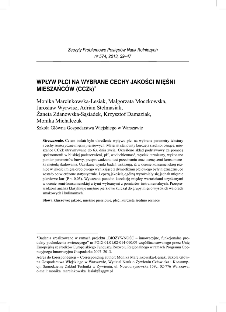 Zeszyty Problemowe Postępów Nauk Rolniczych nr 574, 2013, 39–47 WPŁYW PŁCI NA WYBRANE CECHY JAKOŚCI MIĘŚNI MIESZAŃCÓW (CCZk)* Monika Marcinkowska-Lesiak, Małgorzata Moczkowska, Jarosław Wyrwisz, Adrian Stelmasiak, Żaneta Zdanowska-Sąsiadek, Krzysztof Damaziak, Monika Michalczuk Szkoła Główna Gospodarstwa Wiejskiego w Warszawie Streszczenie. Celem badań było określenie wpływu płci na wybrane parametry tekstury i cechy sensoryczne mięśni piersiowych. Materiał stanowiły kurczęta średnio rosnące, mieszańce CCZk utrzymywane do 63. dnia życia. Określono skład podstawowy za pomocą spektrometrii w bliskiej podczerwieni, pH, wodochłonność, wyciek termiczny, wykonano pomiar parametrów barwy, przeprowadzono test przecinania oraz ocenę semi-konsumencką metodą skalowania. Uzyskane wyniki badań wskazują, iż w ocenie konsumenckiej różnice w jakości mięsa drobiowego wynikające z dymorfizmu płciowego były nieznaczne, co zostało potwierdzone statystycznie. Lepszą jakością ogólną wyróżniały się jednak mięśnie piersiowe kur (P < 0,05). Wykazano ponadto korelację między wartościami uzyskanymi w ocenie semi-konsumenckiej a tymi wybranymi z pomiarów instrumentalnych. Przeprowadzona analiza klasyfikuje mięśnie piersiowe kurcząt do grupy mięs o wysokich walorach smakowych i kulinarnych. Słowa kluczowe: jakość, mięśnie piersiowe, płeć, kurczęta średnio rosnące *Badania zrealizowano w ramach projektu „BIOŻYWNOŚĆ – innowacyjne, funkcjonalne produkty pochodzenia zwierzęcego” nr POIG.01.01.02-014-090/09 współfinansowanego przez Unię Europejską ze środków Europejskiego Funduszu Rozwoju Regionalnego w ramach Programu Operacyjnego Innowacyjna Gospodarka 2007–2013. Adres do korespondencji – Corresponding author: Monika Marcinkowska-Lesiak, Szkoła Główna Gospodarstwa Wiejskiego w Warszawie, Wydział Nauk o Żywieniu Człowieka i Konsumpcji, Samodzielny Zakład Techniki w Żywieniu, ul. Nowoursynowska 159c, 02-776 Warszawa, e-mail: [email protected] 40 M. Marcinkowska-Lesiak, M. Moczkowska, J. Wyrwisz i inni WSTĘP Jakość mięsa stanowi wypadkową wielu właściwości, takich jak tekstura, barwa, soczystość, wodochłonność oraz wartość odżywcza, która determinowana jest przede wszystkim zawartością pełnowartościowego białka. Cecha ta w połączeniu z wysoką zawartością nienasyconych kwasów tłuszczowych, niższą zawartością tkanki łącznej i kolagenu w mięsie drobiowym może świadczyć o jego wysokich wartościach dietetycznych [Kijowski 2000]. Mięso drobiowe jest również dobrym źródłem składników mineralnych, takich jak: potas, wapń, fosfor, sód oraz żelazo [Rachwał 2006]. Charakteryzuje je krótki czas przygotowania, relatywnie niska cena oraz wysokie walory smakowo-zapachowe. W związku z tym stanowi bardzo popularny produkt poszukiwany przez konsumentów. Duża dostępność mięsa drobiowego jako surowca, szybki rozwój technologii jego przetwórstwa, systemów pakowania, a także różnorodność form kulinarnych przekłada się na wzrost jego zapotrzebowania [Nowak i Trziszka 2010]. Jakość mięsa drobiowego może być zmienna w zależności od pochodzenia ptaków (wolno, średnio, szybko rosnące), systemu ich utrzymania (intensywny, półintensywny, ekologiczny), sposobu żywienia, wieku, płci oraz postępowania w trakcie uboju [Doktor 2007a, Pietrzak i in. 2013]. Wielokrotnie udowodniono, że intensywna selekcja ukierunkowana na wzrost i pozostałe cechy związane z użytkowością mięsną przyczyniają się do pogorszenia jakości mięsa kurcząt pomimo poprawy opłacalności produkcji [Horsted i in. 2005, Katogianni i in. 2008, Eleroğlu i in. 2013, Pietrzak i in. 2013]. Katogianni i inni [2008] oraz Corzo i inni [2009] zwrócili również uwagę na negatywny wpływ intensywnego utrzymania i jednostronnego żywienia mieszankami pełnoporcjowymi na jakość uzyskiwanego mięsa. Niewiele prac poświęcono jednak wpływom płci na poszczególne cechy kształtujące ogólną jakość mięsa kurcząt. Ze względu na fakt, iż w użytkowaniu mięsnym do odchowu przeznacza się wszystkie zdrowe pisklęta zrozumiałe jest, że w przeciętnym kurniku proporcja płci jest bliska 1:1. Koguty i kury różnią się tempem wzrostu, składem tkankowym ciała [Michalczuk i in. 2012, Połtowicz i Doktor 2012], a przede wszystkim gospodarką hormonalną organizmu [Sirri i in. 2009]. Można więc przypuszczać, że różnice te nie są obojętne i mogą mieć wpływ na właściwości teksturalne i senoryczne mięśni. W celu potwierdzenia tych założeń przeprowadzono badania obejmujące porównanie wybranych cech jakościowych mięśni piersiowych pomiędzy kogutami a kurami. Ponadto, ze względu na doniesienia o pogarszającej się jakości mięśni kurcząt szybko rosnących, doświadczeniem objęto kurczęta charakteryzujące się pośrednim tempem wzrostu (CCzk). MATERIAŁ I METODY Materiał stanowiły mieszańce Cobb 500 × (Cobb 500 × Zk) (CCZk) (1000 kogutów i 1000 kur) utrzymywane do 63. dnia życia. Kurczęta obu płci żywiono i utrzymywano w jednakowych warunkach. Procedury doświadczenia zostały przeprowadzone zgodnie z numerem nadania zgody komisji etycznej 27/2009 z dnia 16 kwietnia 2009 roku. Po Zeszyty Problemowe Postępów Nauk Rolniczych Wpływ płci na wybrane cechy jakości mięśni mieszańców (CCZk) 41 zakończeniu odchowu do uboju wybrano 20 kogutów i 20 kur o masie ciała średniej dla płci. Tuszki poddano uproszczonej analizie dysekcyjnej według Ziołeckiego i Doruchowskiego [1989]. Podczas dysekcji wypreparowano mięśnie piersiowe, które wykorzystano do oznaczeń cech jakościowych na podstawie metod instrumentalnych oraz oceny semi-konsumenckiej, określając: – zawartość wody, białka, tłuszczu i popiołu za pomocą spektrofotometru w bliskiej podczerwieni NIR Flex N-500 firmy Büchi. Pomiaru dokonano przy zastosowaniu modułu NIRFlex Solids w 