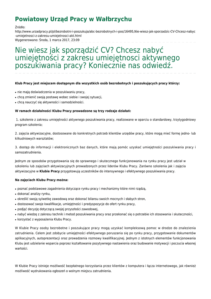Powiatowy Urząd Pracy w Wałbrzychu Źródło: http://www.urzadpracy.pl/pl/bezrobotni-i-poszukuja/abc-bezrobotnych-i-pos/16495,Nie-wiesz-jak-sporzadzic-CV-Chcesz-nabyc -umiejetnosci-z-zakresu-umiejetnosci-akt.html Wygenerowano: Środa, 1 marca 2017, 23:09 Nie wiesz jak sporządzić CV? Chcesz nabyć umiejętności z zakresu umiejętnosci aktywnego poszukiwania pracy? Koniecznie nas odwiedź. Klub Pracy jest miejscem dostępnym dla wszystkich osób bezrobotnych i poszukujących pracy którzy: ● nie mają doświadczenia w poszukiwaniu pracy, ● chcą zmienić swoją postawę wobec siebie i swojej sytuacji, ● chcą nauczyć się aktywności i samodzielności. W ramach działalności Klubu Pracy prowadzone są trzy rodzaje działań: 1. szkolenie z zakresu umiejętności aktywnego poszukiwania pracy, realizowane w oparciu o standardowy, trzytygodniowy program szkolenia; 2. zajęcia aktywizacyjne, dostosowane do konkretnych potrzeb klientów urzędów pracy, które mogą mieć formę jedno- lub kilkudniowych warsztatów; 3. dostęp do informacji i elektronicznych baz danych, które mają pomóc uzyskać umiejętności poszukiwania pracy i samozatrudnienia. Jednym ze sposobów przygotowania się do sprawnego i skutecznego funkcjonowania na rynku pracy jest udział w szkoleniu lub zajęciach aktywizacyjnych prowadzonych przez liderów Klubu Pracy. Zarówno szkolenia jak i zajęcia aktywizacyjne w Klubie Pracy przygotowują uczestników do intensywnego i efektywnego poszukiwania pracy. Na zajęciach Klubu Pracy można: ● poznać podstawowe zagadnienia dotyczące rynku pracy i mechanizmy które nimi rządzą, ● dokonać analizy rynku, ● określić swoją sylwetkę zawodową oraz dokonać bilansu swoich mocnych i słabych stron, ● dostosować swoje kwalifikacje, umiejętności i predyspozycje do ofert rynku pracy, ● podjąć decyzję dotyczącą swojej przyszłości zawodowej, ● nabyć wiedzę z zakresu technik i metod poszukiwania pracy oraz przekonać się o potrzebie ich stosowania i skuteczności, ● korzystać z wyposażenia Klubu Pracy. W Klubie Pracy osoby bezrobotne i poszukujące pracy mogą uzyskać kompleksową pomoc w drodze do znalezienia zatrudnienia. Celem jest zdobycie umiejętności efektywnego poruszania się po rynku pracy, przygotowanie dokumentów aplikacyjnych, autoprezentacji oraz prowadzenia rozmowy kwalifikacyjnej. Jednym z istotnych elementów funkcjonowania Klubu jest udzielanie wsparcia poprzez kształtowanie pozytywnego nastawienia oraz budowanie motywacji i poczucia własnej wartości. W Klubie Pracy istnieje możliwość bezpłatnego korzystania przez klientów z komputera i łącza internetowego, jak również możliwość wydrukowania ogłoszeń o wolnym miejscu zatrudnienia. Czynny od poniedziałku do piątku w godz. 7.30 – 15.30. Metryka strony Data publikacji 09.01.2013 Rejestr zmian Osoba publikująca: Beata Uhryn Zespół ds. Analiz, Statystyki i Zamówień Publicznych Autor: Patrycja Grześkowiak Liczba wejść: 1524 Drukuj Generuj PDF Powiadom znajomego Wstecz