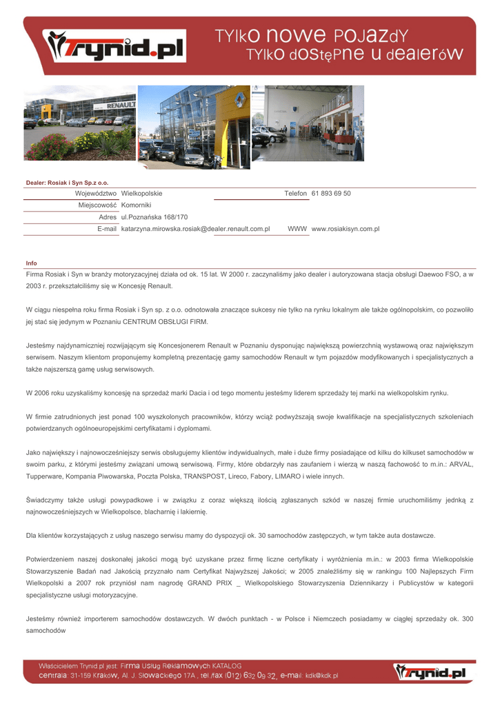 Dealer: Rosiak i Syn Sp.z o.o. Województwo Wielkopolskie Telefon 61 893 69 50 Miejscowość Komorniki Adres ul.Poznańska 168/170 E-mail [email protected] WWW www.rosiakisyn.com.pl Info Firma Rosiak i Syn w branży motoryzacyjnej działa od ok. 15 lat. W 2000 r. zaczynaliśmy jako dealer i autoryzowana stacja obsługi Daewoo FSO, a w 2003 r. przekształciliśmy się w Koncesję Renault. W ciągu niespełna roku firma Rosiak i Syn sp. z o.o. odnotowała znaczące sukcesy nie tylko na rynku lokalnym ale także ogólnopolskim, co pozwoliło jej stać się jedynym w Poznaniu CENTRUM OBSŁUGI FIRM. Jesteśmy najdynamiczniej rozwijającym się Koncesjonerem Renault w Poznaniu dysponując największą powierzchnią wystawową oraz największym serwisem. Naszym klientom proponujemy kompletną prezentację gamy samochodów Renault w tym pojazdów modyfikowanych i specjalistycznych a także najszerszą gamę usług serwisowych. W 2006 roku uzyskaliśmy koncesję na sprzedaż marki Dacia i od tego momentu jesteśmy liderem sprzedaży tej marki na wielkopolskim rynku. W firmie zatrudnionych jest ponad 100 wyszkolonych pracowników, którzy wciąż podwyższają swoje kwalifikacje na specjalistycznych szkoleniach potwierdzanych ogólnoeuropejskimi certyfikatami i dyplomami. Jako największy i najnowocześniejszy serwis obsługujemy klientów indywidualnych, małe i duże firmy posiadające od kilku do kilkuset samochodów w swoim parku, z którymi jesteśmy związani umową serwisową. Firmy, które obdarzyły nas zaufaniem i wierzą w naszą fachowość to m.in.: ARVAL, Tupperware, Kompania Piwowarska, Poczta Polska, TRANSPOST, Lireco, Fabory, LIMARO i wiele innych. Świadczymy także usługi powypadkowe i w związku z coraz większą ilością zgłaszanych szkód w naszej firmie uruchomiliśmy jednką z najnowocześniejszych w Wielkopolsce, blacharnię i lakiernię. Dla klientów korzystających z usług naszego serwisu mamy do dyspozycji ok. 30 samochodów zastępczych, w tym także auta dostawcze. Potwierdzeniem naszej doskonałej jakości mogą być uzyskane przez firmę liczne certyfikaty i wyróżnienia m.in.: w 2003 firma Wielkopolskie Stowarzyszenie Badań nad Jakością przyznało nam Certyfikat Najwyższej Jakości; w 2005 znaleźliśmy się w rankingu 100 Najlepszych Firm Wielkopolski a 2007 rok przyniósł nam nagrodę GRAND PRIX _ Wielkopolskiego Stowarzyszenia Dziennikarzy i Publicystów w kategorii specjalistyczne usługi motoryzacyjne. Jesteśmy również importerem samochodów dostawczych. W dwóch punktach - w Polsce i Niemczech posiadamy w ciągłej sprzedaży ok. 300 samochodów Pojazdy dostępne u dealera 1 Dacia Logan (2004-12) Laureate black line Czerwień ognista Od reki Sl arctica Czerwony passion Od reki Szary comete Od reki Niebieski marine Od reki Biel alpejska Od reki Uwagi: Pakiet Komfort klimatyzacja radio CD ROCZNIK 2010 RABAT 2.000 2 Dacia Logan (2004-12) Uwagi: Pakiet Komfort RABAT 2010 3 Dacia Logan MCV 7-m (2004 - )Laureate BL (black line) Uwagi: Pakiet Komfort koło zapasowe ROCZNIK 2010 RABAT 2.000 4 Dacia Logan Pick-Up (2004 - ) Confort 1.5 DCI 68 KM MT Uwagi: Pakiet elektryczny Pakiet Komfort 5 Dacia Logan Van (2004 - ) Confort Uwagi: Pakiet Komfort Pakiet Elektryczny wykończenie przestrzeni bagażowej-biały plastik 6 Dacia Sandero (2008-12 ) Od reki Uwagi: Pakiet Komfort koło zapasowe szyby elektryczne ROCZNIK 2010 7 Dacia Sandero (2008-12 ) Laureate BL2 (black line2) Czarna perła metalik Od reki Szary platynowy metalik Od reki Uwagi: Pakiet Komfort koło zapasowe ROCZNIK 2010 8 Dacia Sandero (2008-12 ) Laureate BL2 (black line2) Uwagi: Pakiet Komfort koło zapasowe ROCZNIK 2010 9 Dacia Sandero (2008-12 ) Sl arctica Szary basalte Od reki Sl arctica Szary basalte Od reki Stepway2 Szary comete metalik Od reki Stepway2 Szary platynowy metalik Od reki Uwagi: Pakiet Komfort koło zapasowe 10 Dacia Sandero (2008-12 ) Uwagi: rado CD Pakiet Elektryczny światła przrzeciwmgielne ROCZNIK 2009 RABAT 2.000 11 Dacia Sandero (2008-12 ) Uwagi: Pakiet Komfort koło zapasowe lakier metalizowany ROCZNIK 2010 12 Dacia Sandero (2008-12 ) Uwagi: Pakiet Komfort ROCZNIK 2010