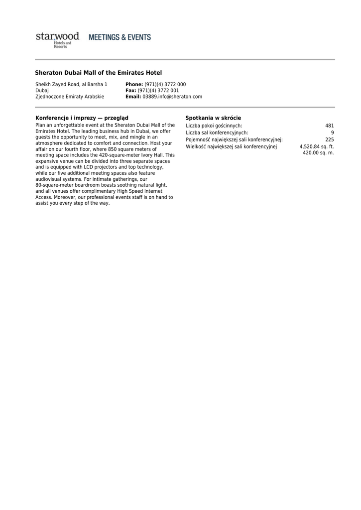 Sheraton Dubai Mall of the Emirates Hotel Sheikh Zayed Road, al Barsha 1 Dubaj Zjednoczone Emiraty Arabskie Phone: (971)(4) 3772 000 Fax: (971)(4) 3772 001 Email: [email protected] Konferencje i imprezy — przegląd Spotkania w skrócie Plan an unforgettable event at the Sheraton Dubai Mall of the Emirates Hotel. The leading business hub in Dubai, we offer guests the opportunity to meet, mix, and mingle in an atmosphere dedicated to comfort and connection. Host your affair on our fourth floor, where 850 square meters of meeting space includes the 420-square-meter Ivory Hall. This expansive venue can be divided into three separate spaces and is equipped with LCD projectors and top technology, while our five additional meeting spaces also feature audiovisual systems. For intimate gatherings, our 80-square-meter boardroom boasts soothing natural light, and all venues offer complimentary High Speed Internet Access. Moreover, our professional events staff is on hand to assist you every step of the way. Liczba pokoi gościnnych: Liczba sal konferencyjnych: Pojemność największej sali konferencyjnej: Wielkość największej sali konferencyjnej 481 9 225 4,520.84 sq. ft. 420.00 sq. m. Sheraton Dubai Mall of the Emirates Hotel Sheikh Zayed Road, al Barsha 1 Dubaj Zjednoczone Emiraty Arabskie Phone: (971)(4) 3772 000 Fax: (971)(4) 3772 001 Email: [email protected] Specyfikacja szczegółowa Nieruchomości Typ obiektu Urban Liczba sal konferencyjnych 9 Rok budowy 2010 Całkowita wielkość sal konferencyjnych 850.00 sq. m. 9,149.32 sq. ft. Liczba budynków 1 Wielkość największej sali konferencyjnej 420.00 sq. m. 4,520.84 sq. ft. Liczba pięter 23 Pojemność największej sali konferencyjnej 225 Pojemność najmniejszej sali konferencyjnej 35.00 sq. m. 376.74 sq. ft. Pojemność najmniejszej sali konferencyjnej 30 Pokoje gościnne Data zameldowania 3:00 PM Internet w pokoju Bezprzewodowy szybki dostęp do Internetu Data wymeldowania 12:00 PM Liczba pokoi gościnnych 481 Udogodnienia Basen Yes Spa Sprzęt fitness Nazwa basenu Rooftop Infinity Pools Lokalne & atrakcje Strefa czasowa G Pobliskie lotniska Dubai Airport Kod lotniska DXB Odległość od lotniska 1.30 Kilometers 0.81 Miles Obszar lokalny The Sheraton Dubai Mall of the Emirates Hotel is conveniently attached to one of the world’s largest luxury malls, home of the renowned Ski Dubai indoor resort. Dubai International Airport (DXB) is only 20 minutes away. Less than 10 minutes away is Jumeirah, an area that encompasses Wild Wadi Water Park and Palm Jumeirah. Other recreational destinations nearby include Emirates Golf Club, Dubai Marina, and Meydan Racecourse. If you are here on business, major corporate areas—such as Dubai’s Internet City, Media City, Knowledge Village, and the Jebel Ali Free Zone—can be reached in 15 minutes. Dubai World Trade Center and Burj Khalifa are a short drive away as well. Environmental Practices Energy & Water Conservation: • Make A Green Choice program rewards guests for choosing to conserve natural resources in their guest room • High-efficiency lighting in public areas • Occupancy sensors • Water conserving fixtures • Smart irrigation practices • Regular preventive maintenance • ENERGY STAR rated equipment • Variable frequency drives in AC system • Water savers in guest rooms and kitchen • Pool heat pump • Water recycling plant • Energy efficient building lights with timer • Motion sensors to control lighting • LED 5 W energy-saving light bulbs in guest rooms Waste Minimization & Environmentally Responsible Purchasing: • Recycling • Dumpster monitoring • Elimination of styrofoam packaging • Environmentally preferred suppliers • Environmentally preferred products • Amenity management • Energy Recuperation Drives (REGEN) in high-rise lifts • Energy efficient CFL lamps Enhanced Indoor Environmental Quality: • Green Housekeeping • Integrated pest management practices • Building envelope, double-glazed glass, and well-insulated piping for energy loss prevention Raising Awareness: • Property-level Green Council Opłaty & podatki Waluta lokalna United Arab Emirates Dirhams Kod waluty AED Metody płatności • AMEX / OPTIMA • VISA • DINERS/SUNDIN/AMOCO • MASTER CARD • JAPAN CREDIT BUREAU Sheraton Dubai Mall of the Emirates Hotel Sheikh Zayed Road, al Barsha 1 Dubaj Zjednoczone Emiraty Arabskie Phone: (971)(4) 3772 000 Fax: (971)(4) 3772 001 Email: [email protected] Capacity Charts Room Name Key Dim. (l x w) Area Height Banq. Thtr. Dusk - 11.58 m. x 5.34 m.37.99 ft. x 17.52 ft. 80.00 sq. m. 861.11 sq. ft. 3.30 m. 10.83 ft. - - Ivory 1 - 9.00 m. x 15.90 m.29.53 ft. x 52.17 ft. 141.00 sq. m. 1,517.71 sq. ft. 3.10 m. 10.17 ft. 50 75 Ivory 2 - 9.00 m. x 15.90 m.29.53 ft. x 52.17 ft. 143.00 sq. m. 1,539.24 sq. ft. 3.10 m. 10.17 ft. 50 75 Ivory 3 - 9.00 m. x 15.90 m.29.53 ft. x 52.17 ft. 141.00 sq. m. 1,517.71 sq. ft. 3.10 m. 10.17 ft. 50 75 Ivory Hall - 18.00 m. x 15.90 m.59.06 ft. x 52.17 ft. 420.00 sq. m. 4,520.84 sq. ft. 3.10 m. 10.17 ft. 150 225 Lemon - 7.55 m. x 4.59 m.24.77 ft. x 15.06 ft. 35.00 sq. m. 376.74 sq. ft. 2.70 m. 8.86 ft. 20 25 Sky - 8.20 m. x 6.46 m.26.90 ft. x 21.19 ft. 53.00 sq. m. 570.49 sq. ft. 2.70 m. 8.86 ft. 30 40 Tangerine - 12.37 m. x 13.73 m.40.58 ft. x 45.05 ft. 101.00 sq. m. 1,087.15 sq. ft. 3.30 m. 10.83 ft. 50 75 Truffle - 11.71 m. x 9.23 m.38.42 ft. x 30.28 ft. 59.00 sq. m. 635.07 sq. ft. 3.60 m. 11.81 ft. 32 40 Watercress - 9.18 m. x 6.05 m.30.12 ft. x 19.85 ft. 56.00 sq. m. 602.78 sq. ft. 2.70 m. 8.86 ft. 30 50 Room Name Conf. Rec. Class U-Shp. H. Sq. Dinner Dance Watercress 22 - - - - - Watercress 16 125 40 30 35 - Watercress 16 125 40 30 35 - Watercress 16 125 40 30 35 - Watercress 72 370 120 55 75 - Watercress 8 25 12 12 16 - Watercress 12 40 30 15 20 - Watercress 16 100 32 30 35 - Watercress 12 40 18 15 20 - Watercress 16 40 18 15 20 -