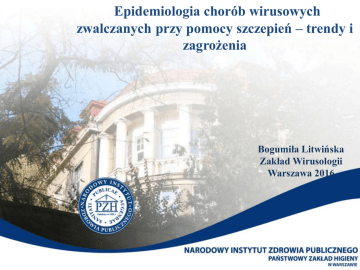 Epidemiologia chorób wirusowych zwalczanych przy pomocy szczepień – trendy i zagrożenia Bogumiła Litwińska Zakład Wirusologii Warszawa 2016 Odporność populacyjna Warunki uzyskania odporności populacyjnej - osoby zaszczepione posiadają przeciwciała dla antygenów zawartych w szczepionce - powoduje to dużo niższe niebezpieczeństwo zakażenia tym patogenem innych osób - daje to możliwość ochrony przed zakażeniem nawet tych osób, które nie były szczepione - aby uzyskać odporność populacyjną musi być zaszczepionych > 95% populacji 2 Sukces powszechnych szczepień przeciwko ospie prawdziwej Rok 1978 – na świecie ostatni przypadek ostry prawdziwej Rok 1980 – prawdziwej świat uznany jako wolny od ospy 3 Zarejestrowane i stosowane szczepionki przeciwwirusowe kalendarz szczepień zalecane odrze rotawirusom (t. 1,2,3,4,) śwince ospie wietrznej różyczce grypie polio (t. 1,2,3) wirusom papilloma (t.16+18 lub1+6+16+18) wzw B pozostałe wzw A wściekliźnie kleszczowemu zapaleniu mózgu adenowirusom (t. 2,4,7) japońskiemu zapaleniu mózgu żółtej gorączce 4 Poliomyelitis w latach 1946-2007 przypadki zachorowań i śmiertelność na 100 000 100,000 masowe szczepienia dzieci w wieku 5 – 7 lat wprowadzenie szczepionki OPV w 1 roku życia przypadki śmiertelność 10,000 obowiązkowa II dawka w 6/7 roku 1,000 obowiązkowa III dawka w 11 roku życia 0,100 0,010 0,001 masowe szczepienia dzieci w wieku 6 m-cy do 5 lat ODRA w latach 1955-2007 przypadki i śmiertelność na 100 000 1 000,000 Szczepienia obligatoryjne 13-15 miesiąc Wprowadzenie II dawki 8 / 7 / 10 lat 100,000 Początek masowych szczepień dzieci i pielęgniarki 10,000 1,000 0,100 0,010 przypadki śmiertelność 0,001 wg Andrzej Zieliński Wpływ szczepień przeciwko odrze na liczbę zachorowań na odrę Początek szczepień Wprowadzenie II dawki Wprowadzenie MMR 100000 10000 1000 liczba 100 10 1 1970 1972 1974 1976 1978 1980 1982 1984 1986 1988 1990 1992 1994 1996 1998 2000 2002 2004 2006 2008 2010 2012 2014 Wpływ szczepień przeciwko różyczce na liczbę zachorowań na różyczkę Początek szczepień dziewczęta 12 -13 lat Wprowadzenie MMR wszystkie dzieci w 13 miesiącu oraz 10 roku życia 100000 10000 1000 liczba 100 10 1970 1971 1972 1973 1974 1975 1976 1977 1978 1979 1980 1981 1982 1983 1984 1985 1986 1987 1988 1989 1990 1991 1992 1993 1994 1995 1996 1997 1998 1999 2000 2001 2002 2003 2004 2005 2006 2007 2008 2009 2010 2011 2012 2013 2014 2015 1 Dane ECDC – zachorowania na różyczkę 2010 Różyczka 2012-2013 (do lutego !!!) 14 według WHO Ospa wietrzna 250000 200000 150000 przypadki ospy wietrznej 100000 50000 0 1996 1997 1998 1999 2000 2001 2002 2002 2004 2005 2006 2007 2008 2009 2010 2011 2012 2013 2014 2015 2016 Zapadalność na ospę wietrzną, odrę, świnkę i różyczkę 700 600 500 ospa 400 odra różyczka 300 nzp Kolumna1 200 100 0 1996 1997 1998 1999 2000 2001 2002 2003 2004 2005 2006 2007 2008 2009 2010 2011 2012 2013 2014 2015 2016 Odnośnie braku chorób przeciwko którym prowadzone są szczepienia Przyczyną braku zachorowań na poliomyelitis oraz spadku liczby zachorowań na odrę, różyczkę, świnkę nie jest brak krążenia tych wirusów w środowisku lecz odporność populacyjna wynikająca z faktu, że ponad 95% osób zostało zaszczepionych przeciwko tym wirusom 18 • Na początku lat 90-tych XX wieku umierało rocznie 12 mln dzieci • W 2011 r liczba dzieci, które nie przeżyły 5 lat wyniosła 6.9 miliona Przyczyniły się do tego szczepienia przeciwko odrze, śwince, różyczce oraz przeciwko malarii 19 Zapadalność na wzw typu B w Polsce przed i po wprowadzeniu szczepień ochronnych Wg. Andrzej Zieliński 45,0 40,0 30,0 25,0 20,0 15,0 10,0 5,0 okres przed wprowadzeniem szczepień stopniowe wprowadzanie szczepień intensyfikacja szczepień 0,0 19 79 19 80 19 81 19 82 19 83 19 84 19 85 19 86 19 87 19 88 19 89 19 90 19 91 19 92 19 93 19 94 19 95 19 96 19 97 19 98 19 99 20 00 20 01 20 02 20 03 20 04 20 05 Zapadalność na 100 000 35,0 Zapadalność na wzw typu C w Polsce w latach 1997 - 2004 wg. Andrzej Zieliński 8,0 7,0 Zapadalność na 100 000 6,0 5,0 4,0 3,0 2,0 1,0 0,0 1997 1998 1999 2000 2001 2002 2003 2004 2005 Dziękuję za uwagę 22