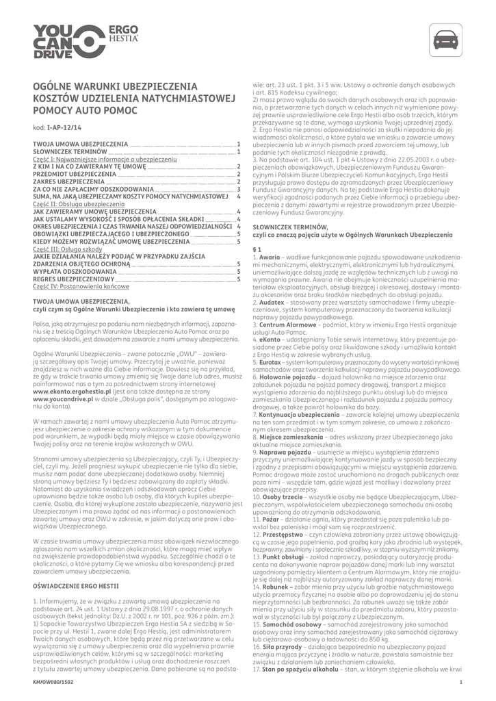OGÓLNE WARUNKI UBEZPIECZENIA KOSZTÓW UDZIELENIA NATYCHMIASTOWEJ POMOCY AUTO POMOC kod: I-AP-12/14 TWOJA UMOWA UBEZPIECZENIA 1 SŁOWNICZEK TERMINÓW 1 Część I: Najważniejsze informacje o ubezpieczeniu Z KIM I NA CO ZAWIERAMY TĘ UMOWĘ 2 PRZEDMIOT UBEZPIECZENIA 2 ZAKRES UBEZPIECZENIA 2 ZA CO NIE ZAPŁACIMY ODSZKODOWANIA 3 SUMA, NA JAKĄ UBEZPIECZAMY KOSZTY POMOCY NATYCHMIASTOWEJ 4 Część II: Obsługa ubezpieczenia JAK ZAWIERAMY UMOWĘ UBEZPIECZENIA 4 JAK USTALAMY WYSOKOŚĆ I SPOSÓB OPŁACENIA SKŁADKI 4 OKRES UBEZPIECZENIA I CZAS TRWANIA NASZEJ ODPOWIEDZIALNOŚCI 4 OBOWIĄZKI UBEZPIECZAJĄCEGO I UBEZPIECZONEGO 5 KIEDY MOŻEMY ROZWIĄZAĆ UMOWĘ UBEZPIECZENIA 5 Część III: Osługa szkody JAKIE DZIAŁANIA NALEŻY PODJĄĆ W PRZYPADKU ZAJŚCIA ZDARZENIA OBJĘTEGO OCHRONĄ 5 WYPŁATA ODSZKODOWANIA 5 REGRES UBEZPIECZENIOWY 5 Część IV: Postanowienia końcowe TWOJA UMOWA UBEZPIECZENIA, czyli czym są Ogólne Warunki Ubezpieczenia i kto zawiera tę umowę Polisa, jaką otrzymujesz po podaniu nam niezbędnych informacji, zapoznaniu się z treścią Ogólnych Warunków Ubezpieczenia Auto Pomoc oraz po opłaceniu składki, jest dowodem na zawarcie z nami umowy ubezpieczenia. Ogólne Warunki Ubezpieczenia – zwane potocznie „OWU” – zawierają szczegółowy opis Twojej umowy. Przeczytaj je uważnie, ponieważ znajdziesz w nich ważne dla Ciebie informacje. Dowiesz się na przykład, że gdy w trakcie trwania umowy zmienią się Twoje dane lub adres, musisz poinformować nas o tym za pośrednictwem strony internetowej www.ekonto.ergohestia.pl (jest ona także dostępna ze strony www.youcandrive.pl w dziale „Obsługa polis”, dostępnym po zalogowaniu do konta). W ramach zawartej z nami umowy ubezpieczenia Auto Pomoc otrzymujesz ubezpieczenie o zakresie ochrony wskazanym w tym dokumencie pod warunkiem, że wypadki będą miały miejsce w czasie obowiązywania Twojej polisy oraz na terenie krajów wskazanych w OWU. Stronami umowy ubezpieczenia są Ubezpieczający, czyli Ty, i Ubezpieczyciel, czyli my. Jeżeli pragniesz wykupić ubezpieczenie nie tylko dla siebie, musisz nam podać dane ubezpieczanej dodatkowo osoby. Niemniej stroną umowy będziesz Ty i będziesz zobowiązany do zapłaty składki. Natomiast do uzyskania świadczeń i odszkodowań oprócz Ciebie uprawniona będzie także osoba lub osoby, dla których kupiłeś ubezpieczenie. Osoba, dla której wykupione zostało ubezpieczenie, nazywana jest Ubezpieczonym i ma prawo żądać od nas informacji o postanowieniach zawartej umowy oraz OWU w zakresie, w jakim dotyczą one praw i obowiązków Ubezpieczonego. W czasie trwania umowy ubezpieczenia masz obowiązek niezwłocznego zgłaszania nam wszelkich zmian okoliczności, które mogą mieć wpływ na zwiększenie prawdopodobieństwa wypadku. Szczególnie chodzi o te okoliczności, o które pytamy Cię we wniosku albo korespondencji przed zawarciem umowy ubezpieczenia. OŚWIADCZENIE ERGO HESTII 1. Informujemy, że w związku z zawartą umową ubezpieczenia na podstawie art. 24 ust. 1 Ustawy z dnia 29.08.1997 r. o ochronie danych osobowych (tekst jednolity: Dz.U. z 2002 r. nr 101, poz. 926 z późn. zm.): 1) Sopockie Towarzystwo Ubezpieczeń Ergo Hestia SA z siedzibą w Sopocie przy ul. Hestii 1, zwane dalej Ergo Hestią, jest administratorem Twoich danych osobowych, które będą przez nią przetwarzane w celu wywiązania się z umowy ubezpieczenia oraz dla wypełnienia prawnie usprawiedliwionych celów, którymi są w szczególności: marketing bezpośredni własnych produktów i usług oraz dochodzenie roszczeń z tytułu zawartej umowy ubezpieczenia. Dane pobierane są na podstaKM/OW080/1502 wie: art. 23 ust. 1 pkt. 3 i 5 ww. Ustawy o ochronie danych osobowych i art. 815 Kodeksu cywilnego; 2) masz prawo wglądu do swoich danych osobowych oraz ich poprawiania, a przetwarzanie tych danych w celach innych niż wymienione powyżej prawnie usprawiedliwione cele Ergo Hestii albo osób trzecich, którym przekazywane są te dane, wymaga uzyskania Twojej uprzedniej zgody. 2. Ergo Hestia nie ponosi odpowiedzialności za skutki niepodania do jej wiadomości okoliczności, o które pytała we wniosku o zawarcie umowy ubezpieczenia lub w innych pismach przed zawarciem tej umowy, lub podanie tych okoliczności niezgodnie z prawdą. 3. Na podstawie art. 104 ust. 1 pkt 4 Ustawy z dnia 22.05.2003 r. o ubezpieczeniach obowiązkowych, Ubezpieczeniowym Funduszu Gwarancyjnym i Polskim Biurze Ubezpieczycieli Komunikacyjnych, Ergo Hestii przysługuje prawo dostępu do zgromadzonych przez Ubezpieczeniowy Fundusz Gwarancyjny danych. Na tej podstawie Ergo Hestia dokonuje weryfikacji zgodności podanych przez Ciebie informacji o przebiegu ubezpieczenia z danymi zawartymi w rejestrze prowadzonym przez Ubezpieczeniowy Fundusz Gwarancyjny. SŁOWNICZEK TERMINÓW, czyli co znaczą pojęcia użyte w Ogólnych Warunkach Ubezpieczenia §1 1. Awaria – wadliwe funkcjonowanie pojazdu spowodowane uszkodzeniami mechanicznymi, elektrycznymi, elektronicznymi lub hydraulicznymi, uniemożliwiające dalszą jazdę ze względów technicznych lub z uwagi na wymagania prawne. Awaria nie obejmuje konieczności uzupełnienia materiałów eksploatacyjnych, obsługi bieżącej i okresowej, dostawy i montażu akcesoriów oraz braku środków niezbędnych do obsługi pojazdu. 2. Audatex – stosowany przez warsztaty samochodowe i firmy ubezpieczeniowe, system komputerowy przeznaczony do tworzenia kalkulacji naprawy pojazdu powypadkowego. 3. Centrum Alarmowe – podmiot, który w imieniu Ergo Hestii organizuje usługi Auto Pomoc. 4. eKonto – udostępniany Tobie serwis internetowy, który prezentuje posiadane przez Ciebie polisy oraz likwidowane szkody i umożliwia kontakt z Ergo Hestią w zakresie wybranych usług. 5. Eurotax – system komputerowy przeznaczony do wyceny wartości rynkowej samochodów oraz tworzenia kalkulacji naprawy pojazdu powypadkowego. 6. Holowanie pojazdu – dojazd holownika na miejsce zdarzenia o