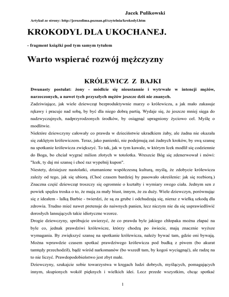 Jacek Pulikowski Artykuł ze strony: http://jerozolima.poznan.pl/czytelnia/krokodyl.htm KROKODYL DLA UKOCHANEJ. - fragment książki pod tym samym tytułem Warto wspierać rozwój mężczyzny KRÓLEWICZ Z BAJKI Dwunasty postulat: żony - módlcie się nieustannie i wytrwale w intencji mężów, narzeczonych, a nawet tych przyszłych mężów jeszcze dziś nie znanych. Zadziwiające, jak wiele dziewcząt bezproduktywnie marzy o królewiczu, a jak mało zakasuje rękawy i pracuje nad sobą, by być dla niego dobrą partią. Wydaje się, że jeszcze mniej sięga do nadzwyczajnych, nadprzyrodzonych środków, by osiągnąć upragniony życiowo cel. Myślę o modlitwie. Niektóre dziewczyny całowały co prawda w dzieciństwie ukradkiem żaby, ale żadna nie okazała się zaklętym królewiczem. Teraz, jako panienki, nie podejmują zaś żadnych kroków, by swą szansę na spotkanie królewicza zwiększyć. To tak, jak w tym kawale, w którym Icek modlił się codziennie do Boga, bo chciał wygrać milion złotych w totolotka. Wreszcie Bóg się zdenerwował i mówi: "Icek, ty daj mi szansę i choć raz wypełnij kupon". Niestety, dzisiejsze nastolatki, otumanione współczesną kulturą, myślą, że zdobycie królewicza zależy od tego, jak się ubiorą. (Choć czasem bardziej by pasowało określenie: jak się rozbiorą.) Znaczna część dziewcząt troszczy się ogromnie o kształty i wymiary swego ciała. Jednym sen z powiek spędza troska o to, że mają za mały biust, innym, że za duży. Wiele dziewczyn, porównując się z ideałem - lalką Barbie - twierdzi, że są za grube i odchudzają się, nieraz z wielką szkodą dla zdrowia. Trudno mieć nawet pretensje do naiwnych panien, lecz niczym nie da się usprawiedliwić dorosłych lansujących takie idiotyczne wzorce. Drogie dziewczyny, spróbujcie uwierzyć, że co prawda byle jakiego chłopaka można złapać na byle co, jednak prawdziwi królewicze, którzy chodzą po świecie, mają znacznie wyższe wymagania. By zwiększyć szansę na spotkanie królewicza, należy bywać tam, gdzie oni bywają. Można wprawdzie czasem spotkać prawdziwego królewicza pod budką z piwem (bo akurat tamtędy przechodził), bądź wśród narkomanów (bo wszedł tam, by kogoś wyciągnąć), ale radzę na to nie liczyć. Prawdopodobieństwo jest zbyt małe. Dziewczyny, szukajcie sobie towarzystwa w kręgach ludzi dobrych, myślących, pomagających innym, skupionych wokół pięknych i wielkich idei. Lecz przede wszystkim, chcąc spotkać 1 królewicza, musicie zainwestować w siebie. Stać się pięknymi duchowo i dobrymi, zdolnymi do ofiarności i miłości, tak, by przechodzący obok królewicz, jak porażony padł do stóp i poprosił o rękę. Marzenia się spełniają Dziewczyna potrafi modlić się o zdrowie dla siebie i bliskich, o zdanie egzaminu, nawet o dostanie w prezencie wymarzonego ciucha. Czemu nie wpada na pomysł, by modlić się cierpliwie i wytrwale o swojego przyszłego męża? Przecież on najprawdopodobniej gdzieś realnie jest, gdzieś żyje, chodzi po ziemi. Zagrażają mu najróżniejsze niebezpieczeństwa. Może się w życiu pogubić i przestać być godnym marzeń królewiczem. Kiedyś do poradni rodzinnej przyszła staruszka. Przyniosła różne papierzyska po śmierci małżonka: może się przydadzą. Mąż w ciężkich czasach powojennych bronił godności człowieka, m.in. przeciwstawiał się zabijaniu dzieci poczętych w łonach matek. Wśród papierów znalazłem maszynopis. Kilkadziesiąt stron zapisanych na papierze przebitkowym, zatytułowanych "Pamiętnik narzeczonego". Mam ciągłe wyrzuty sumienia, że nie opublikowałem tego wzruszającego tekstu. Pamiętnik zapisany był bardzo prostym językiem przez młodego chłopaka. Przez całą wojnę marzył on, że jak ten koszmar się skończy, założy wspaniałą rodzinę, wychowa gromadkę dzieci. Marzenia przełożył na czyn. Codziennie wytrwale modlił się o świętą narzeczoną. Los jego potoczył się tak, że po wojnie zakochał się w pięknej dziewczynie. W trakcie znajomości okazało się, że z niejednego pieca chleb jadła i jest całkowicie pogubiona moralnie. Pod wpływem narzeczonego przemieniła się, zerwała z dotychczasowym życiem, zbliżyła się do Kościoła i Boga, i została świętą żoną. Wytrwała modlitwa chłopaka została wysłuchana, choć droga narzeczonej do świętości była dość karkołomna. (Nasuwa się na myśl dojście do świętości wielkiej grzesznicy Marii Magdaleny). Wszystko wygląda na historię nieprawdopodobną, lecz pamiętajmy, że u Boga nie ma nic niemożliwego. Po ludzku niemożliwe Wejdźmy na teren małżeństwa. Tam często niestety dzieją się rzeczy złe, których po ludzku wydaje się - nie da się naprawić. Udręczone żony szukają pomocy. Przychodzą do poradni rodzinnej (zaznaczmy: przy Kościele katolickim), by ratować małżeństwo. Otrzymują najróżniejsze rady, które mogą pomóc w złagodzeniu sytuacji, w rozpoczęciu procesu zdrowienia rodziny. Zadziwiający jest fakt, że te wierzące kobiety, zapytane wprost, czy modlą się w intencji męża, bardzo często wydają się być zaskoczone. Niektóre, którym wydawało się, iż wyczerpały wszystkie możliwości ratowania rodziny, nie wpadły nawet na pomysł, by modlić się w intencji męża. Owszem, korzystały z usług wróżki, różnych hochsztaplerów o cudotwórczych 2 właściwościach, ale żeby się modlić? Tymczasem cierpliwa modlitwa naprawdę czyni cuda. Niestety, niektóre żony, które - jak im się wydawało - przyszły, by ratować małżeństwo, były wręcz oburzone: Co, ja mam się modlić za tego drania? Tego by jeszcze brakowało! Nie mam najmniejszej wątpliwości, że te kobiety przychodzą do poradni, by się lepiej poczuć, by się utwierdzić w przekonaniu, że są świętymi męczennicami i że wszystkiemu winien jest mąż. Chcą zagłuszyć wyrzuty sumienia, że dom stał się piekłem za ich cic