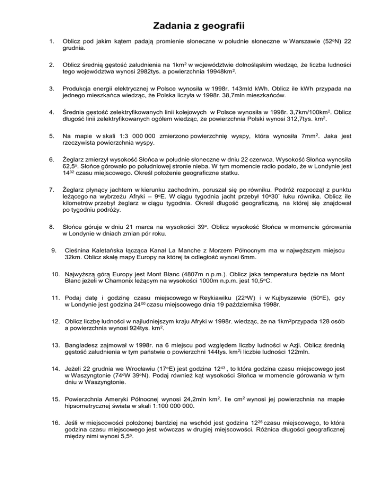 Zadania z geografii 1. Oblicz pod jakim kątem padają promienie słoneczne w południe słoneczne w Warszawie (52oN) 22 grudnia. 2. Oblicz średnią gęstość zaludnienia na 1km 2 w województwie dolnośląskim wiedząc, że liczba ludności tego województwa wynosi 2982tys. a powierzchnia 19948km 2. 3. Produkcja energii elektrycznej w Polsce wynosiła w 1998r. 143mld kWh. Oblicz ile kWh przypada na jednego mieszkańca wiedząc, że Polska liczyła w 1998r. 38,7mln mieszkańców. 4. Średnia gęstość zelektryfikowanych linii kolejowych w Polsce wynosiła w 1998r. 3,7km/100km2. Oblicz długość linii zelektryfikowanych ogółem wiedząc, że powierzchnia Polski wynosi 312,7tys. km2. 5. Na mapie w skali 1:3 000 000 zmierzono powierzchnię wyspy, która wynosiła 7mm 2. Jaka jest rzeczywista powierzchnia wyspy. 6. Żeglarz zmierzył wysokość Słońca w południe słoneczne w dniu 22 czerwca. Wysokość Słońca wynosiła 62,5o. Słońce górowało po południowej stronie nieba. W tym momencie radio podało, że w Londynie jest 1432 czasu miejscowego. Określ położenie geograficzne statku. 7. Żeglarz płynący jachtem w kierunku zachodnim, poruszał się po równiku. Podróż rozpoczął z punktu leżącego na wybrzeżu Afryki – 9oE. W ciągu tygodnia jacht przebył 10o30` łuku równika. Oblicz ile kilometrów przebył żeglarz w ciągu tygodnia. Określ długość geograficzną, na której się znajdował po tygodniu podróży. 8. Słońce góruje w dniu 21 marca na wysokości 39o. Oblicz wysokość Słońca w momencie górowania w Londynie w dniach zmian pór roku. 9. Cieśnina Kaletańska łącząca Kanał La Manche z Morzem Północnym ma w najwęższym miejscu 32km. Oblicz skalę mapy Europy na której ta odległość wynosi 6mm. 10. Najwyższą górą Europy jest Mont Blanc (4807m n.p.m.). Oblicz jaka temperatura będzie na Mont Blanc jeżeli w Chamonix leżącym na wysokości 1000m n.p.m. jest 10,5oC. 11. Podaj datę i godzinę czasu miejscowego w Reykiawiku (22oW) i w Kujbyszewie (50oE), gdy w Londynie jest godzina 2400 czasu miejscowego dnia 19 października 1998r. 12. Oblicz liczbę ludności w najludniejszym kraju Afryki w 1998r. wiedząc, że na 1km 2przypada 128 osób a powierzchnia wynosi 924tys. km 2. 13. Bangladesz zajmował w 1998r. na 6 miejscu pod względem liczby ludności w Azji. Oblicz średnią gęstość zaludnienia w tym państwie o powierzchni 144tys. km 2i liczbie ludności 122mln. 14. Jeżeli 22 grudnia we Wrocławiu (17oE) jest godzina 1243 , to która godzina czasu miejscowego jest w Waszyngtonie (74oW 39oN). Podaj również kąt wysokości Słońca w momencie górowania w tym dniu w Waszyngtonie. 15. Powierzchnia Ameryki Północnej wynosi 24,2mln km 2. Ile cm2 wynosi jej powierzchnia na mapie hipsometrycznej świata w skali 1:100 000 000. 16. Jeśli w miejscowości położonej bardziej na wschód jest godzina 12 25 czasu miejscowego, to która godzina czasu miejscowego jest wówczas w drugiej miejscowości. Różnica długości geograficznej między nimi wynosi 5,5o. Zadania z geografii 17. Największy półwysep Ameryki Południowej przecina równoleżnik 12 oN. Ile wynosi ta odległość od równika w kilometrach. 18. Oblicz jaki procent powierzchni Polski (312,7tys. km 2) stanowi województwo dolnośląskie (19,9tys. km2). 19. Najdalej wysunięte większe miejscowości Dolnego Śląska to: Syców (18oE) na wschodzie i Sieniawa (15oE) na zachodzie. Oblicz rozciągłość równoleżnikową woj. dolnośląskiego w stopniach i kilometrach przy założeniu, że 1o odpowiada 68,5km na szerokości geograficznej tych miejscowości. 20. Oblicz jaka temperatura powietrza będzie na Śnieżce (1602m n.p.m.) jeżeli w Jeleniej Górze (347m n.p.m.) jest 20oC, a cały obszar jest w masie powietrza wilgotnego. 21. Oblicz jaki procent ludności stanowiliby obywatele Polski, jeśli przyjęto by nas do Unii, skoro obecnie ludność UE liczy 372mln, a Polski 38,7mln. 22. Ile wynosi odległość Japonii od lądu azjatyckiego, jeśli na mapie w skali 1:15 000 000 odległość ta wynosi 12mm. 23. Ile wynosi różnica wysokości Słońca 22 czerwca między Przylądkiem Czeluskin (77 o45`N) a Singapurem (1o20`N). 24. Ostatnia fala migracyjna w Polsce nastąpiła w latach 80-tych XX w., wyjechało wówczas z Polski 267tys. osób a przybyło na stałe 17,3tys. Oblicz saldo migracji lat 80-tych. 25. Sytuacja demograficzna Polski po 1945r. ma ścisły związek ze stratami jakie nasz kraj poniósł w czasie II wojny światowej – według Biura Odszkodowań Wojennych przy Prezydium Rady Ministrów z 1947r. życie straciło 6 028 000 obywateli polskich, 590tys. stało się inwalidami a według szacunków demograficznych – nie urodziło się w latach 1929-45 1,2mln dzieci. Oblicz jaki procent obywateli polskich straciło życie w II wojnie światowej skoro przed wojną Polska liczyła 34 849 000 ludności (dane z 1938r.) 26. Australia jest najmniejszym kontynentem o powierzchni 7,7mln km 2. Największym kontynentem jest Azja o powierzchni 44mln km 2. Określ ile razy , w przybliżeniu, Australia jest mniejsza od Azji. 27. Statek wypłynął z portu w Honolulu (21o19`N) i skierował się na północ w kierunku Półwyspu Alaska (56oN). Na jakiej wysokości nad horyzontem żeglarze widzieli Gwiazdę Polarną i po której stronie nieba kiedy ruszali w rejs i kiedy dopłynęli do celu. 28. Oblicz w przybliżeniu, o ile skróciła się droga z portów Europy Zachodniej do zachodnich wybrzeży Półwyspu Indyjskiego po otwarciu Kanału Sueskiego. 29. Oblicz różnicę czasu miejscowego między zachodnimi (9o50`W) i wschodnimi (169o40`W) krańcami Eurazji. 30. Światło porusza się ze stałą prędkością 300 000km na sekundę. Oblicz w jakiej odległości od Słońca znajduje się Ziemia, jeżeli promień światła przebywa tę odległość w czasie 8 minut 20 sekund. 31. Oblicz spłaszczenie Ziemi wiedząc, że promień równikowy wynosi 6378,2km a promień biegunowy 6356,9km