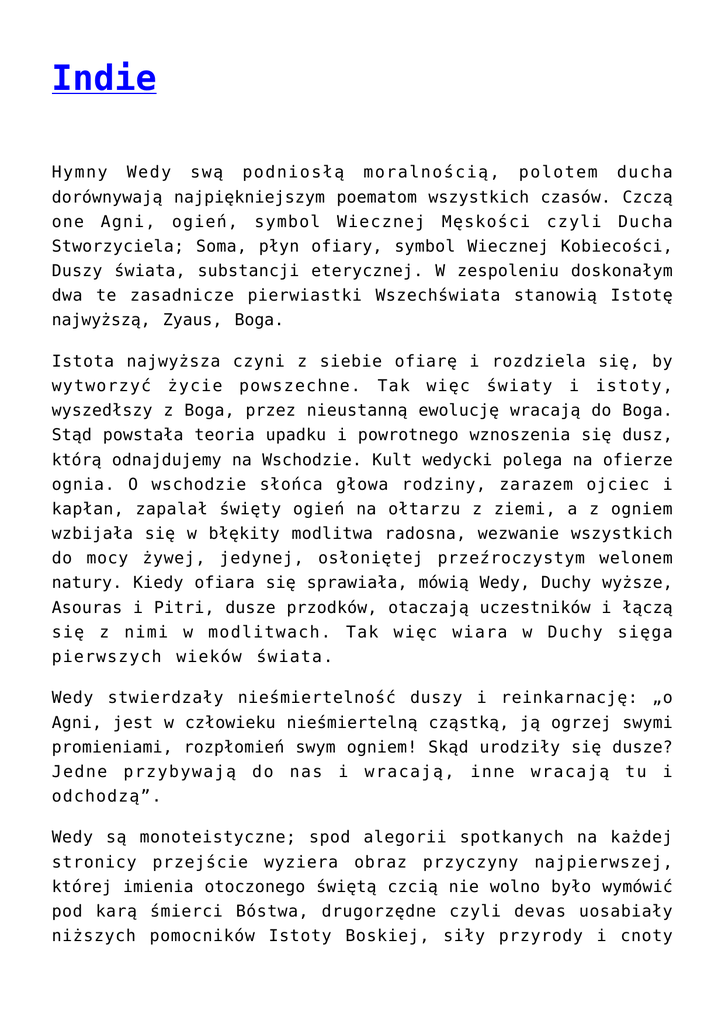 Indie Hymny Wedy swą podniosłą moralnością, polotem ducha dorównywają najpiękniejszym poematom wszystkich czasów. Czczą one Agni, ogień, symbol Wiecznej Męskości czyli Ducha Stworzyciela; Soma, płyn ofiary, symbol Wiecznej Kobiecości, Duszy świata, substancji eterycznej. W zespoleniu doskonałym dwa te zasadnicze pierwiastki Wszechświata stanowią Istotę najwyższą, Zyaus, Boga. Istota najwyższa czyni z siebie ofiarę i rozdziela się, by wytworzyć życie powszechne. Tak więc światy i istoty, wyszedłszy z Boga, przez nieustanną ewolucję wracają do Boga. Stąd powstała teoria upadku i powrotnego wznoszenia się dusz, którą odnajdujemy na Wschodzie. Kult wedycki polega na ofierze ognia. O wschodzie słońca głowa rodziny, zarazem ojciec i kapłan, zapalał święty ogień na ołtarzu z ziemi, a z ogniem wzbijała się w błękity modlitwa radosna, wezwanie wszystkich do mocy żywej, jedynej, osłoniętej przeźroczystym welonem natury. Kiedy ofiara się sprawiała, mówią Wedy, Duchy wyższe, Asouras i Pitri, dusze przodków, otaczają uczestników i łączą się z nimi w modlitwach. Tak więc wiara w Duchy sięga pierwszych wieków świata. Wedy stwierdzały nieśmiertelność duszy i reinkarnację: „o Agni, jest w człowieku nieśmiertelną cząstką, ją ogrzej swymi promieniami, rozpłomień swym ogniem! Skąd urodziły się dusze? Jedne przybywają do nas i wracają, inne wracają tu i odchodzą”. Wedy są monoteistyczne; spod alegorii spotkanych na każdej stronicy przejście wyziera obraz przyczyny najpierwszej, której imienia otoczonego świętą czcią nie wolno było wymówić pod karą śmierci Bóstwa, drugorzędne czyli devas uosabiały niższych pomocników Istoty Boskiej, siły przyrody i cnoty moralne. Z nauki Wed wynikał cały ustrój społeczeństwa pierwotnego, poszanowanie kobiety, kult przodków, władza wyborcza i patriarchalna. W epoce wedyckiej nad brzegiem rzek i jezior, czy w samotności lasów, anachoreci, rishis, spędzali dni w odosobnieniu. Wykładacze wiedzy okultystycznej i doktryny tajemnej Wed znali już wtedy utajone władze ducha, przekazywane z wieku do wieku, a którymi dziś posługują się fakirzy i joginowie. Z tego bractwa pustelników wyszła myśl twórcza, która uczyniła z bramanizmu największą teokrację. – Kriszna, wychowany przez ascetów w głębinach lasów cedrowych u stóp śnieżnych Himalajów tchnął ducha swego w wierzenia hinduskie. Wielka ta postać ukazuje się w historii, jako pierwszy Boski Wysłannik, pierwszy reformator religijny. Odrodził on naukę wedycką, opierając ją na idei Trójcy, duszy nieśmiertelnej w kolejnych jej przeżyciach. Zapieczętowawszy swe dzieło krwią własną, porzucił ziemię, zostawiając Indiom idealne pojęcie wszechświata i życia, jakim żyły dalej miliony lat. Nauka jego pod różnymi nazwami rozszerzała się po świecie przez liczne wędrówki ludów, ciągnące głównie z wyższej części Indii. Ta święta ziemia jest nie tylko macierzą ludów i cywilizacji, jest ona także ogniskiem natchnień religijnych. Kriszna otoczony grupą uczniów przebiegał miasta, głosząc swą naukę; „Ciało, mówił on , powłoka duszy, w której ona przebywa, jest rzeczą skończoną, lecz dusza, która w niej zamieszkuje, jest niewidzialną, i wieczną”. „Los duszy po śmierci stanowi tajemnice odrodzeń. Jak otchłań Niebios uwidocznia się w promieniach gwiazd, tak otchłań życia się wyjaśnia w świetle tej Prawdy”. „Kiedy ciało jest rozluźnione, kiedy mądrość ma przewagę, dusza ulatuje w sfery tych czystych istot, które świadome są Najwyższego. Jeżeli namiętność zapanuje, dusza znów wraca zamieszkiwać pośród tych, którzy przywiązani są do rzeczy ziemskich. Tak samo dusza omroczona przez materie zostanie przyciągnieta przez ciało istot nierozsądnych”. „Każde odrodzenie, szczęśliwe, czy nieszczęśliwe, wynikiem czynów dokonanych w życiach przeszłych”. jest „Jest wszakże tajemnica większa jeszcze. Aby dojść do doskonałości, trzeba zdobyć wiedzę Jedności, która przewyższa mądrość- trzeba wznieść się do Istoty Boskiej, która przewyższa duszę i inteligencje. Ta istota Boska jest także w każdym z nas” „Nosisz w sobie samym przyjaciela wzniosłego, którego nie znasz Bóg przebywa bowiem we wnętrzu każdego człowieka, lecz mało kto umie go odszukać. Człowiek, który ze swych pragnień i czynów skałada ofiarę Istocie, z której pochodzą pierwiastki wszystkich rzeczy i która stworzyła wszechświat, otrzymuje przez tę ofiarę doskonałość, bo kto w sobie samym znajduje szczęście swoje i radość i w sobie samym także światło swoje, jedno jest z Bogiem. Otóż, wiedźcie o tym, dusza, która odnalazła Boga, wyzwolona jest z odrodzenia i śmierci, ze starości i cierpienia i pije wodę nieśmiertelności”. O swojej własnej naturze i o misji Kriszna mówił słowami, nad którymi warto się zastanowić. Zwracając się do uczniów swoich: „Ja i wy, mówił on, mieliśmy już wiele narodzin. Moje mnie są tylko znane, lecz wy nie znacie nawet swoich. Jakkolwiek z natury swojej nie podlegam już narodzinom i śmierci, ilekroć przecież cnota w świecie upada, a występek i niesprawiedliwość biorą górę, czynię się wówczas widzialnym i tak ukazuję się z wieku na wiek dla ocalenia sprawiedliwego, dla pokarania złego i naprawienia cnoty.” „Odsłoniłem wam wielkie tajemnice. Mówicie o nich tylko z tymi, którzy będą zdolni je zrozumieć. Wy jesteście wybrańcami, widzicie cel, tłum dostrzega tylko kawałek drogi .” Tymi słowami została ustanowiona doktryna tajemna. Mimo że podlegnie ona wielu kolejnym przeróbkom, pozostanie zawsze źródłem życia, skąd pić będą w ciszy i cieniu wszyscy wielcy myśliciele starożytności”. I moralność Kriszny niemniej była czysta: „Cierpienia, jakie zadajemy bliźniemu, pójdą za nami, jak idz