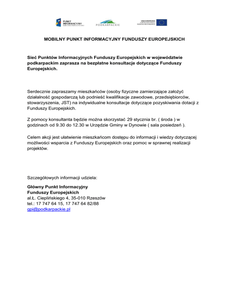 MOBILNY PUNKT INFORMACYJNY FUNDUSZY EUROPEJSKICH Sieć Punktów Informacyjnych Funduszy Europejskich w województwie podkarpackim zaprasza na bezpłatne konsultacje dotyczące Funduszy Europejskich. Serdecznie zapraszamy mieszkańców (osoby fizyczne zamierzające założyć działalność gospodarczą lub podnieść kwalifikacje zawodowe, przedsiębiorców, stowarzyszenia, JST) na indywidualne konsultacje dotyczące pozyskiwania dotacji z Funduszy Europejskich. Z pomocy konsultanta będzie można skorzystać 29 stycznia br. ( środa ) w godzinach od 9.30 do 12.30 w Urzędzie Gminy w Dynowie ( sala posiedzeń ). Celem akcji jest ułatwienie mieszkańcom dostępu do informacji i wiedzy dotyczącej możliwości wsparcia z Funduszy Europejskich oraz pomoc w sprawnej realizacji projektów. Szczegółowych informacji udziela: Główny Punkt Informacyjny Funduszy Europejskich al.Ł. Cieplińskiego 4, 35-010 Rzeszów tel.: 17 747 64 15, 17 747 64 82/88 [email protected]