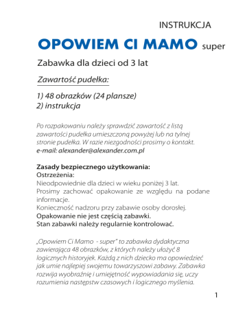 INSTRUKCJA OPOWIEM CI MAMO super Zabawka dla dzieci od 3 lat Zawartość pudełka: 1) 48 obrazków (24 plansze) 2) instrukcja Po rozpakowaniu należy sprawdzić zawartość z listą zawartości pudełka umieszczoną powyżej lub na tylnej stronie pudełka. W razie niezgodności prosimy o kontakt. e-mail: [email protected] Zasady bezpiecznego użytkowania: Ostrzeżenia: Nieodpowiednie dla dzieci w wieku poniżej 3 lat. Prosimy zachować opakowanie ze względu na podane informacje. Konieczność nadzoru przy zabawie osoby dorosłej. Opakowanie nie jest częścią zabawki. Stan zabawki należy regularnie kontrolować. „Opowiem Ci Mamo - super” to zabawka dydaktyczna zawierająca 48 obrazków, z których należy ułożyć 8 logicznych historyjek. Każdą z nich dziecko ma opowiedzieć jak umie najlepiej swojemu towarzyszowi zabawy. Zabawka rozwija wyobraźnię i umiejętność wypowiadania się, uczy rozumienia następstw czasowych i logicznego myślenia. 1 „Opowiem Ci Mamo super” to kolejna wersja zabawki dydaktycznej p.t. „Opowiem Ci Mamo”. 48 obrazków zawartych w pudełku tworzy 8 serii tematycznych, z których każda składa się z 6 obrazków. Zabawa polega na właściwym ułożeniu kart z obrazkami tak, aby powstała logiczna historyjka. Przed rozpoczęciem zabawy należy wysypać wszystkie obrazki na środek stołu. Następnie dziecko wybiera jeden dowolny obrazek i kładzie go przed sobą. Po jego analizie stara się znaleźć pasujący do niego następny obrazek. Tę czynność powtarza jeszcze czterokrotnie, tak by ułożona historyjka składała się z 6 obrazków (o jednakowym symbolu w prawym górnym rogu każdego z nich). W układzie kart bardzo ważna jest logiczna kolejność następujących po sobie zdarzeń przedstawionych na ilustracjach. W zabawie powinien uczestniczyć również rodzic lub nauczyciel. Spełnia on ważną rolę obserwatora i słuchacza, do którego zwraca się dziecko, które opowiada mu widzianą historyjkę, opisując co widzi na każdym obrazku po kolei. Zabawka uczy rozumienia następstw czasowych i logicznego myślenia, doskonali spostrzegawczość i analizę wzrokową. W zabawie może uczestniczyć kilkoro dzieci, które układają i opowiadają w kolejności swoje historyjki. 2 Obrazki ułożone pionowo w prawidłowej sekwencji 3 4 5 6 Przechowywanie: Produkt należy przechowywać w suchym pomieszczeniu, z dala od źródeł ciepła oraz w oryginalnym opakowaniu. Utylizacja: Po zakończeniu użytkowania usuwać zabawkę w sposób bezpieczny i z dbałością o środowisko Deklaracja WE: Produkt został oznaczony symbolem CE ponieważ jest zgodny z dyrektywą bezpieczeństwa zabawek. PRODUCENT: Z.P. „ALEXANDER” Piotr Pundzis 80 - 209 CHWASZCZYNO k/GDYNI, UL. TELEWIZYJNA 19 TEL./FAX 58 552 83 70, TEL. 58 552 87 27 Symbol 0-3 oznacza, że zabawka jest nieodpowiednia dla dzieci w wieku poniżej 3 lat. 7 8