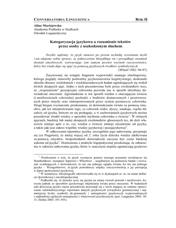 CONVERSATORIA L INGUISTICA ROK II Alina Maciejewska Akademia Podlaska w Siedlcach Ośrodek Logopedyczny Kategoryzacja językowa a rozumienie tekstów przez osoby z uszkodzonym słuchem Zwykle sądzimy, że język stanowi po prostu technikę wyrażania myśli i nie zdajemy sobie sprawy, że jednocześnie klasyfikuje on i porządkuje strumień doznań zmysłowych, wytwarzając tym samym pewien wycinek rzeczywistości, który bez trudu daje się ująć za pomocą językowych środków symbolicznych. (Whorf 1982: 96-97) Zacytowany na wstępie fragment wypowiedzi znanego etnolingwisty, którego poglądy stanowiły podwaliny językoznawstwa kognitywnego, doskonale określa obszary wieloletnich i wielokierunkowych badań ogniskujących się wokół dwóch skrajnych ujęć. Jedno z nich prezentowane było przez zwolenników tezy, że „wyposażenie” percepcyjne człowieka pozwala mu w sposób określony doświadczać otoczenie. Zgromadzona w ten sposób wiedza o otaczającym świecie (i możliwościach człowieka) pochodzi z bodźców dostarczonych i przetworzonych przez zmysły oraz zinterpretowanych przez system poznawczy człowieka. Drugi biegun wyznaczały przekonania, że doświadczanie świata za pomocą zmysłów, jak też interpretowanie tego, co człowiek widzi, słyszy, smakuje, wącha itd. zależy od języka, którym on się posługuje, a w zachowaniach językowych można poszukiwać źródeł wiedzy o sposobie myślenia człowieka o świecie 1. W różnych ujęciach, bardziej lub mniej skrajnych zwolenników głoszonych tez, do dziś właściwie istnieje spór o to, czy wiedza o świecie istnieje niezależnie od języka, a także jaki jest zakres wspólny wiedzy językowej i pozajęzykowej 2. W odkrywaniu tajemnicy języka, szczególnie jego nabywania, przyjmuje się (za Piagetem), że mniej więcej od 2. roku życia dziecka wiedza zdobywana za pomocą zmysłów, bezpośrednich doświadczeń zaczyna być coraz bardziej zależna od języka 3. Doniesienia z praktyki logopedycznej przekonują, że zaburzenia w zakresie nabywania języka, które w znacznym stopniu ograniczają językowe Przekonanie o tym, że język wyznacza granice naszego poznania zawdzięcza się Humboldtowi, następnie Sapirowi i Whorfowi – uogólnienie na podstawie badań i rozważań wynikających z doświadczeń, że nie ma jednego oglądu świata, bo nie ma jednego języka – Weisgerberowi, że język pośredniczy między rzeczywistością a jej percepcją w danej społeczności językowej. 2 W semantyce, leksykografii odzwierciedla się to w dyskusjach m. in. na temat definicji słownikowej i encyklopedycznej. 3 Podkreśla się, że dziecko uczy się języka na miarę swoich potrzeb i możliwości, korzysta jednak ze sposobów językowego objaśniania świata przez otoczenie. W badaniach nad akwizycją języka ciężar poszukiwań przesunął się z teorii mającej za zadanie opracowanie minimalistycznego repertuaru danych językowych (zwięzłości gramatycznej i najmniejszej liczby symboli) do gramatyki i umiejętności językowych wyprowadzanych z najbardziej ogólnych umiejętności i właściwości psychicznych, (por. Langacker 2003: 3031; Slobin 2003: 391-393). 1 I STUDIA I ROZPRAWY porozumiewanie się dziecka z otoczeniem, wpływają na zdolności poznawcze dziecka. Nawet jeśli potencjalne możliwości są duże, to deficyty językowe upośledzają funkcjonowanie społeczne, udział w kulturze i karierę szkolną, wybory życiowe. Znajomość mechanizmów mowy i rozwoju mowy, podobnie jak doświadczenia terapeutyczne przekonują też, że zaburzenia postrzegania, podobnie jak ograniczenie możliwości doświadczania świata (badania otoczenia przez dziecko od początku funkcjonowania zmysłów), powodują/mogą powodować trudności w opanowaniu systemu językowego i posługiwaniu się nim. Z zachowań dzieci z opóźnionym rozwojem mowy, dzieci autystycznych, czy też z zespołem Aspergera wiemy, że zarówno nadmiar bodźców zmysłowych, jak również niemożliwości ich uporządkowania, selekcji leży u podłoża trudności w rozumieniu i opanowaniu systemu językowego. Braki w zakresie kompetencji językowej potrafią zaburzyć rozwój dziecka, pomimo bardzo dobrego rokowania w zakresie jego możliwości poznawczych i innych sprawności. Uniemożliwiają zdobywanie nowych zakresów wiedzy, budowania struktury, dzięki której można tworzyć światy odległe od „tu i teraz”, wykonywać operacje intelektualne bez konieczności doświadczania świata, rozwiązywać zagadki bytu i kosmosu bez konieczności podróżowania. To dzięki językowi, który wraz z wiekiem i coraz pełniejszą swobodą w zakresie posługiwania się jego znakami i regułami, człowiek coraz skuteczniej działa w rzeczywistości pozajęzykowej. Ale też to język wyznacza jego myślenie, działanie, rozumienie siebie i otoczenia. Jest nie tylko narzędziem porozumiewania się, ale swoistym bytem, w którym człowiek funkcjonuje i który tworzy (Grabias 1997). Poglądy takie wpisane są w podstawy językoznawstwa kognitywnego, które (w odróżnieniu od językoznawstwa generatywnego) zakłada: bliski związek między strukturą i funkcją języka z jednej strony, a wiedzą i umiejętnościami pozajęzykowymi z drugiej. Można przypuszczać, że język będący zarówno tworem, jak i narzędziem ludzkiego poznania, odzwierciedla w swojej strukturze i działaniu ogólniejsze zdolności poznawcze. Do najważniejszych wśród nich należy właśnie zdolność kategoryzowania, tzn. zdolność dostrzegania podobieństwa w różnorodności. (Tylor 2001: 11) Przyjąć należy, że badanie procesów kategoryzacji dostarcza wiedzy o znaczeniu form językowych, jak również należy założyć, że strukturalne kategorie samego języka są analogiczne do kategorii, jakie postrzega człowiek w otaczającym go świecie 4. Kategoryzacja jest więc specyfiką ludzkiego umysłu i językowego działania, które pozwala wyłaniać strukt