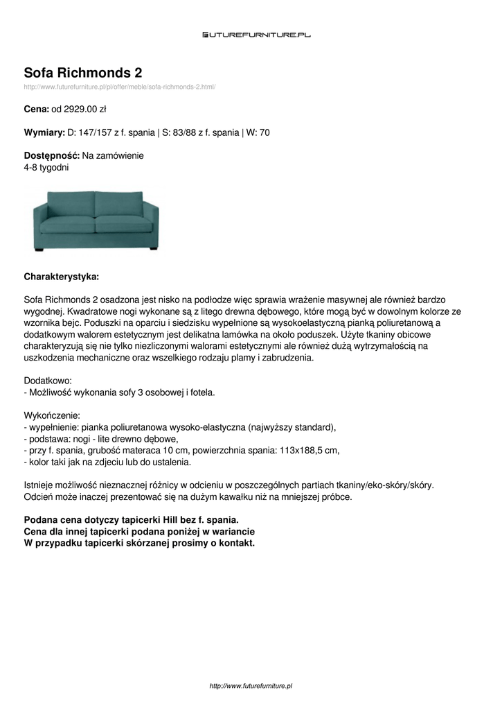 Sofa Richmonds 2 http://www.futurefurniture.pl/pl/offer/meble/sofa-richmonds-2.html/ Cena: od 2929.00 zł Wymiary: D: 147/157 z f. spania | S: 83/88 z f. spania | W: 70 Dostępność: Na zamówienie 4-8 tygodni Charakterystyka: Sofa Richmonds 2 osadzona jest nisko na podłodze więc sprawia wrażenie masywnej ale również bardzo wygodnej. Kwadratowe nogi wykonane są z litego drewna dębowego, które mogą być w dowolnym kolorze ze wzornika bejc. Poduszki na oparciu i siedzisku wypełnione są wysokoelastyczną pianką poliuretanową a dodatkowym walorem estetycznym jest delikatna lamówka na około poduszek. Użyte tkaniny obicowe charakteryzują się nie tylko niezliczonymi walorami estetycznymi ale również dużą wytrzymałością na uszkodzenia mechaniczne oraz wszelkiego rodzaju plamy i zabrudzenia. Dodatkowo: - Możliwość wykonania sofy 3 osobowej i fotela. Wykończenie: - wypełnienie: pianka poliuretanowa wysoko-elastyczna (najwyższy standard), - podstawa: nogi - lite drewno dębowe, - przy f. spania, grubość materaca 10 cm, powierzchnia spania: 113x188,5 cm, - kolor taki jak na zdjeciu lub do ustalenia. Istnieje możliwość nieznacznej różnicy w odcieniu w poszczególnych partiach tkaniny/eko-skóry/skóry. Odcień może inaczej prezentować się na dużym kawałku niż na mniejszej próbce. Podana cena dotyczy tapicerki Hill bez f. spania. Cena dla innej tapicerki podana poniżej w wariancie W przypadku tapicerki skórzanej prosimy o kontakt. http://www.futurefurniture.pl Dostępne wersje produktu: nazwa produktu Sofa Richmonds 2 warianty tapicerka: hill cena 2929.00zł dostępne 4-8 tygodni Sofa Richmonds 2 Funkcja spania (+700.00 zł) tapicerka: sofia 3234.00zł 4-8 tygodni Sofa Richmonds 2 Funkcja spania (+700.00 zł) tapicerka: orion 3050.00zł 4-8 tygodni Sofa Richmonds 2 Funkcja spania (+700.00 zł) tapicerka: stone 3289.00zł 4-8 tygodni Sofa Richmonds 2 Funkcja spania (+700.00 zł) tapicerka: cameleon 3356.00zł 4-8 tygodni Sofa Richmonds 2 Funkcja spania (+700.00 zł) tapicerka: vienna 3115.00zł 4-8 tygodni Sofa Richmonds 2 Funkcja spania (+700.00 zł) tapicerka: skóra 0.00zł naturalna barbaresco Zapytaj Sofa Richmonds 2 Funkcja spania (+700.00 zł) tapicerka: adamantio 3094.00zł 4-8 tygodni Sofa Richmonds 2 Funkcja spania (+700.00 zł) tapicerka: pepe 3113.00zł 4-8 tygodni Sofa Richmonds 2 Funkcja spania (+700.00 zł) tapicerka: persempra 3190.00zł 4-8 tygodni Sofa Richmonds 2 Funkcja spania (+700.00 zł) tapicerka: tokyo 3354.00zł 4-8 tygodni Sofa Richmonds 2 Funkcja spania (+700.00 zł) tapicerka: zero spot 3376.00zł 4-8 tygodni http://www.futurefurniture.pl nazwa produktu Sofa Richmonds 2 warianty Funkcja spania (+700.00 zł) tapicerka: million cena dostępne 4038.00zł 4-8 tygodni Funkcja spania (+700.00 zł) http://www.futurefurniture.pl Zdjęcia produktu: http://www.futurefurniture.pl Powered by TCPDF (www.tcpdf.org)