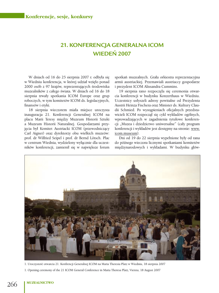 Konferencje, sesje, konkursy 21. KONFERENCJA GENERALNA ICOM WIEDEŃ 2007 W dniach od 16 do 25 sierpnia 2007 r. odbyła się w Wiedniu konferencja, w której udział wzięło ponad 2000 osób z 97 krajów, reprezentujących środowiska muzealników z całego świata. W dniach od 16 do 18 sierpnia trwały spotkania ICOM Europe oraz grup roboczych, w tym komitetów ICOM ds. legislacyjnych, finansów i etyki. 18 sierpnia wieczorem miała miejsce uroczysta inauguracja 21. Konferencji Generalnej ICOM na placu Marii Teresy między Muzeum Historii Sztuki a Muzeum Historii Naturalnej. Gospodarzami przyjęcia był Komitet Austriacki ICOM (przewodniczący Carl Aigner) oraz dyrektorzy obu wielkich muzeów: prof. dr Wilfried Seipel i prof. dr Bernd Lötsch. Plac w centrum Wiednia, wydzielony wyłącznie dla uczestników konferencji, zamienił się w największe forum spotkań muzealnych. Grała orkiestra reprezentacyjna armii austriackiej. Przemawiali austriaccy gospodarze i prezydent ICOM Alissandra Cummins. 19 sierpnia rano rozpoczęła się ceremonia otwarcia konferencji w budynku Konzerthaus w Wiedniu. Uczestnicy usłyszeli adresy powitalne od Prezydenta Austrii Heinza Fischera oraz Minister ds. Kultury Claudii Schmied. Po wystąpieniach oficjalnych przedstawicieli ICOM rozpoczął się cykl wykładów ogólnych, wprowadzających w zagadnienia tytułowe konferencji „Muzea i dziedzictwo uniwersalne” (cały program konferencji i wykładów jest dostępny na stronie: www. icom.museum). Dni od 19 do 22 sierpnia wypełnione były od rana do późnego wieczora licznymi spotkaniami komitetów międzynarodowych i wykładami. W budynku głów- 1. Uroczystość otwarcia 21. Konfrencji Generalnej ICOM na Maria Theresia Platz w Wiedniu, 18 sierpnia 2007 1. Opening ceremony of the 21 ICOM General Conference in Maria Theresa Platz, Vienna, 18 August 2007 266 MUZEALNICTWO Konferencje, sesje, konkursy nym Uniwersytetu Wiedeńskiego zorganizowano także „Targi Muzealne”, na których zaprezentowano wiele współczesnych osiągnięć technicznych pomocnych w pracy w muzeum, w tym m.in. oprogramowania do dokumentacji muzealnej włącznie z mappingiem satelitarnym dla archeologów, zaawansowane urządzenia do monitoringu klimatu, pomoce wizualne do celów edukacyjnych, systemy rezerwacji oraz druku biletów itp. Streszczenie wygłaszanych referatów, ze względu na różnorodność tematyki, jest niemożliwe, warto jednak wspomnieć wypowiedź Patricka Boylana: Copyright and Intelectual Property Wright (Prawa autorskie i prawa własności intelektualnej), znakomicie porządkującą zagadnienie praw autorskich na użytek muzeów, z uwzględnieniem różnic między prawodawstwem różnych krajów. 2. Organizatorzy otwarcia 21. Konferencji Generalnej ICOM w Wiedniu – stoją od lewej: Dr Carl Aigner, prezydent ICOM-Austria; Armine Wehdorn, sekretarz ICOM – Austria; Günther Dembski, Przewodniczący Komitetu Doradczego ICOM; Alissandra Cummins, Prezydent ICOM; prof. dr Wilfried Seidel, dyrektor Kunsthistorisches Museum w Wiedniu; prof. dr Bernd Lötsch, dyrektor Naturhistorisches Museum w Wiedniu. 2. Organisers of the opening of the 21 ICOM General Conference in Vienna – standing to the left: Dr. Carl Aigner, President ICOM-Austria; Armine Wehdorn, Secretary of ICOM – Austria; Günther Dembski, Chairman of the ICOM Advisery Committee; Alissandra Cummins, President of ICOM; Prof. Dr. Wilfried Seidel, Director of Kunsthistorisches Museum in Vienna; Prof. Dr. Bernd Lötsch, Director of Naturhistorisches Museum in Vienna (Wszystkie fot. Dorota Folga-Januszewska) MUZEALNICTWO 267 Konferencje, sesje, konkursy Ważnym wydarzeniem było spotkanie, pierwsze w historii konferencji ICOM, z WAMO (National Museum Associations) – kongresem narodowych stowarzyszeń muzealnych, zorganizowane 20 sierpnia w Muzeum Sztuki Ludowej w Wiedniu. Powstał projekt stałego porozumienia, a nawet afiliacji WAMO przy ICOM, co byłoby bardzo pomocne w wymianie informacji także wśród osób nie będących członkami ICOM. 22 sierpnia odbyło się posiedzenie CEICOM (Central European ICOM Group), z zaproszonymi w imieniu Polskiego Komitetu Narodowego ICOM gośćmi – przewodniczącym ICOM Europe Udo Gösswaldem oraz przedstawicielami muzeów krajów byłej Jugosławii. Co do dwóch z wielu omawianych kwestii sformułowane zostały następujące dezyderaty: xWniosek wspólny komitetów narodowych wschodzących w skład CEICOM do prezydenta ICOM o racjonalizację finansowania oraz zobowiązanie, że składki członkowskie podnoszone będą tylko co 3 lata, a decyzja podejmowana w czasie konferencji (nie corocznie). xKomitety narodowe wspomogą działania i złożą propozycje rozstrzygnięcia konfliktów dotyczących zaginionego i przemieszczonego dziedzictwa między państwami w tym rejonie. Wyrażona została m.in. wola stworzenia standardów postępowania muzeów w sytuacjach konfliktowych, jak np. między Polską a Niemcami po 1945 roku. 23 sierpnia przeznaczony był na zwiedzanie Wiednia i wycieczki. 24 sierpnia rano odbyła się sesja zamykająca Konferencję Generalną. Ogłoszono wyniki wyborów – prezydentem ICOM na lata 2007-2010 została ponownie Alissandra Cummins. Gorącą dyskusję wzbudziły poszczególne punkty rezolucji końcowej, zwłaszcza punkt proponujący zmianę (modernizację) trybu pracy Komitetu Doradczego i rozszerzenie jego kompetencji, a także postulaty utworzenia stałego forum dialogu między komitetami narodowymi (poprzez Internet), zwiększenia znaczenia komitetów narodowych, reformy przebiegu konferencji generalnej ICOM oraz utworzenia portalu „museum” promującego działalność ICOM również wśród osób nie będących jego członkami. Oklaskami przyjęte zostało sprawozdanie finansowe ICOM, który począwszy od 2005 r. notuje stałą poprawę budżetu i bilansowania wydatków. ICOM jest obecnie największą organizacją pozarządową w dziedzinie kultury i muzealnictwa, skupiającą prof