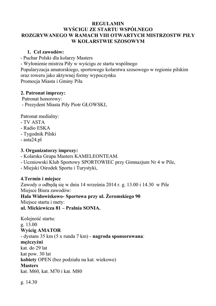 REGULAMIN WYŚCIGU ZE STARTU WSPÓLNEGO ROZGRYWANEGO W RAMACH VIII OTWARTYCH MISTRZOSTW PIŁY W KOLARSTWIE SZOSOWYM 1. Cel zawodów: - Puchar Polski dla kolarzy Masters - Wyłonienie mistrza Piły w wyścigu ze startu wspólnego Popularyzacja amatorskiego, sportowego kolarstwa szosowego w regionie pilskim oraz roweru jako aktywnej formy wypoczynku Promocja Miasta i Gminy Piła 2. Patronat imprezy: Patronat honorowy: - Prezydent Miasta Piły Piotr GŁOWSKI, Patronat medialny: - TV ASTA - Radio ESKA - Tygodnik Pilski - asta24.pl 3. Organizatorzy imprezy: - Kolarska Grupa Masters KAMELEONTEAM. - Uczniowski Klub Sportowy SPORTOWIEC przy Gimnazjum Nr 4 w Pile, - Miejski Ośrodek Sportu i Turystyki, 4.Termin i miejsce Zawody o odbędą się w dniu 14 września 2014 r. g. 13.00 i 14.30 w Pile Miejsce Biura zawodów: Hala Widowiskowo- Sportowa przy ul. Żeromskiego 90 Miejsce startu i mety: ul. Mickiewicza 81 – Pralnia SONIA. Kolejność startu: g. 13.00 Wyścig AMATOR - dystans 35 km (5 x runda 7 km) - nagroda sponsorowana: mężczyźni kat. do 29 lat kat pow. 30 lat kobiety OPEN (bez podziału na kat. wiekowe) Masters kat. M60, kat. M70 i kat. M80 g. 14.30 Wyścig główny o Tytuł Szosowego Mistrza Piły - dystans 49 km (7 x runda 7 km). : Masters kat. M30, kat. M40, kat. M50, CM (cyklosport mężczyzn), CK (cyklosport kobiet) W trakcie wyścigu głównego przewidziano trzy lotne premie - po drugim, czwartym i szóstym okrążeniu, nagrodzone przez sponsorów, oraz nagrodę dla najaktywniejszego. Punktacja najaktywniejszego kolarza: - 1 miejsce 3 pkt, 2 miejsce 2 pkt i 3 miejsce 1 pkt . Trasa przebiega ulicami: Mickiewicza, Koszalińska, Paderewskiego, Matejki, Chopina, Wojska Polskiego, Konarskiego, Ceglana, Podgórna, Mickiewicza. Patrz mapa. Długość rundy 7 km. Wyścig zostanie przeprowadzony zgodnie z przepisami PZKol. dot. kolarstwa szosowego i niniejszym Regulaminem. Na wszystkich wyścigach będzie elektroniczny pomiar czasu. Zawodnicy zobowiązani są do wpłacenia kaucji za chipy w wysokości 20 zł, w trakcie pobierania numerów startowych. Po wyścigu po zdaniu numerów i chipów kaucja zostanie zwrócona. 5. Podział na kategorie wiekowe wg. PZKol. (dotyczy posiadaczy licencji kolarskiej) - Kobiety: - CK 18-29 lat, - K30 30-39 lat - K40 40+ lat Mężczyzni: - CM 18-29 lat, - M30 30-39 lat, - M40 40-49 lat, - M50 50-59 lat, - M60 60-69 lat, - M70 70-79 lat, - M80 80 + lat. 6. Zgłoszenia. Zgłoszenia zaleca się wykonać droga elektroniczną, w tym celu należy wypełnić formularz zgłoszeniowy dostępny na stronie internetowej organizatora: www.kameleonteam.pl. Zgłoszenie może odbyć się także w Biurze zawodów w niedzielę 14 września w godzinach 07.00-08.30, ale wiąże się to z wyższą opłatą startową. W innych godzinach zgłoszenia nie będą przyjmowane. Organizator ustalił limit zgłoszeń na 150 uczestników na każdy wyścig. Decyduje pierwszeństwo wpłaty startowego na konto organizatora, potwierdzające zgłoszenie do startu w imprezie. Przesłanie formularza zgłoszeniowego i udostępnienie swojego adresu e-mail jest równoznaczne z wyrażeniem zgody na otrzymywanie od Organizatora drogą elektroniczną informacji handlowej w rozumieniu ustawy o świadczeniu usług drogą elektroniczną. Wysyłając jak i podpisując w Biurze zawodów formularz uczestnik wyraża zgodę na przetwarzanie swoich danych osobowych zgodnie z Ustawą z dnia 27. 08. 1997 o Ochronie Danych Osobowych ( Dz. U. Nr 133 poz.883 ). Wpisowe należy wpłacić na konto organizatora do dnia 05. 09.2013, z dopiskiem: Wyścig AMATOR/ Wyścig GŁÓWNY, imię i nazwisko zawodnika/ów, lub w dniu zawodów konto bankowe: Bank BGŻ Oddział Piła BGŻ S.A. 87 2030 0045 1110 0000 0222 5950 Za datę wpłaty wpisowego przyjmuje się dzień wpłynięcia wpisowego na konto organizatora Wpisowe wynosi 35,00 zł za każdy start w wyścigu. Wpisowe w dniu wyścigu wynosi 40,00 zł. ORGANIZATOR DOPUSZCZA MOŻLIWOŚĆ ZWROTU OPŁATY STARTOWEJ W WYSOKOŚCI 50% OPŁATY W PRZYPADKU REZYGNACJI ZE STARTU UCZESTNIKA, JEŻELI O REZYGNACJI POWIADOMI ORGANIZATORA NIE PÓZNIEJ NIŻ DO DNIA 10 WRZEŚNIA 2014 ROKU WŁĄCZNIE. Potwierdzenie wpłaty należy przedstawić na żądanie obsługi w biurze zawodów. Wpłata startowego jest możliwa również w dniu zawodów w Biurze Wyścigu. W ramach wpisowego organizator zapewnia: - podstawową opieką medyczną na trasie wyścigu, - elektroniczny pomiar czasu, - ubezpieczenie OC zawodów, - poczęstunek po wyścigu - puchary dla zdobywców pierwszych trzech miejsc. 7. Uczestnictwo W wyścigach ze startu wspólnego mogą startować zawodnicy i zawodniczki posiadający ważną licencje na rok 2014 Mastersi w latach 1982 i starsi oraz zawodnicy kat. Cyklosport ur. w latach 1983 – 1996, oraz amatorzy. Niezrzeszeni na podstawie oświadczeń uczestnika, młodzież niepełnoletnia za pisemną zgodą rodziców. 8.Bezpieczeństwo Wyścigi ze startu wspólnego będzie odbywał się przy ograniczonym ruchu drogowym. Trasę zabezpieczą funkcjonariusze Policji, Straży Miejskiej oraz strażacy Ochotniczej Straży Pożarnej, którzy w punktach kolizyjnych będą kierowali ruchem drogowym i dbali o bezpieczeństwo kolarzy. Kierowcy pojazdów są zobowiązani podporządkować się poleceniom Komisji Sędziowskiej, organizatora wyścigu i służbom porządkowym Kierowcy uczestniczący w wyścigu są zobowiązani do naklejenia otrzymanych oznakowań: - pojazdy organizatora wyścigu – biały pasek czerwone litery – ORGANIZATOR 1 - 3 - pojazdy Komisji Sędziowskiej- czerwony pasek, białe litery – JURY1 - 3 - pojazdy mediów – na zielonym tle czarne litery – MEDIA 1 - 6 9. ORGANIZATOR KATEGORYCZNIE ZABRANIA JAZDY PO TRASIE WYSCIGU KOLARZOM AKTUALNIE NIE BIORĄCYM UDZIAŁU W CZASIE Z ICH TRWANIA. ZAWODNIK ZAUWAŻONY NA TRASIE WYŚCIGU MOŻE NIE ZOSTAĆ DOPUSZCZONY DO ZAWODÓW LUB BĘDZIE ZDYSKWALIFIKOWANY 10.Nagrody Zwycięzca wyścigu głównego w kat. OPEN otrzyma puchar i kos