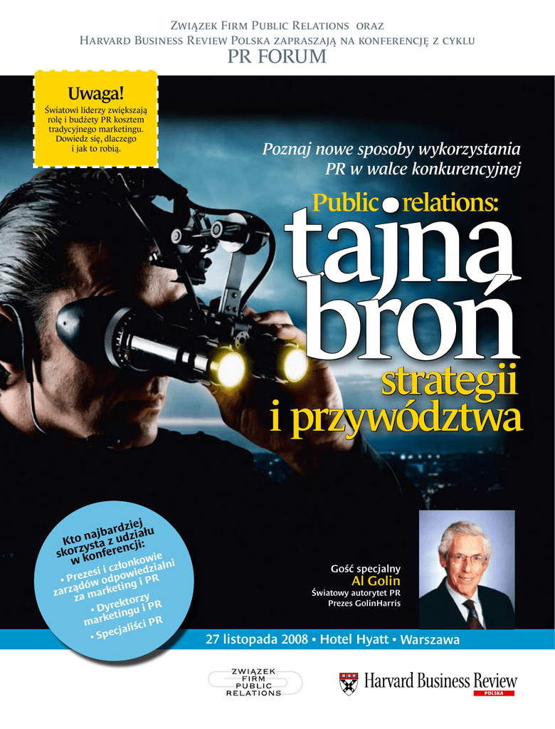 Związek Firm Public Relations oraz Harvard Business Review Polska zapraszają na konferencję z cyklu PR FORUM Uwaga! Światowi liderzy zwiększają rolę i budżety PR kosztem tradycyjnego marketingu. Dowiedz się, dlaczego i jak to robią. Poznaj nowe sposoby wykorzystania PR w walce konkurencyjnej tajna broń Public relations: strategii i przywództwa dzieaj łu r a b j na z udzi Kto y sta ncji: skorzkonfere e w kowialni i człon z wied zesi i • Pre ów odpo g i PR d tin zarzą a marke z rzy ekto • Dyrtingu i PR e PR mark liści a j c e • Sp Gość specjalny Al Golin Światowy autorytet PR Prezes GolinHarris 27 listopada 2008 • Hotel Hyatt • Warszawa konferencja z cyklu pr fo ru m 2 7 l i stopa da 2008 • Hote l Hyatt • Wars z aw a Uczyń public relations efektywnym narzędziem osiągania celów biznesowych Każda firma musi posiadać zdolność efektywnego komunikowania się z otoczeniem. To podstawowa sprawa w zakresie osiągania celów sprzedażowych, budowy wizerunku marki czy zarządzania relacjami z inwestorami. Oto złe wiadomości: efektywność tradycyjnych narzędzi komunikacji, takich jak reklama czy komunikacja bezpośrednia, ciągle spada. Dlaczego? Ponieważ pojawia się coraz więcej mediów, kanałów dotarcia oraz postępuje ich fragmentaryzacja. Pojawiają się nowe przestrzenie komunikacji, takie jak Web 2.0 czy telefonia komórkowa. W tym otoczeniu rośnie rola wiarygodnych form przekazu opartych na opiniach innych (użytkowników, niezależnych mediów, społeczności internetowych). Public relations jest znakomitym narzędziem do tworzenia takich właśnie form przekazu. Sukces wymaga jednak zastosowania tradycyjnych metod PR w nowoczesnej formie, zgodnej z obecnymi realiami mediów i społecznych form komunikacji. Czego się dowiesz podczas konferencji: ■ Poznasz sposoby działania w zakresie komunikacji, ■ Odkryjesz nowe obszary komunikacji społecznej, które zyskały obecnie na efektywności ■ ■ ■ ■ w których twoja firma powinna być obecna Dowiesz się, jak stosować tradycyjne metody PR w nowym otoczeniu komunikacyjnym Poznasz narzędzia PR 2.0 i sposoby ich integracji w ramach szerszej strategii komunikacji wspierającej strategię firmy Odkryjesz nowe możliwości wykorzystania PR w praktyce przewodzenia i zarządzania Otrzymasz spójne wzory w zakresie etycznego postępowania 40% dla zniżki w HBRP ó erator prenum nków ZFPR i czło Al Golin Al Golin jest osobowością branży public relations już od 50 lat. Jest prezesem firmy GolinHarris w Chicago, która niezmienie, od 45 lat, obsługuje firmę McDonald’s oraz reprezentuje takie firmy, jak: Bristol-Myers Squibb, Florida Department of Citrus, Levi Strauss & Co., National Peanut Board, Nestlé, Nintendo of America, Owens Corning, Sprint, Texas Instruments, Toyota Motor Sales of America. Jako konsultant amerykańskiego Departamentu Handlu Al Golin opracowywał również programy PR, których celem było podniesienie świadomości korzyści z eksportu wśród amerykańskich firm i tym samym poprawa stanu gospodarki, wzrost zatrudnienia oraz ograniczenie deficytu handlowego kraju. Al Golin wykładał na Princeton University, Dartmouth College, Yale University, Northwestern University, New York University oraz Annenberg Communication School w USC. Został nagrodzony za całokształt osiągnięć przez Public Relations Society of America, Publicity Club of Chicago oraz magazyn Inside PR. Od magazynu branżowego PR Week otrzymał tytuł „jednej ze 100 najbardziej wpływowych osób XX wieku w public relations”. Jego książka Trust or consequences jest jedną z najważniejszych książek na temat PR tej dekady. program konferencji 9.30 - 10.00 To może stać się każdemu: Giełda nasłuchuje, jak bije serce Jobsa Powitanie Paweł Trochimiuk (ZFPR), Witold Jankowski (HBRP) 10.00 - 11.00 Time to get real Al Golin (prezes GolinHarris) 11.00 - 11.45 Komunikacja i PR według CEO Moderator: Paweł Trochimiuk (ZFPR) 11.45 - 12.00 Przerwa kawowa 12.00 - 13.00 Nowe trendy: Hoaxing - przykład świadomego i zaplanowanego wprowadzania w błąd opinii publicznej przez media - spektakularne przykłady Philippe Dutilleul (przedstawiciel belgijskiej telewizji RTBF, autor prowokacji o rozpadzie kraju), przedstawiciel mediów, moderator: Joanna Delbar (ZFPR) 13.00 - 14.00 Lunch 14.00-14.45 Świat Web 2.0 i jego wpływ na komunikację Witold Jankowski (redaktor naczelny HBRP) 14.45 - 15.30 Różne modele przywództwa a PR Wprowadzenie i podsumowanie: przedstawiciel (HBRP), dwóch gości/liderów reprezentujących różne typy przywódców, Adam Łaszyn (ekspert ds. wizerunku) 15.30 - 15.45 Przerwa kawowa 15.45 - 16.30 Trudne decyzje w komunikacji i pragmatyczna etyka Moderator: Antoni Mielniczuk, goście: Kazimierz Sowa (ReligiaTV), Waldemar Rydzak (Prelite) 16.30 - 17.15 Akcje Apple na piątkowej giełdzie gwałtownie poszły w dół. Powód – rzekomy zawał serca współzałożyciela i prezesa firmy Steve'a Jobsa. Gdy się okazało, że umieszczona w internecie informacja jest nieprawdziwa, notowania szybko wzrosły. „Informacja”, jaka pojawiła się na społecznościowej stronie iReport, prowadzonej przez CNN, brzmiała: „Jobs został kilka godzin temu odwieziony na oddział intensywnej terapii z powodu rozległego zawału”. W ciągu 10 minut notowania Apple spadły o 10 procent. Gdy plotkę zdementowano, poszły w górę i przez większość sesji utrzymywały się już na wyrównanym poziomie. Rzecznik firmy nie chciał zadeklarować, czy Apple podejmie jakieś kroki w związku z incydentem. Fałszywe doniesienie zostało przez CNN zdjęte z iReport. „Treści na iReport.com są w całości generowane przez użytkowników” – wytłumaczyła firma w oświadczeniu, informując o wykasowaniu wiadomości i zablokowaniu konta użytkownika, który ją tam umieścił. Treści te nie są przed publikacją redagowane ani cenzurowane. Rzeczniczka Jennifer Martin poinformowała, że C