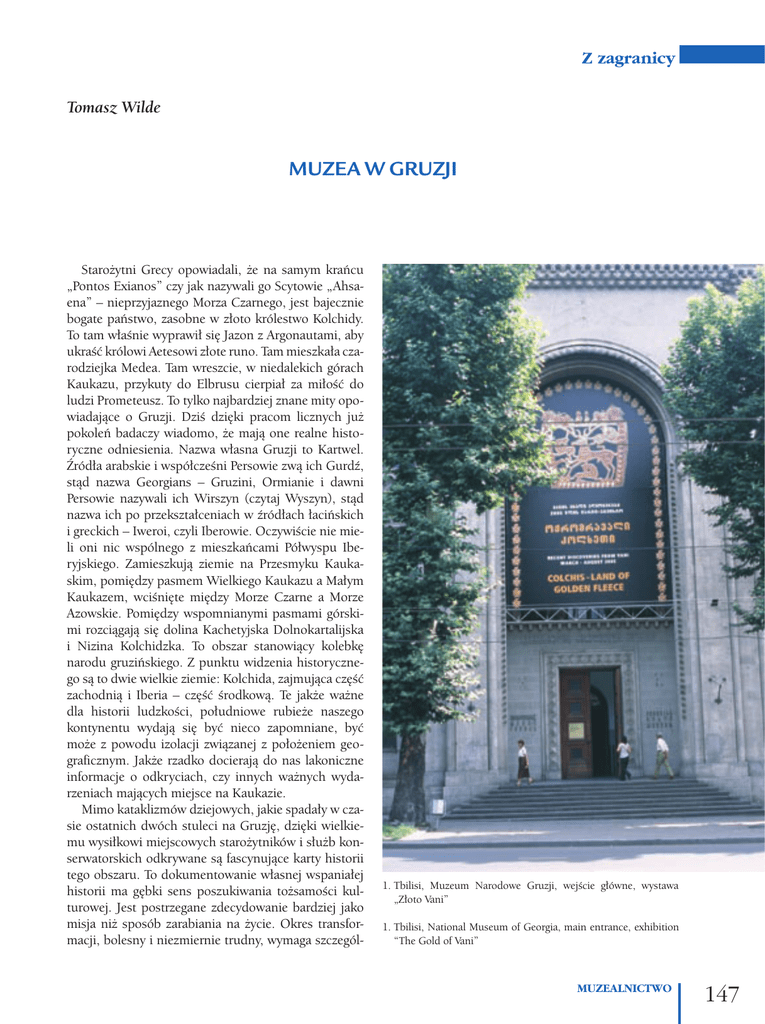 Z zagranicy Tomasz Wilde MUZEA W GRUZJI Starożytni Grecy opowiadali, że na samym krańcu „Pontos Exianos” czy jak nazywali go Scytowie „Ahsaena” – nieprzyjaznego Morza Czarnego, jest bajecznie bogate państwo, zasobne w złoto królestwo Kolchidy. To tam właśnie wyprawił się Jazon z Argonautami, aby ukraść królowi Aetesowi złote runo. Tam mieszkała czarodziejka Medea. Tam wreszcie, w niedalekich górach Kaukazu, przykuty do Elbrusu cierpiał za miłość do ludzi Prometeusz. To tylko najbardziej znane mity opowiadające o Gruzji. Dziś dzięki pracom licznych już pokoleń badaczy wiadomo, że mają one realne historyczne odniesienia. Nazwa własna Gruzji to Kartwel. Źródła arabskie i współcześni Persowie zwą ich Gurdź, stąd nazwa Georgians – Gruzini, Ormianie i dawni Persowie nazywali ich Wirszyn (czytaj Wyszyn), stąd nazwa ich po przekształceniach w źródłach łacińskich i greckich – Iweroi, czyli Iberowie. Oczywiście nie mieli oni nic wspólnego z mieszkańcami Półwyspu Iberyjskiego. Zamieszkują ziemie na Przesmyku Kaukaskim, pomiędzy pasmem Wielkiego Kaukazu a Małym Kaukazem, wciśnięte między Morze Czarne a Morze Azowskie. Pomiędzy wspomnianymi pasmami górskimi rozciągają się dolina Kachetyjska Dolnokartalijska i Nizina Kolchidzka. To obszar stanowiący kolebkę narodu gruzińskiego. Z punktu widzenia historycznego są to dwie wielkie ziemie: Kolchida, zajmująca część zachodnią i Iberia – część środkową. Te jakże ważne dla historii ludzkości, południowe rubieże naszego kontynentu wydają się być nieco zapomniane, być może z powodu izolacji związanej z położeniem geograficznym. Jakże rzadko docierają do nas lakoniczne informacje o odkryciach, czy innych ważnych wydarzeniach mających miejsce na Kaukazie. Mimo kataklizmów dziejowych, jakie spadały w czasie ostatnich dwóch stuleci na Gruzję, dzięki wielkiemu wysiłkowi miejscowych starożytników i służb konserwatorskich odkrywane są fascynujące karty historii tego obszaru. To dokumentowanie własnej wspaniałej historii ma gębki sens poszukiwania tożsamości kulturowej. Jest postrzegane zdecydowanie bardziej jako misja niż sposób zarabiania na życie. Okres transformacji, bolesny i niezmiernie trudny, wymaga szczegól- 1. Tbilisi, Muzeum Narodowe Gruzji, wejście główne, wystawa „Złoto Vani” 1. Tbilisi, National Museum of Georgia, main entrance, exhibition “The Gold of Vani” MUZEALNICTWO 147 Z zagranicy 2. Vani, prace wykopaliskowe, eksploracja grobu dziecięcego 2. Vani, excavations, exploration of a child’s grave nego stosunku do tradycji, wielkiego oddania i pasji, poczucia głębokiej misji. Charyzmy. Poczucie głębokiego związku z przeszłością oraz opresja historyczna ukształtowały zupełnie szczególne podejście do własnej historii, które, co istotne, odbija się na obrazie muzealnictwa. Fakt przynależności do tej ziemi jest głęboko zakorzeniony w świadomości Gruzinów, zarówno tych bardzo prostych, jaki i tych wykształconych, pochodzących ze starych, szlacheckich rodzin, w których z pokolenia na pokolenie przekazywano poczucie odpowiedzialności za ojczyznę. Pomimo niezwykle trudnych warunków życia, bardzo niewiele osób decyduje się na emigrację za granicę, uważając, że tu właśnie jest mimo wszystko ich miejsce na ziemi. Mimo krótkiego czasu jaki upłynął od początku transformacji, pojawiły się nowe, nowoczesne koncepcje funkcjonowania muzealnictwa w tym kraju. Interesującym przykładem odnalezienia się w nowej sytuacji jest Muzeum Narodowe Gruzji. Dyrektor Muzeum Narodowego, prof. Dawid Lordkipanidze, naukowiec o dużym dorobku, jest również nowoczesnym menażerem. Zdaniem jego nowoczesny dyrektor muzeum musi umieć porozumieć się z ludźmi władzy i biznesu, żeby pozyskiwać fundusze na egzystencję i rozwój muzeum. Lordkipanidze twierdzi też, że 3. Vani, pracownia muzealna, fragmenty glinianych naczyń w trakcie opracowywania 3. Vani, museum workshop, fragments of clay vessels in the course of examination 148 MUZEALNICTWO muzeum w obecnej sytuacji ma znacznie większe szanse bycia „kreatywną” placówką naukową niż instytuty naukowe, zatrudniające wielu ludzi myślących w sposób tradycyjny. Placówki tego typu skazane są na ograniczony budżet państwowy, muzeum zaś ma ogromny potencjał „przełożenia na media”, dzięki możliwości tworzenia ciekawych wystaw, ściągających wielu widzów, prasę, telewizję itp. To zainteresowanie z kolei daje szansę znalezienia sponsorów finansujących projekty badawcze. Profesor Lordkipanidze prowadzi rzeczywiście niesłychanie interesujące prace wykopaliskowe o randze światowej. Odkrycia na stanowisku Dmanisi w południowej części Gruzji, oddalonym od Tbilisi o 85 km, zmieniły w sposób istotny wiedzę o prahistorii człowieka. Udowodniły, że istoty praludzkie, hominidy zamieszkiwały Europę już 1,8 mln lat temu. Z tej racji uważane są za jedne z najważniejszych paleoantropologicznych wykopalisk. Każde nowe znalezisko na tym stanowisku, jak tegoroczne odkrycie 3 czaszek, przyciąga uwagę opinii publicznej całego świata – m.in. magazyn „National Geographic” poświęcił temu odkryciu obszerny artykuł. Dzięki opracowaniu ciekawego projektu badawczego i promocji światowej udało się pozyskać potrzebne fundusze na prowadzenie dal- Z zagranicy szych prac badawczych oraz na wyposażenie ekspedycji, m.in. od Towarzystwa National Geographic. W 2004 r. projekt Dmanisi wygrał w prestiżowym konkursie zorganizowanym przez Rolexa. Grant wyniósł ponad 100 000 USD. Suma ta zasiliła fundusz przeznaczony na badania, a także na wzniesienie ze stali i szkła konstrukcji o powierzchni ponad 2000 m² przykrywających stanowisko, co ochroni je przed zniszczeniem. Da to również możliwość prowadzenia prac badawczych przez cały rok. Planowane jest wytyczenie trasy wycieczkowej oraz wybudowanie pomieszcz