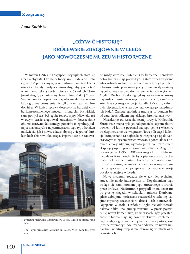 Z zagranicy Anna Kucińska „OŻYWIĆ HISTORIĘ” KRÓLEWSKIE ZBROJOWNIE W LEEDS JAKO NOWOCZESNE MUZEUM HISTORYCZNE W marcu 1996 r. na Wyspach Brytyjskich stała się rzecz niebywała. Oto na północy kraju, z dala od stolicy, w dość prozaicznym, przemysłowym mieście Leeds otwarto okazały budynek muzealny, aby pomieścić w nim wydzieloną część zbiorów Królewskich Zbrojowni Anglii, przeniesionych tu z londyńskiej Tower. Wydarzenie to, poprzedzone społeczną debatą, wywołało ogromne poruszenie nie tylko w muzealnym środowisku. W końcu sprawa dotyczyła najbardziej chyba konserwatywnego muzeum monarchii brytyjskiej, sam pomysł zaś był zgoła rewolucyjny. Niewielu też w owym czasie znajdował entuzjastów. Powszechnie oburzał zarówno fakt samego podziału integralnej, jednej z najstarszych i najcenniejszych tego typu kolekcji na świecie, jak i nowa, zdawałoby się „niegodna” królewskich zbiorów lokalizacja. Pojawiło się nie zadawa- 1. Muzeum Królewskie Zbrojownie w Leeds. Widok od strony rzeki Aire 1. The Royal Armouries Museum in Leeds. View from the river Aire 140 MUZEALNICTWO ne nigdy wcześniej pytanie: Czy bezcenne, narodowe dobra kultury mają prawo być na stałe przechowywane gdziekolwiek indziej niż w Londynie? Dotąd problem ich dostępności poza metropolią rozwiązywały wystawy wypożyczane czasowo do muzeów w innych regionach Anglii1. Dochodziły do tego głosy sprzeciwu ze strony najbardziej zainteresowanych, czyli badaczy i miłośników historycznego uzbrojenia, dla których gwałtem była decentralizacja zasobu stanowiącego przedmiot ich badań. Zresztą, zgodnie z tradycją, to Londyn był od zarania ośrodkiem angielskiego bronioznawstwa2. Niezależnie od wszechobecnej krytyki, Królewskie Zbrojownie trzeba było jednak podzielić, ogrom zbioru bowiem od lat nie pozwalał na jego pełne i właściwe wyeksponowanie we wnętrzach Tower. Ta część kolekcji, którą uznano za najbardziej integralną z jej dotychczasowym miejscem przechowywania pozostała w Londynie. Zbiory artylerii, wymagające dużych przestrzeni ekspozycyjnych, przeniesiono na południe Anglii do otwartego w 1995 r. XIX-wiecznego Fortu Nelsona, niedaleko Portsmouth. To była pierwsza odsłona dramatu. Rok później nastąpił bolesny finał, kiedy ponad 35 000 obiektów, po znakomicie zaplanowanej i sprawnie przeprowadzonej przeprowadzce, znalazło swoje docelowe miejsce w Leeds. Nowe muzeum, rodzące się w tak nieprzychylnej aurze, nie miało łatwego startu. Dopełnieniem tego wydaje się sam moment jego uroczystego otwarcia przez królową. Niefortunnie przypadł on na dzień tuż po głośnej tragedii w szkockim mieście Dunblane, gdzie uzbrojony mężczyzna rozstrzelał w szkolnej sali gimnastycznej szesnaścioro dzieci i ich nauczyciela. Pogrążona w szoku i żałobie Anglia nie odnotowała należycie faktu inauguracji muzeum. W prasie pojawiły się nawet komentarze, że w czasach, gdy przestępczość z bronią staje się coraz większym problemem, rząd wydaje ogromne pieniądze na muzea poświęcone „sztuce przemocy”. Nie trzeba dodawać, że nawet najbardziej ambitny projekt nie obroni się w takich okolicznościach. Z zagranicy 2. Hol główny, tzw. Ulica – przestrzeń łącząca wszystkie kondygnacje i galerie muzeum 2. The main hall, so-called Street – space connecting all the storeys and galleries of the museum * * * Dziś, po bez mała dekadzie od rozpoczęcia działalności, Królewskie Zbrojownie w Leeds są doskonale funkcjonującym, tętniącym życiem, nowoczesnym muzeum. Kierujący placówką Guy Wilson, pomysłodawca i organizator całego przedsięwzięcia, zdołał przezwyciężyć początkowe trudności3 i ostatecznie ucieleśnić swoją wizję. W ciągu kilku lat od momentu zapadnięcia decyzji o podziale londyńskich zbiorów zespół ludzi, których Wilsonowi udało się przekonać do swojego śmiałego pomysłu i „zarazić” entuzjazmem, pracował nad kształtem nowego muzeum. Świadomy potrzeby ścisłej współpracy wszystkich zaangażowanych, Wilson kładł ogromny nacisk na dialog między projektantami, kuratorami i konsultantami, tak aby efekt finalny nie okazał się wynikiem często rozbieżnych ambicji i dążeń poszczególnych indywidualności, ale spójną całością, podporządkowaną nadrzędnemu celowi – czyli stworzeniu najodpowiedniejszej oprawy dla powierzonej mu kolekcji. Jeśli chce się osiągnąć optymalny rezultat – pisał – trzeba wskoczyć w ten ocean chaosu razem ze swoim zespołem i poprowadzić go tam dokąd się zmierza. To twoja wizja, twoje zaangażowanie i determinacja będą ich inspirować: sami nie mogą tego robić na własną rękę (...). Owszem, jest to przerażające, jak i wyczerpujące zarazem (...). Dla mnie proces projektowania Muzeum Królewskich Zbrojowni w Leeds był najbardziej twórczym i radosnym okresem w moim dotych- czasowym życiu. Jeśli taka radość może się udzielić całemu zespołowi, to jest duże prawdopodobieństwo, że razem uda się stworzyć coś całkiem wyjątkowego4. W 1993 r. do współpracy zaproszone zostało studio architektoniczne prof. Dereka Walkera. Wilson potrzebował architekta, który nie będzie próbował zrealizować własnej autorskiej kreacji w postaci spektakularnego gmachu, stanowiącego konkurencję dla samej ekspozycji. Budynek z założenia miał pełnić funkcje służebne wobec kolekcji, dla której był pomyślany. Wszystkie użyte środki miały być podporządkowane temu, by uwypuklić jej wartość i w nowoczesny, niebanalny sposób ją wyeksponować. Derek Walker wyraził zrozumienie dla tych postulatów i zadeklarował otwartość na wszelkie sugestie, a jednocześnie jako silna osobowość w środowisku architektonicznym był gwarantem, że przyszłe muzeum będzie obiektem wysokiej klasy, a nie jedynie opakowaniem dla zbiorów. Wspólna praca nad projektem rozpoczęła się od odpowiedzi na podstawowe pytanie, kt