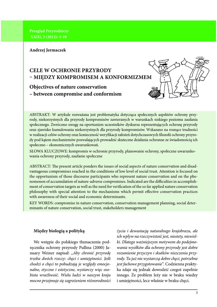 Przegląd Przyrodniczy XXIII, 3 (2012): 3-10 Andrzej Jermaczek CELE W OCHRONIE PRZYRODY – MIĘDZY KOMPROMISEM A KONFORMIZMEM Objectives of nature conservation – between compromise and conformism ABSTRAKT: W artykule rozważana jest problematyka dotycząca społecznych aspektów ochrony przyrody, niekorzystnych dla przyrody kompromisów zawieranych w warunkach niskiego poziomu zaufania społecznego. Zwrócono uwagę na oportunizm uczestników dyskursu reprezentujących ochronę przyrody oraz zjawisko kumulowania niekorzystnych dla przyrody kompromisów. Wskazano na rosnące trudności w realizacji celów ochrony oraz konieczność weryfikacji założeń dotychczasowych filozofii ochrony przyrody pod kątem mechanizmów pozwalających prowadzić skuteczne działania ochronne ze świadomością ich społeczno – ekonomicznych uwarunkowań. SŁOWA KLUCZOWE: kompromis w ochronie przyrody, planowanie ochrony, społeczne uwarunkowania ochrony przyrody, zaufanie społeczne ABSTRACT: The present article ponders the issues of social aspects of nature conservation and disadvantageous compromises reached in the conditions of low level of social trust. Attention is focused on the opportunism of those discourse participants who represent nature conservation and on the phenomenon of accumulation of nature-adverse compromises. Indicated are the difficulties in accomplishment of conservation targets as well as the need for verification of the so far applied nature conservation philosophy with special attention to the mechanisms which permit effective conservation practices with awareness of their social and economic determinants. KEY WORDS: compromise in nature conservation, conservation management planning, social determinants of nature conservation, social trust, stakeholders management Między biologią a polityką We wstępie do polskiego tłumaczenia podręcznika ochrony przyrody Pullina (2000) January Weiner napisał: „Aby chronić przyrodę trzeba dwóch rzeczy: chęci i umiejętności. Jeśli chodzi o chęci to pobudzają je względy emocjonalne, etyczne i estetyczne, wystarczy więc osobista wrażliwość. Wielu ludzi w naszym kraju mocno przejmuje się zagrożeniem różnorodności życia i dewastacją naturalnego krajobrazu, ale ich wpływ na rzeczywistość jest, niestety, niewielki. Dlatego ważniejszym motywem do podejmowania wysiłków dla ochrony przyrody jest dobre rozumienie przyczyn i skutków niszczenia przyrody. Tu już nie wystarczą dobre chęci, potrzebne jest fachowe przygotowanie”. Codzienna praktyka zdaje się jednak dowodzić czegoś zupełnie innego. Że problem leży nie w braku wiedzy i umiejętności, lecz właśnie w braku chęci. 3 Przegląd Przyrodniczy XXIII, 3 (2012) Nasza wiedza o biologii gatunków, funkcjonowaniu ekosystemów, czynnikach jakie decydują o stanie populacji i biocenoz jest coraz pełniejsza. W licznych podręcznikach (Herbich 2004, Pullin 2004, Grzegorczyk 2007, Symonides 2007) szczegółowo prezentowane są biologiczne podstawy ochrony przyrody, przepisy wystarczające do zaplanowania skutecznych działań, pozwalających zachować lub przywrócić zadowalający stan większości przedmiotów ochrony, a nawet odtworzyć całkowicie zniszczone siedliska czy ekosystemy (Andel i Aronson 2005). Wiele zawartych w nich zaleceń, nieco parafrazując, sprowadzić można do prostych zapisów, że: łąki należy kosić, murawy wypasać, torfowisk nie odwadniać, a lasy, jeziora i rzeki najlepiej zostawić w spokoju. W ostatnim okresie coraz większego znaczenia nabiera społeczno – ekonomiczny aspekt ochrony przyrody. Na niewiele przyda się nam wiedza o funkcjonowaniu naturalnych lasów, jeśli nie potrafimy powstrzymać lub przynajmniej ograniczyć ich wycinki. Nawet najbogatsza i najlepiej zbadana łąka zaniknie w ciągu kilkunastu lat, wraz ze wszystkimi zagrożonymi gatunkami, jeśli nie sprawimy, że będzie w odpowiednim rytmie koszona. Skuteczna ochrona przyrody to w coraz mniejszym stopniu domena przyrodników, a coraz częściej działania z pogranicza ekonomii, socjologii (socjotechniki) i polityki, wymagające zupełnie innych kwalifikacji i specjalizacji. To coraz częściej po prostu polityka, czyli, jak trafnie ujął to Swolkień (1998), cytując Józefa Mackiewicza: „walka o »narzucenie innym swoich obyczajów«, o to, żeby cywilizacja i świat, były takie jak »nam«, a nie »im« się podobają.” Uczestnicząc w planowaniu, a także realizacji różnych zadań z zakresu ochrony przyrody, musimy formułować cele jakie chcemy osiągnąć. Aby ochrona przyrody była skuteczna, powinny one być konkretne, mierzalne, realistyczne i wykonalne, ale przede wszystkim, prowadzić do widocznej poprawy stanu przedmiotów ochrony. Coraz częściej w różnych dokumentach i wytycznych dotyczących planowania ochro4 ny przyrody czytamy, że cele ochrony i wynikające z nich działania ochronne powinny być realistyczne. Pomiędzy realizmem, rzetelnością i wiarygodnością w planowaniu i realizacji ochrony przyrody, a uleganiem presji różnych grup interesu, zainteresowanych użytkowaniem przyrody, istnieje jednak tylko bardzo wąska linia. Coraz częściej pojawia się więc także pytanie: gdzie są granice kompromisu, ze względu na uwarunkowania społeczne lub ekonomiczne ochrony przyrody, a gdzie zaczyna się konformizm? Kiedy tę cienką linię podziału przekraczamy? Biologiczne podstawy nauki o ochronie przyrody nie odpowiedzą nam na coraz częściej zadawane pytania: ile wilków, niedźwiedzi, kormoranów, wydr, bobrów może żyć w Polsce? jaki procent powierzchni kraju powinniśmy objąć ochroną ścisłą i pozostawić przyrodzie? ile powinno być martwych drzew na hektarze lasu? Odpowiedź biologii to – „jak najwięcej” lub tyle ile „pomieszczą” siedliska. Pytanie stawiane praktycznej ochronie przyrody brzmi jednak nieco inaczej: ile wilków, niedźwiedzi, kormoranów, wydr, bobrów itd. my ludzie, jesteś
