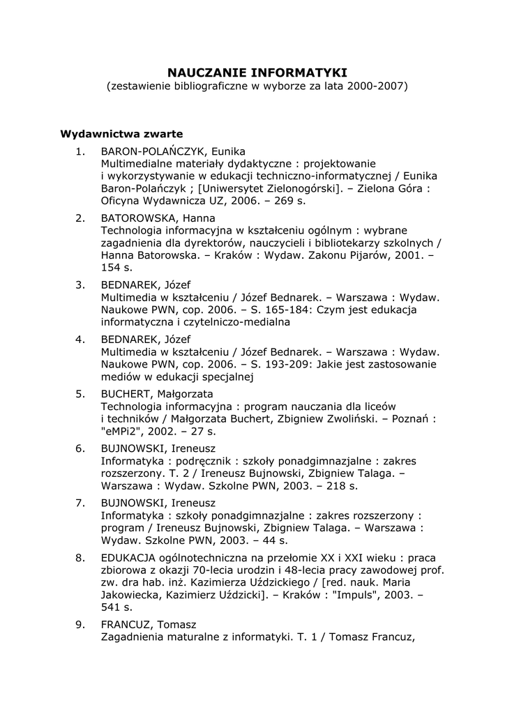 NAUCZANIE INFORMATYKI (zestawienie bibliograficzne w wyborze za lata 2000-2007) Wydawnictwa zwarte 1. BARON-POLAŃCZYK, Eunika Multimedialne materiały dydaktyczne : projektowanie i wykorzystywanie w edukacji techniczno-informatycznej / Eunika Baron-Polańczyk ; [Uniwersytet Zielonogórski]. – Zielona Góra : Oficyna Wydawnicza UZ, 2006. – 269 s. 2. BATOROWSKA, Hanna Technologia informacyjna w kształceniu ogólnym : wybrane zagadnienia dla dyrektorów, nauczycieli i bibliotekarzy szkolnych / Hanna Batorowska. – Kraków : Wydaw. Zakonu Pijarów, 2001. – 154 s. 3. BEDNAREK, Józef Multimedia w kształceniu / Józef Bednarek. – Warszawa : Wydaw. Naukowe PWN, cop. 2006. – S. 165-184: Czym jest edukacja informatyczna i czytelniczo-medialna 4. BEDNAREK, Józef Multimedia w kształceniu / Józef Bednarek. – Warszawa : Wydaw. Naukowe PWN, cop. 2006. – S. 193-209: Jakie jest zastosowanie mediów w edukacji specjalnej 5. BUCHERT, Małgorzata Technologia informacyjna : program nauczania dla liceów i techników / Małgorzata Buchert, Zbigniew Zwoliński. – Poznań : "eMPi2", 2002. – 27 s. 6. BUJNOWSKI, Ireneusz Informatyka : podręcznik : szkoły ponadgimnazjalne : zakres rozszerzony. T. 2 / Ireneusz Bujnowski, Zbigniew Talaga. – Warszawa : Wydaw. Szkolne PWN, 2003. – 218 s. 7. BUJNOWSKI, Ireneusz Informatyka : szkoły ponadgimnazjalne : zakres rozszerzony : program / Ireneusz Bujnowski, Zbigniew Talaga. – Warszawa : Wydaw. Szkolne PWN, 2003. – 44 s. 8. EDUKACJA ogólnotechniczna na przełomie XX i XXI wieku : praca zbiorowa z okazji 70-lecia urodzin i 48-lecia pracy zawodowej prof. zw. dra hab. inż. Kazimierza Uździckiego / [red. nauk. Maria Jakowiecka, Kazimierz Uździcki]. – Kraków : "Impuls", 2003. – 541 s. 9. FRANCUZ, Tomasz Zagadnienia maturalne z informatyki. T. 1 / Tomasz Francuz, Marcin Szeliga. – Wyd. 2 . – Gliwice : "Helion", cop. 2006. – 333 s. 10. FRANCUZ, Tomasz Zagadnienia maturalne z informatyki. T. 2 / Tomasz Francuz, Marcin Szeliga. – Wyd. 2. – Gliwice : "Helion", cop. 2006. – 229 s. 11. HERMANOWSKA, Grażyna Technologia informacyjna : program nauczania w zakresie podstawowym dla liceum ogólnokształcącego, liceum profilowanego i technikum / Grażyna Hermanowska, Wojciech Hermanowski. – Gdynia : "Operon", 2004. – 24 s. 12. HERMANOWSKA, Grażyna Technologia informacyjna : zakres podstawowy : podręcznik dla liceum ogólnokształcącego, liceum profilowanego i technikum / Grażyna Hermanowska, Wojciech Hermanowski. – Gdynia : "Operon", 2004. – 262 s. 13. INFORMATYCZNE przygotowanie nauczycieli : dylematy kształcenia ustawicznego / pod red. Jacka Migdałka i Barbary Kędzierskiej. – Kraków : "Rabid", 2001. – 231 s. 14. INFORMATYCZNE przygotowanie nauczycieli : konkurencja edukacji informatycznej / pod red. Jacka Migdałka i Barbary Kędzierskiej. – Kraków : "Rabid", 2002. – 429 s. 15. INFORMATYCZNE przygotowanie nauczycieli : kształcenie zdalne uwarunkowania, bariery, prognozy / pod red. Jacka Migdałka i Barbary Kędzierskiej. – Kraków : "Rabid", 2003. –484 s. 16. INFORMATYCZNE przygotowanie nauczycieli w okresie zmian i transformacji / pod red. Jacka Migdałka i Barbary Kędzierskiej. – Kraków : "Rabid", 2002. – 369 s. 17. INFORMATYKA : kształcenie w zakresie rozszerzonym : poradnik dla nauczycieli / Ewa Gurbiel [et al.]. – Warszawa : Wydawnictwa Szkolne i Pedagogiczne, cop. 2004. – 414 s. 18. INFORMATYKA : podręcznik dla liceum ogólnokształcącego : kształcenie w zakresie rozszerzonym. Cz. 2 / Ewa Gurbiel [et al.]. – Warszawa : Wydawnictwa Szkolne i Pedagogiczne, cop. 2003. – 279 s. 19. INFORMATYKA : podręcznik dla ucznia gimnazjum / Ewa Gurbiel [et al.]. – Warszawa : Wydawnictwa Szkolne i Pedagogiczne, 2000. – 308 s. 20. INFORMATYKA : poradnik dla nauczyciela gimnazjum / Ewa Gurbiel [et al.]. – Warszawa : Wydawnictwa Szkolne i Pedagogiczne, 2000. – 245 s. 21. JUSZCZYK, Stanisław Metodyka nauczania informatyki i TI w szkole podstawowej i gimnazjum : wybrane aspekty pedagogiczne i psychologiczne / Stanisław Juszczyk // W: Dydaktyka informatyki i technologii informacyjnej / Stanisław Juszczyk, Janusz Janczyk, Danuta Morańska, Marcin Musioł. – Toruń : Wydaw. Adam Marszałek, cop. 2003. – S. 427-453 22. JUSZCZYK, Stanisław Dydaktyka informatyki i technologii informacyjnej / Stanisław Juszczyk [oraz] Janusz Janczyk, Danuta Morańska, Marcin Musioł. – Toruń : Wydaw. Adam Marszałek, cop. 2003. – 563 s. 23. KAMIŃSKI, Bogdan Przetwarzanie informacji : podręcznik : liceum o profilu zarządzanie informacją. Cz. 1, Przetwarzanie tekstu, przetwarzanie obrazu / Bogdan Kamiński. – Warszawa : Wydawnictwa Szkolne i Pedagogiczne, cop. 2004. – 272 s. 24. KĘDZIERSKA, Barbara Informatyczne kształcenie i doskonalenie nauczycieli / Barbara Kędzierska. – Kraków : Wydaw. Naukowe Akademii Pedagogicznej, 2005. – 177 s. 25. KILIŃSKA, Bożena Innowacja dotycząca korelacji matematyki i informatyki / Bożena Kiljańska, Anna Konstantynowicz, Małgorzata Olech // W: Pedagogika w działaniu społecznym / red. Tadeusz Dyrda, Sylwester Scisłowicz. – Ostrowiec Świętokrzyski : Stowarzyszenie na Rzecz Rozwoju Wyższej Szkoły Biznesu i Przedsiębiorczości, 2004. – S. 291-295 26. KISIELEWICZ, Andrzej Wprowadzenie do informatyki / Andrzej Kisielewicz. – Gliwice : "Helion", cop. 2002. – 162 s. 27. KŁOSIŃSKA, Tatiana Wykorzystanie technologii informacyjnej w kontekście wychowania przedszkolnego / Tatiana Kłosińska // W: Edukacja przedszkolna w teorii i praktyce / pod red. Stanisławy Włoch. – Opole : Wydaw. Uniwersytetu Opolskiego, 2006. – S. 243-252 28. KOBA, Grażyna Informatyka : podstawowe tematy : nie tylko dla gimnazjum / Grażyna Koba. – Wyd. 2, (3 dodr.). – Warszawa Wrocław : Wydaw. Szkolne PWN, 2000. – 215 s. 29. KRAWCZYŃSKI, Edward Technologia informacyjna : program nauczania, przewodnik metodyczny : zasadnicza szkoła zawodowa / Edward Krawczyń