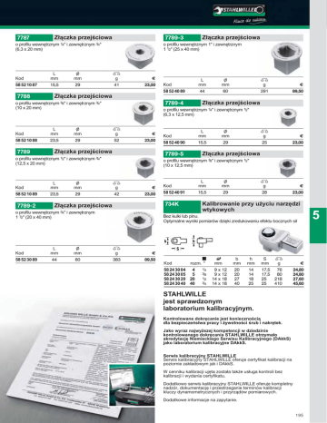 7787 Złączka przejściowa Złączka przejściowa 7789-3 o profilu wewnętrznym 1/4'' i zewnętrznym 3/4'' (6,3 x 20 mm) o profilu wewnętrznym 1'' i zewnętrznym 1 1/2'' (25 x 40 mm) ʻ Kod L mm O mm R g € 15,5 29 41 23,00 ʻ 58 52 10 87 ʻ Kod 58 52 40 89 7788 L mm O mm R g € 44 60 291 89,50 ʻ ʻ ʻ Złączka przejściowa Złączka przejściowa 7789-4 o profilu wewnętrznym 3/8'' i zewnętrznym 3/4'' (10 x 20 mm) o profilu wewnętrznym 1/4'' i zewnętrznym 1/2'' (6,3 x 12,5 mm) ʻ Kod L mm O mm R g ʻ 58 52 10 88 23,5 29 52 ʻ € 23,00 ʻ Kod L mm O mm R g € 15,5 29 25 23,00 ʻ 58 52 40 90 ʻ 7789 Złączka przejściowa Złączka przejściowa 7789-5 o profilu wewnętrznym 1/2'' i zewnętrznym 3/4'' (12,5 x 20 mm) o profilu wewnętrznym 3/8'' i zewnętrznym 1/2'' (10 x 12,5 mm) ʻ ʻ Kod L mm O mm R g ʻ 58 52 10 89 23,5 29 42 € 23,00 Kod L mm O mm R g € 15,5 29 28 23,00 ʻ 58 52 40 91 ʻ ʻ 7789-2 Kalibrowanie przy użyciu narzędzi wtykowych 734K Złączka przejściowa o profilu wewnętrznym 3/4'' i zewnętrznym 1 1/2'' (20 x 40 mm) 5 Bez kulki lub pinu. Optymalne wyniki pomiarów dzięki zredukowaniu efektu bocznych sił ʻ Kod L mm O mm R g € 44 60 383 89,50 ʻ 58 52 30 89 ʻ ʻ Kod D rozm. '' J mm b mm h mm S mm R g € 9 x 12 9 x 12 14 x 18 14 x 18 20 20 27 40 14 14 18 25 17,5 76 17,5 80 25 218 25 410 24,80 24,80 27,60 45,60 ʻ 58 24 30 04 4 58 24 30 05 5 58 24 30 20 20 58 24 30 40 40 1/4 3/8 1/2 3/4 ʻ 1 STAHLWILLE jest sprawdzonym laboratorium kalibracyjnym. Kontrolowane dokręcanie jest koniecznością dla bezpieczeństwa pracy i żywotności śrub i nakrętek. Jako wyraz najwyższej kompetencji w dziedzinie kontrolowanego dokręcania STAHLWILLE otrzymało akredytację Niemieckiego Serwisu Kalibracyjnego (DAkkS) jako laboratorium kalibracyjne DAkkS. Serwis kalibracyjny STAHLWILLE Serwis kalibracyjny STAHLWILLE oferuje certyfikat kalibracji na poziomie zakładowym jak i DAkkS. W cenniku kalibracji ujęta została także usługa kontroli bez kalibracji i wydania certyfikatu. Dodatkowo serwis kalibracyjny STAHLWILLE oferuje kompletny nadzór, dokumentację i przestrzeganie terminów kalibracji kluczy dynamometrycznych i przyrządów pomiarowych. Dodatkowe informacje na zapytanie. 195