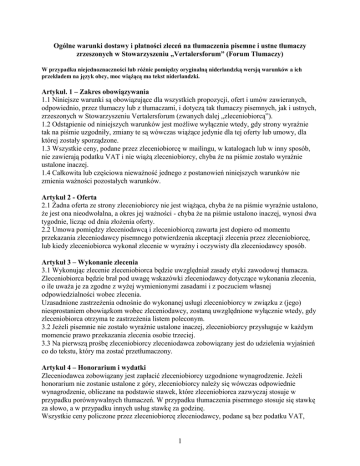 Ogólne warunki dostawy i płatności zleceń na tłumaczenia pisemne i ustne tłumaczy zrzeszonych w Stowarzyszeniu „Vertalersforum” (Forum Tłumaczy) W przypadku niejednoznaczności lub różnic pomiędzy oryginalną niderlandzką wersją warunków a ich przekładem na język obcy, moc wiążącą ma tekst niderlandzki. Artykuł. 1 – Zakres obowiązywania 1.1 Niniejsze warunki są obowiązujące dla wszystkich propozycji, ofert i umów zawieranych, odpowiednio, przez tłumaczy lub z tłumaczami, i dotyczą tak tłumaczy pisemnych, jak i ustnych, zrzeszonych w Stowarzyszeniu Vertalersforum (zwanych dalej „zleceniobiorcą”). 1.2 Odstąpienie od niniejszych warunków jest możliwe wyłącznie wtedy, gdy strony wyraźnie tak na piśmie uzgodniły, zmiany te są wówczas wiążące jedynie dla tej oferty lub umowy, dla której zostały sporządzone. 1.3 Wszystkie ceny, podane przez zleceniobiorcę w mailingu, w katalogach lub w inny sposób, nie zawierają podatku VAT i nie wiążą zleceniobiorcy, chyba że na piśmie zostało wyraźnie ustalone inaczej. 1.4 Całkowita lub częściowa nieważność jednego z postanowień niniejszych warunków nie zmienia ważności pozostałych warunków. Artykuł 2 - Oferta 2.1 Żadna oferta ze strony zleceniobiorcy nie jest wiążąca, chyba że na piśmie wyraźnie ustalono, że jest ona nieodwołalna, a okres jej ważności - chyba że na piśmie ustalono inaczej, wynosi dwa tygodnie, licząc od dnia złożenia oferty. 2.2 Umowa pomiędzy zleceniodawcą i zleceniobiorcą zawarta jest dopiero od momentu przekazania zleceniodawcy pisemnego potwierdzenia akceptacji zlecenia przez zleceniobiorcę, lub kiedy zleceniobiorca wykonał zlecenie w wyraźny i oczywisty dla zleceniodawcy sposób. Artykuł 3 – Wykonanie zlecenia 3.1 Wykonując zlecenie zleceniobiorca będzie uwzględniał zasady etyki zawodowej tłumacza. Zleceniobiorca będzie brał pod uwagę wskazówki zleceniodawcy dotyczące wykonania zlecenia, o ile uważa je za zgodne z wyżej wymienionymi zasadami i z poczuciem własnej odpowiedzialności wobec zlecenia. Uzasadnione zastrzeżenia odnośnie do wykonanej usługi zleceniobiorcy w związku z (jego) niesprostaniem obowiązkom wobec zleceniodawcy, zostaną uwzględnione wyłącznie wtedy, gdy zleceniobiorca otrzyma te zastrzeżenia listem poleconym. 3.2 Jeżeli pisemnie nie zostało wyraźnie ustalone inaczej, zleceniobiorcy przysługuje w każdym momencie prawo przekazania zlecenia osobie trzeciej. 3.3 Na pierwszą prośbę zleceniobiorcy zleceniodawca zobowiązany jest do udzielenia wyjaśnień co do tekstu, który ma zostać przetłumaczony. Artykuł 4 – Honorarium i wydatki Zleceniodawca zobowiązany jest zapłacić zleceniobiorcy uzgodnione wynagrodzenie. Jeżeli honorarium nie zostanie ustalone z góry, zleceniobiorcy należy się wówczas odpowiednie wynagrodzenie, obliczane na podstawie stawek, które zleceniobiorca zazwyczaj stosuje w przypadku porównywalnych tłumaczeń. W przypadku tłumaczenia pisemnego stosuje się stawkę za słowo, a w przypadku innych usług stawkę za godzinę. Wszystkie ceny policzone przez zleceniobiorcę zleceniodawcy, podane są bez podatku VAT, 1 chyba że wyraźnie ustalono inaczej. Oprócz wymienionych stawek zleceniobiorca realizując zlecenie ma prawo obciążyć zleceniodawcę faktycznymi kosztami własnymi, poniesionymi w związku z tą realizacją. Artykuł 5 – Terminy dostawy Terminy dostawy, ewentualnie wymienione w ofertach, potwierdzeniach zlecenia i umowach, określane są w miarę dokładnie i powinny zostać, o ile to możliwe dotrzymane, nie są jednak wiążące. Przekroczenie tych terminów, z jakichkolwiek powodów, nigdy nie uprawnia zleceniodawcy do odszkodowania, odstąpienia od umowy lub odroczenia jakiegokolwiek obowiązku, wynikającego dla zleceniodawcy z odnośnej umowy lub z jakiejkolwiek innej z nią powiązanej umowy, chyba że jest to trzykrotne przekroczenie terminu, przy uwzględnieniu minimum 10 dni roboczych i pod warunkiem, że przekroczenia terminu nie można częściowo lub całkowicie zarzucić zleceniodawcy. Za moment dostawy zlecenia uznaje się dzień wysłania przetłumaczonego tekstu w formie elektronicznej lub faksem lub pocztą. Artykuł 6 - Reklamacje Ewentualne reklamacje muszą być zgłoszone pisemnie w ciągu 8 dni roboczych po otrzymaniu przez zleceniodawcę wykonanego zlecenia. Reklamacja ze strony zleceniodawcy nie daje prawa do odroczenia obowiązku płatności wobec zleceniobiorcy. Artykuł 7 - Wynagrodzenie 7.1 Jeżeli wyraźnie nie ustalono inaczej na piśmie, każda zafakturowana kwota jest płatna w ciągu 30 dni kalendarzowych licząc od daty faktury, i winna być wpłacona bezpośrednio w biurze zleceniobiorcy lub w formie przelewu na rachunek bankowy lub giro, wskazany przez zleceniobiorcę, bez prawa do jakichkolwiek dodatkowych rozliczeń, niezależnie od powodu. Prawa autorskie do wykonanego tłumaczenia należą do zleceniobiorcy do chwili uiszczenia przez zleceniodawcę pełnej zapłaty tego, co jest on w całości winien zleceniobiorcy, włącznie z wliczonymi w to wyraźnie odsetkami i kosztami inkasa. Prawo zleceniodawcy do zgłoszenia roszczeń dotyczących rachunku upływa po 30 dniach od daty wystawienia faktury. 7.2 Jeżeli zleceniodawca nie uiści należności w uzgodnionym terminie, zostaje uznany na mocy prawa winnym zwłoki w zapłacie i zleceniobiorcy przysługuje prawo, bez konieczności powiadomienia o tym zleceniodawcy, doliczenia prawnych odsetek od należnej kwoty, powiększonych o 3%, naliczając od momentu przekroczenia dnia płatności. Ponadto wszystkie pozasądowe koszty (koszty komornika, koszty prawnego pełnomocnika i oczywiście wszelkie koszty pomocy prawnej), jak i wszelkie koszty sądowe, obciążają zleceniodawcę. Niezależnie od prawa zleceniobiorcy do odszkodowania za inne koszty, koszty pozasądowego inkasa wynoszą co najmniej 15% sumy głównej, należnej zleceniobiorcy od zleceniodawcy, p
