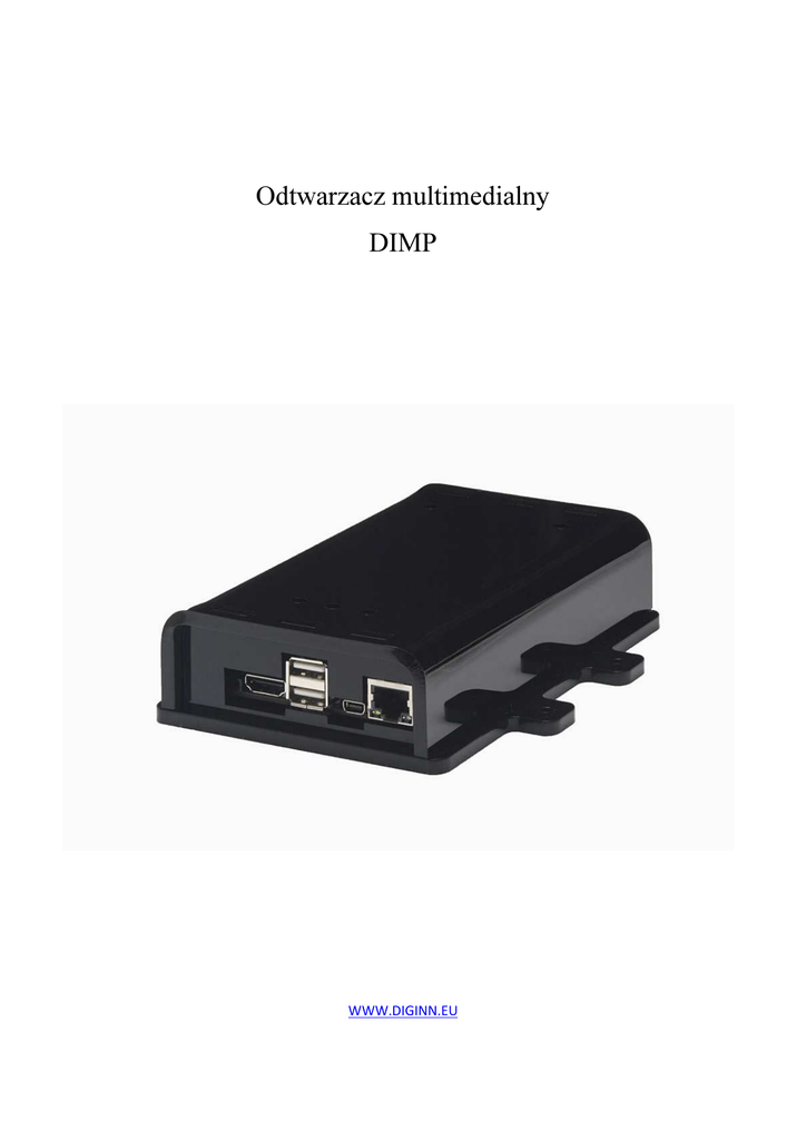 Odtwarzacz multimedialny DIMP WWW.DIGINN.EU Zawartość 1. Opis odtwarzacza DIMP ........................................................................................................ 3 2. Wyprowadzenia odtwarzacza ................................................................................................. 5 3. Złącze GPIO ........................................................................................................................... 7 4. Tryby pracy .......................................................................................................................... 10 4.1 Tryb TV .......................................................................................................................... 11 4.1.1 Menu główne ........................................................................................................... 11 4.1.2 TV – lista odtwarzania ............................................................................................. 12 4.1.3 Tryb TV – opcje ....................................................................................................... 13 4.2 Tryb GPIO ...................................................................................................................... 15 4.3 Tryb ciągły ...................................................................................................................... 16 4.4 Tryb UART..................................................................................................................... 17 4.4.1 Komendy UART ...................................................................................................... 19 5. Serwer www ......................................................................................................................... 23 6. Wyłączanie odtwarzacza ...................................................................................................... 25 7. Kodowanie filmów ............................................................................................................... 26 8. Inne informacje .................................................................................................................... 29 1. Opis odtwarzacza DIMP Odtwarzacz multimediów DIMP to wysokiej jakości urządzenie typu digital signage, umożliwiające odtwarzanie plików audio oraz wideo na monitorze, telewizorze lub projektorze z wejściem HDMI. Systemy digital signage znajdują się w wielu miejscach takich jak muzea, stadiony, hotele, wystawy sklepowe, restauracji itp. Służą one do wyświetlania reklam, informacji i innych informacji. Tak szerokie zastosowanie umożliwiają bogate funkcjonalności odtwarzacza DIMP. Urządzenie wyposażone jest w interfejs graficzny, dzięki czemu możemy sterować odtwarzaczem przy użyciu myszki podłączonej do portu USB. Możliwe jest także zdalne połączenie do odtwarzacza przez sieć internet, gdyż ten odtwarzacz wyposażony jest w serwer WWW. Z urządzeniem komunikować się także można poprzez port UART, wykorzystując odpowiednie komendy. Oprócz tego dostępne są porty GPIO, gdzie podłączyć można przyciski i współpraca z urządzeniem odbywać się może przy użyciu prostego pilota (m.in. przyciski Start, Stop, Next, Prev, Vol+, Vol-). Urządzenie może pracować także w trybie bezobsługowym, odtwarzając pliki z pamięci wewnętrznej (2 GB), karty SD lub pamięci typu pendrive USB. Urządzenie może wyświetlać obraz w maksymalnej rozdzielczości 720p (1280x720) poprzez interfejs HDMI, posiada także dodatkowe wyjście audio typu jack. Odtwarzacz DIMP obsługuje najpopularniejsze typy plików audio oraz video, czyli mp3, wav, avi, 3gp, mp4, mkv, flv. Całość zamknięta jest w pudełku wyposażonym w cztery uchwyty, umożliwiające montaż urządzenia w praktycznie dowolnym miejscu, w tym także na tylniej ścianie monitora. Dane techniczne: - rozdzielczość wyświetlanego obrazu 720p (1080x720), - HDMI + audio, - wbudowana pamięć dla użytkownika 2 GB, - dodatkowe wyjście audio LINE OUT, - obsługa kart SD, pamięci USB typu pendrive, - dekoder video: MPEG1, MPEG2, H.263, H.264, VP8, - obsługa plików video o rozdzielczości do 1080p, - odtwarzanie plików video: avi, 3gp, mp4, mkv, flv, - odtwarzanie plików audio: mp3, wav, ogg, - 1 x HDMI, - 2 x USB High-speed host, - 1 x SD Slot, - 1 x USB-OTG, - 1x GPIO 25 pin, - 100MBit Ethernet, - zasilanie 6-16V 1A, - temperatura pracy: 0-70 st. C 2. Wyprowadzenia odtwarzacza W tym rozdziale można się zapoznać z wyprowadzeniami i złączami znajdującymi się w odtwarzaczu. a) Wyprowadzenia znajdujące się od przodu urządzenia: - HDMI – do podłączenia telewizora, monitora itp. - 2 x USB – do podłączenia pamięci zewnętrznej usb oraz myszki, - 1 x miniUSB – do podłączenia odtwarzacza do komputera PC, - ETH – złącze ethernet, do podłączenia kabla sieciowego. b) Wyprowadzenia znajdujące się z tyłu urządzenia: - zasilające 6-12V: Pin 1 – VCC Pin 2 – masa GND - złącze 3,5mm jack LINE OUT – do podłączenia słuchawek lub do wzmacniacza audio, - złącze 25 pin GPIO – dokładny opis w rozdziale 3. c) Otwory montażowe W podstawie odtwarzacza znajdują się cztery otwory montażowe umożliwiające przymocowanie odtwarzacza. 3. Złącze GPIO Złącze GPIO służy do sterowania urządzeniem. Za jego pomocą możemy ustawić odpowiedni tryb pracy odtwarzacza oraz odczytać jego stan. Jest to złącze 25 pinowe o następującym rozkładzie wyprowadzeń: Nie zależnie od wybranego trybu pracy, wyprowadzenia o numerach: od 1 do 8 i od 23 do 25 zawsze pełnią tą samą funkcję, opisaną w tabeli 1. Natomiast funkcje pinów o numerach od 9 do 22 są zależne od wybranego trybu pracy a ich znaczenie opisane jest w tabeli 3. Wyprowadzenia złącza GPIO o niezmiennych funkcjach 1 2 3 4 5 6 7 8 23 24 VCC GND UART UART MODE MODE MODE MODE STATUS READY 3,3V Tabela 1 TXD RXD 1 2 3 4 25 OFF Każdy z wyprowadzeń G