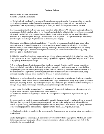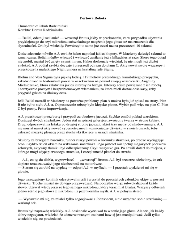 Portowa Robota Tłumaczenie: Jakub Radzimiński Korekta: Dorota Radzimińska — Belial, odetnij zasilanie! — wrzasnął Brutus jakby w przekonaniu, że w przypadku używania przyklejonego do szyi mikrofonu subwokalnego natężenie jego głosu też ma znaczenie dla słyszalności. Ork był wściekły. Powtórzył to samo już trzeci raz na przestrzeni 10 sekund. Doświadczenie mówiło A.J.-owi, że haker napotkał jakieś kłopoty. W Macierzy dziesięć sekund to szmat czasu. Belial mógłby włączyć i wyłączyć zasilanie już z kilkadziesiąt razy. Skoro tego dotąd nie zrobił, musiał być zajęty czymś innym. Haker doskonale wiedział, że nie mogli już dłużej zwlekać. A.J. podjął szybką decyzję i przeszedł od razu do planu C. Aktywował swoje wszczepy i przeskoczył z malutkiego Nightrunnera na kształtną rufę Sigmy. Blohm and Voss Sigma była piękną łodzią. 119 metrów przesadnego, karaibskiego przepychu, zakotwiczone w bostońskim porcie w oczekiwaniu na powrót swojej właścicielki, Angeliny Mielniczenko, która załatwiała jakieś interesy na brzegu. Interesy ściśle powiązane z ich robotą. Teoretycznie prostym i bezproblemowym włamaniem, za które mieli dostać dość kasy, żeby przypaść gdzieś na dłuższy czas. Jeśli Belial natrafił w Macierzy na poważne problemy, plan A można było już spisać na straty. Plan B nie był w stylu A.J.-a. Odpuszczenie roboty było kiepsko płatne. Wybór padł więc na plan C. Plan C był prosty. Pełna improwizacja. A.J. przeskoczył przez burtę i przypadł za obudową jacuzzi. Szybko omiótł pokład wzrokiem. Dostrzegł dwóch strażników. Jeden stał na górnej galeryjce, zwrócony twarzą w stronę kabiny. Drugi odpoczywał na leżaku po drugiej stronie jacuzzi, jakieś trzy metry od shadowrunnera. A.J. nie musiał nawet aktywować cybernetycznych wzmacniaczy dźwięku w swoich uszach, żeby usłyszeć muzykę płynącą przez słuchawki tkwiące w uszach strażnika. Skulony za brzegiem baseniku, runner ruszył powoli w kierunku strażnika, po drodze wyciągając broń. Szybko rzucił okiem na wskazania smartlinka. Jego pistolet miał pełny magazynek pocisków żelowych, aktywny tłumik i był odbezpieczony. Czyli wszystko gra. Po chwili dotarł do miejsca, z którego mógł zdjąć pierwszego strażnika, i zaczął unosić pistolet do strzału. — A.J., co ty, do diabła, wyprawiasz? — „wrzasnął” Brutus. A.J. był szczerze zdziwiony, że ork dopiero teraz zauważył jego nieobecność na motorówce. — Staram się zarobić na wypłatę — odparł A.J. w myślach. — I przestań wydzierać mi się w głowie. Jego wszczepiony komlink odczytywał myśli i wysyłał do pozostałych członków ekipy w postaci dźwięku. Trochę musiał się do tego przyzwyczaić. Na początku wciąż subwokalizował każde słowo. Używał wtedy jeszcze tego samego mikrofonu, który teraz miał Brutus. Wszyscy odbierali jednocześnie jego słowa z mikrofonu i z przetwornika myśli. A.J. w pełnym stereo. — Wydawało mi się, że miałeś tylko negocjować z Johnsonem, a nie urządzać sobie strzelaninę — warknął ork. Brutus był naprawdę wściekły. A.J. doskonale wyczuwał to w tonie jego głosu. Ale też, jak każdy dobry negocjator, wiedział, że zdenerwowanymi osobami łatwiej jest manipulować. Jeśli tylko wiedziało się, co powiedzieć. — Mam na tacy dwóch strażników — odparł. — Jednego zdejmę, ale z drugim potrzebuję pomocy. W ten sposób pozbędziemy się połowy ochrony jachtu, nie alarmując nikogo — A.J. mówił uspokajającym tonem, jednocześnie grając na czułej strunie Brutusa — pragnieniu bycia przydatnym. — Belial jeszcze nie odciął zasilania — powiedział ork, ale A.J. wyczuł w jego głosie lekkie wahanie. — Nie możemy ruszać. Czekaj. — Kiedy Belial w końcu odetnie prąd, będziemy mieli już dwóch z głowy — drążył dalej A.J. — Ewidentnie ma teraz jakieś problemy w Macierzy. System komputerowy jachtu może ich ostrzec i taka okazja na ciche zdjęcie dwóch kolesi może się już nie powtórzyć. A może znajdziemy ich hakera i ułatwimy Belialowi robotę? A.J. miał wrażenie, że ork zastanawia się całą wieczność. Runner był już tak blisko leżaka, że słyszał linię basu słuchanej przez strażnika muzyki. Podświadomie poznał utwór — Ballzsmasha grane przez Grudge. A.J. nie był wielkim fanem troll rocka, ale w sieci utwór był ostatnio na topie i chwytliwa linia basu jakoś utkwiła mu w pamięci. — Mam na muszce tego na galeryjce — odezwał się w końcu Brutus, tym razem cicho. — To jak, jedziemy z tym koksem, czy jak? A.J. uniósł głowę na tyle, żeby spojrzeć nad brzegiem jacuzzi. Dostrzegł tłumik Brutusowego Heckler & Kocha oraz czarny, matowy metal na palcach orka zaciśniętych na rufowym relingu. — Jedziemy, daj znak — powiedział. A.J. pozostawił decyzję o strzale w gestii Brutusa z dwóch przyczyn. Jedną była chęć połechtania całkiem pokaźnego ego orka. Drugą — świadomość, że w razie potrzeby ork po nim poprawi. Niby miał wszystkie wszczepy i umiejętności potrzebne w takiej sytuacji, ale zdecydowanie nie był najlepszym strzelcem w ekipie. Ze słowami szło mu dużo lepiej. Przyjął odpowiednią postawę i wymierzył w odpoczywającego strażnika. — Na zero — powiedział cicho ork. — Trzy, dwa, jeden… Zera ork nie musiał wymawiać. Broń obu runnerów wypaliła niemal równocześnie. Pocisk żelowy z pistoletu A.J.-a uderzył w samą skroń strażnika, odrzucając jego głowę na bok. Zawsze było ryzyko trwałego uszkodzenia mózgu, ale za to nie było ryzyka, że trafiony pozostanie przytomny. — Zdjęty — powiedział Brutus, tym razem nieco wyraźniej i głośniej. Z ciężkim sapnięciem ork przeskoczył nad relingiem i dołączył do A.J.-a na pokładzie jachtu. Działali w ciszy. Brutus wyciągnął dwie pary kajdanek zaciskowych, po czym skrępował dłonie 