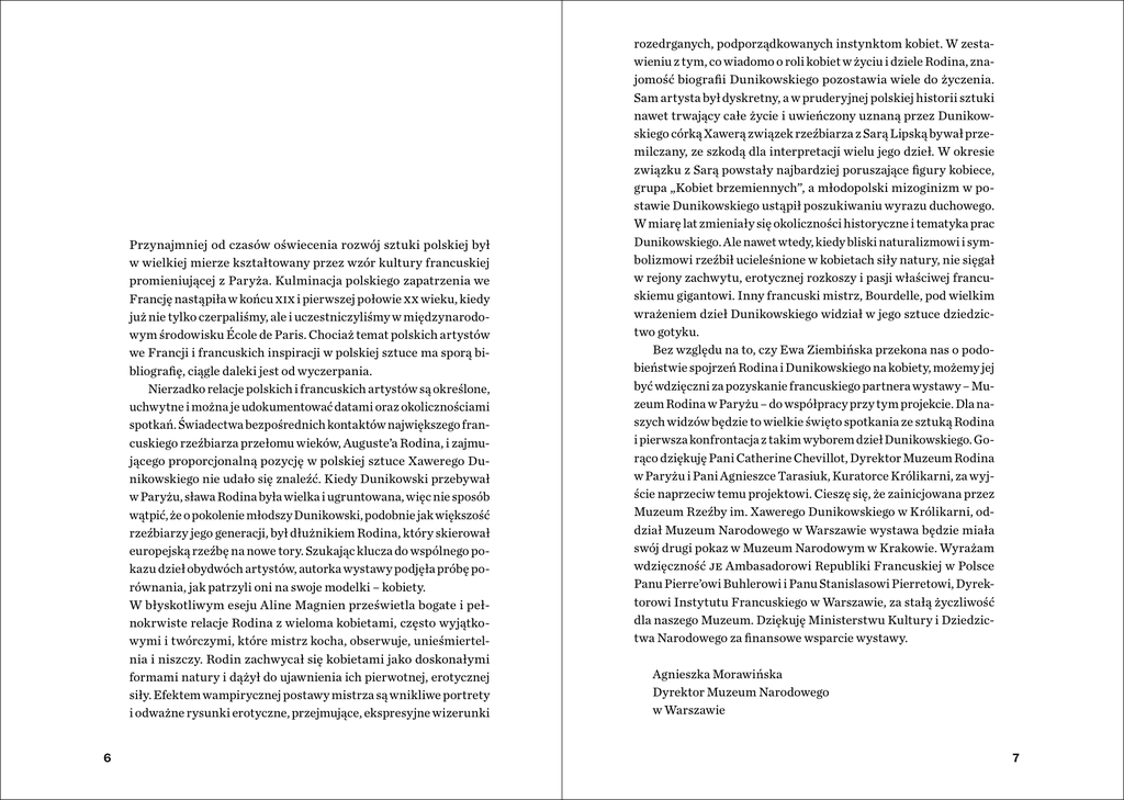 Przynajmniej od czasów oświecenia rozwój sztuki polskiej był w wielkiej mierze kształtowany przez wzór kultury francuskiej promieniującej z Paryża. Kulminacja polskiego zapatrzenia we Francję nastąpiła w końcu XIX i pierwszej połowie XX wieku, kiedy już nie tylko czerpaliśmy, ale i uczestniczyliśmy w międzynarodowym środowisku École de Paris. Chociaż temat polskich artystów we Francji i francuskich inspiracji w polskiej sztuce ma sporą bibliografię, ciągle daleki jest od wyczerpania. Nierzadko relacje polskich i francuskich artystów są określone, uchwytne i można je udokumentować datami oraz okolicznościami spotkań. Świadectwa bezpośrednich kontaktów największego francuskiego rzeźbiarza przełomu wieków, Auguste’a Rodina, i zajmującego proporcjonalną pozycję w polskiej sztuce Xawerego Dunikowskiego nie udało się znaleźć. Kiedy Dunikowski przebywał w Paryżu, sława Rodina była wielka i ugruntowana, więc nie sposób wątpić, że o pokolenie młodszy Dunikowski, podobnie jak większość rzeźbiarzy jego generacji, był dłużnikiem Rodina, który skierował europejską rzeźbę na nowe tory. Szukając klucza do wspólnego pokazu dzieł obydwóch artystów, autorka wystawy podjęła próbę porównania, jak patrzyli oni na swoje modelki – kobiety. W błyskotliwym eseju Aline Magnien prześwietla bogate i pełnokrwiste relacje Rodina z wieloma kobietami, często wyjątkowymi i twórczymi, które mistrz kocha, obserwuje, unieśmiertelnia i niszczy. Rodin zachwycał się kobietami jako doskonałymi formami natury i dążył do ujawnienia ich pierwotnej, erotycznej siły. Efektem wampirycznej postawy mistrza są wnikliwe portrety i odważne rysunki erotyczne, przejmujące, ekspresyjne wizerunki 6 rozedrganych, podporządkowanych instynktom kobiet. W zestawieniu z tym, co wiadomo o roli kobiet w życiu i dziele Rodina, znajomość biografii Dunikowskiego pozostawia wiele do życzenia. Sam artysta był dyskretny, a w pruderyjnej polskiej historii sztuki nawet trwający całe życie i uwieńczony uznaną przez Dunikowskiego córką Xawerą związek rzeźbiarza z Sarą Lipską bywał przemilczany, ze szkodą dla interpretacji wielu jego dzieł. W okresie związku z Sarą powstały najbardziej poruszające figury kobiece, grupa „Kobiet brzemiennych”, a młodopolski mizoginizm w postawie Dunikowskiego ustąpił poszukiwaniu wyrazu duchowego. W miarę lat zmieniały się okoliczności historyczne i tematyka prac Dunikowskiego. Ale nawet wtedy, kiedy bliski naturalizmowi i symbolizmowi rzeźbił ucieleśnione w kobietach siły natury, nie sięgał w rejony zachwytu, erotycznej rozkoszy i pasji właściwej francuskiemu gigantowi. Inny francuski mistrz, Bourdelle, pod wielkim wrażeniem dzieł Dunikowskiego widział w jego sztuce dziedzictwo gotyku. Bez względu na to, czy Ewa Ziembińska przekona nas o podobieństwie spojrzeń Rodina i Dunikowskiego na kobiety, możemy jej być wdzięczni za pozyskanie francuskiego partnera wystawy – Muzeum Rodina w Paryżu – do współpracy przy tym projekcie. Dla naszych widzów będzie to wielkie święto spotkania ze sztuką Rodina i pierwsza konfrontacja z takim wyborem dzieł Dunikowskiego. Gorąco dziękuję Pani Catherine Chevillot, Dyrektor Muzeum Rodina w Paryżu i Pani Agnieszce Tarasiuk, Kuratorce Królikarni, za wyjście naprzeciw temu projektowi. Cieszę się, że zainicjowana przez Muzeum Rzeźby im. Xawerego Dunikowskiego w Królikarni, oddział Muzeum Narodowego w Warszawie wystawa będzie miała swój drugi pokaz w Muzeum Narodowym w Krakowie. Wyrażam wdzięczność JE Ambasadorowi Republiki Francuskiej w Polsce Panu Pierre’owi Buhlerowi i Panu Stanislasowi Pierretowi, Dyrektorowi Instytutu Francuskiego w Warszawie, za stałą życzliwość dla naszego Muzeum. Dziękuję Ministerstwu Kultury i Dziedzictwa Narodowego za finansowe wsparcie wystawy. Agnieszka Morawińska Dyrektor Muzeum Narodowego w Warszawie 7 Rodin / Dunikowski Dwóch rzeźbiarzy patrzy na kobietę E WA Z I E M B I Ń S K A Twórczość Auguste’a Rodina inspirowała i nadal jest źródłem inspiracji dla wielu artystów, także dla tych niezajmujących się rzeźbą, tworzących w innym medium 1. Nie było w XX wieku rzeźbiarza, który nie konfrontowałby swych ambicji z twórczością Rodina. Sztuka francuskiego mistrza wprowadziła rozważania o rzeźbie w inny wymiar i nową epokę. Rodin w rozmowie z krytykiem sztuki Paulem Gsellem zauważył: „Rzeźbiarz, chcąc przedstawić radość, cierpienie lub jakąkolwiek namiętność, nie zdoła nas wzruszyć, jeśli nie potrafi tchnąć iskry życia w postaci przez siebie stworzone. […] Rzeźbiarz osiąga złudzenie życia w swoich dziełach, plastycznością lub ruchem. Te dwie własności są jakby oddechem i krwią płynącą w żyłach wszystkich pięknych dzieł sztuki” 2. Jak podkreślają badacze twórczości Rodina, rzeźbiarz posiadł umiejętność wyrażania różnorodnych emocji, duszy człowieka, poprzez znajomość anatomii i wiedzę z zakresu psychologii. Ciało, jego ułożenie i napięcie, Ostatnia słynna realizacja zainspirowana rzeźbą Rodina to videoinstalacja kanadyjskiego reżysera i scenarzysty Denysa Arcanda i artysty Adada Hannaha z 2014 roku, zatytułowana Mieszczanie z Vancouver, odnosząca się do słynnej rzeźby Rodina Mieszczanie z Calais. Instalacja pokazywana była na wystawach w 2015 roku w Paryżu i Toronto oraz na Międzynarodowym Festiwalu Filmowym w Toronto, zob.: https://www.youtube.com/watch?v=3Ga6uzF_1pM, [dostęp: 3 stycznia 2016]. 2 August Rodin, Sztuka. Rozmowy spisane przez Pawła Gsell, tłum. Teresa Tatarkiewiczowa, wstępem opatrzył Władysław Tatarkiewicz, Spółka Wydawnicza „EOS”, Poznań 1923, s. 31. 1 Pierre Choumoff (Piotr Szumow) Auguste Rodin 1917 odbitka na papierze srebrowo-żelatynowym 22,1 × 16,6 cm nr. inw. F.98918/III Biblioteka Narodowa 10 11 ujawnia stany emocjonalne. To podejście było przeło