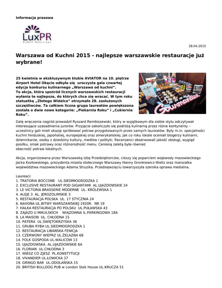 Informacja prasowa 28.04.2015 Warszawa od Kuchni 2015 - najlepsze warszawskie restauracje już wybrane! 25 kwietnia w ekskluzywnym klubie AVIATOR na 10. piętrze Airport Hotel Okęcie odbyła się uroczysta gala czwartej edycja konkursu kulinarnego „Warszawa od kuchni”. To akcja, która spośród licznych warszawskich restauracji wyłania te najlepsze, do których chce się wracać. W tym roku statuetkę „Złotego Widelca” otrzymało 28. zasłużonych szczęśliwców. Ta całkiem liczna grupa laureatów powiększona została o dwie nowe kategorie: „Piekarnia Roku” i „Cukiernia Roku”. Galę wręczenia nagród prowadził Ryszard Rembiszewski, który w wyjątkowym dla siebie stylu odczytywał interesujące uzasadnienia jurorów. Przyjęcie zakończyło się podróżą kulinarną przez różne kontynenty – uczestnicy gali mieli okazję spróbować potraw przygotowanych przez samych laureatów. Były m.in. specjalności kuchni hinduskiej, japońskiej, europejskiej oraz amerykańskiej. Jak co roku lokale oceniali blogerzy kulinarni, dziennikarze, osoby z dziedziny kultury, mediów i polityki. Recenzenci obserwowali jakość obsługi, wygląd posiłku, smak potrawy oraz różnorodność menu. Cenioną zaletą była również obecność potraw lokalnych. Akcja, organizowana przez Warszawską Izbę Przedsiębiorców, cieszy się poparciem wojewody mazowieckiego Jacka Kozłowskiego, prezydenta miasta stołecznego Warszawy Hanny Gronkiewicz-Waltz oraz marszałka województwa mazowieckiego Adama Struzika. Przedsięwzięciu towarzyszyła szeroka oprawa medialna. Laureaci: 1. TRATORIA BOCCONE UL.SIEDMIOGRODZKA 1 2. EXCLUSIVE RESTAURANT POD GIGANTAMI AL.UJAZDOWSKIE 24 3. LE VICTORIA BRASSERIE MODERNE UL. KRÓLEWSKA 1 4. ALEJE 3 AL. JEROZOLIMSKIE 3 5. RESTAURACJA POLSKA UL. 17 STYCZNIA 24 6. NAVONA UL.BITWY WARSZAWSKIEJ 1920R. NR 19 7. HALKA RESTAURACJA PO POLSKU UL.PUŁAWSKA 43 8. ZAJAZD U MIKULSKICH WIĄZOWNA IL.PARKINGOWA 18A 9. LA MAISON UL. CHŁODNA 15 10. PATERA UL.ŚWIĘTOKRZYSKA 36 11. GRUBA RYBA UL.SIEDMIOGRODZKA 1 12. RESTAURACJA LIBAŃSKA FENICJA 13. CZERWONY WIEPRZ UL.ŻELAZNA 68 14. FOLK GOSPODA UL.WALICÓW 13 15. UJAZDOWSKA AL.UJAZDOWSKIE 6A 16. FLORIAN UL.CHŁODNA 3 17. WIESZ CO ZJESZ PL.KONSTYTUCJI 18. VIVANDIER UL.ŁOWICKA 37 19. GRINGO BAR UL.ODOLAŃSKA 15 20. BRITISH BULLDOG PUB w London Stek House UL.KRUCZA 51 21. SUSHI ATELIER UL. KLIMCZAKA 17 22. GEORGE SAND w Hotelu Mazurkas UL. POZNAŃSKA 177 23. BIKE BISTRO UL.POWSIŃSKA 106 24. CHMIELARNIA UL. MARSZAŁKOWSKA 10/16 25. DZIKI RYZ ŻOLIBORZ PLAC INWALIDÓW 1O 26. DZIKI RYŻ MOKOTÓW UL. PUŁAWSKA 24B 27. WARBURGER UL.PUŁAWSKA/DĄBROWSKIEGO 28. SUSHI ZUSHI UL. Żurawia 6/12 Piekarnia roku: Przystanek Piekarnia Cukiernia roku: Sweet Concept Patronatu medialnego udzieliły: TVP WARSZAWA, Polska Organizacja Turystyczna, dziennik METRO, Przedsiębiorcy EU, Portale: PressZone, Onaonaona, News Gastro, Cytrynowo, ExtraProdukt, Trudny klient.pl, Magazyn VIP, The Warsaw Voice, Magazyn Restauracja, Magazyn Hotelarz , Magazyn Galeria Style i Smaki, Telewizja TV VIP. Partnerem Głównym IV edycji akcji "Głównym był Bank Pekao SA. Pozostali Partnerzy: BIG InfoMonitor, Klub Integracji Europejskiej, Portal JAMI-JAMI, Gastro Magic Wypożyczalnia, UNI . De Gusta Beer, Nalewki Staropolskie Majewski, Marka Baczewski, Marka MARANI, MG Media, Marka FORNETTI, BUCZER, Gilarski.Com, KochamWodę.pl, Marka Bahlsen. Informacje o firmie: