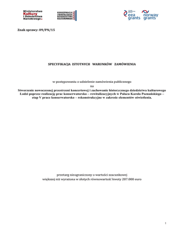Stworzenie nowoczesnej przestrzeni koncertowej i zachowanie historycznego dziedzictwa kulturowego Łodzi poprzez realizację prac konserwatorsko – rewitalizacyjnych w Pałacu Karola Poznańskiego – etap V prace konserwatorsko – rekonstrukcyjne w zakresie elementów oświetlenia. 1 Akademia Muzyczna im. Grażyny i Kiejstuta Bacewiczów w Lodzi 90-716 Łódź, ul. Gdańska 32 NIP: 7240005176 Tel.: +48 42 662 16 02 fax.: + 48 42 662 16 66 e-mail: [email protected] www.amuz.lodz.pl - - – – – . 3.2. a) b) c) d) e) f) g) h) 3.3. a) b) - c) d) e) 3.3. 2 - 3.7. Kody opisujące przedmiot zamówienia (słownik CPV): 92312000-1 Usługi artystyczne 92522100-7 Usługi ochrony obiektów historycznych 45262110-5 Demontaż rusztowań 45262120-8 Wznoszenie rusztowań 45453100-8 Roboty renowacyjne 31524120-2 Oświetlenie sufitowe 31524210-0 Oświetlenie ścienne 44317000-5 Zawiesia żelazne lub stalowe 3.8. Zamawiający zaleca, przed złożeniem oferty, dokonanie wizji lokalnej. W tym celu należy skontaktować się z 3.9. M 3.10. 3.11. 3.12. 3 a) b) - 4 a) b) – 5 – – – – – - - 6 – – - a) b) c) 6.4.6. i 6.4.8. - składa zaświadczenie właściwego organu sądowego lub administracyjnego miejsca zamieszkania albo zamieszkania osoby, której dokumenty dotyczą, w zakresie określonym w art. 24 ust. 1 pkt 4 -8, 10 i 11 Ustawy, wystawione nie wcześniej niż 6 miesięcy przed upływem terminu składania ofert. 6.4.11. Jeżeli w kraju miejsca zamieszkania osoby lub w kraju, w którym Wykonawca ma siedzibę lub miejsce zamieszkania, nie wydaje się dokumentów, o których mowa w pkt 6.3.10, zastępuje się je dokumentem zawierającym oświadczenie, w którym określa się także osoby uprawnione do reprezentacji Wykonawcy, złożone przed właściwym organem sądowym, administracyjnym albo organem samorządu zawodowego lub gospodarczego odpowiednio kraju miejsca zamieszkania osoby lub kraju, w którym Wykonawca ma siedzibę lub miejsce zamieszkania lub przed notariuszem. Wymagania z pkt 6.3.10 co do terminu wystawienia stosuje się odpowiednio. a) – b) c) – Wykonawcy, którzy nie wykażą spełniania warunków udziału w postępowaniu, o których mowa w art. 22 ust.1 ustawy Pzp oraz Wykonawcy wobec, których wystąpią przesłanki wykluczenia, o których mowa w art. 24 ust. 1 ustawy Pzp. 7 6a.1. a) b) c) d) e) f) g) h) i) j) k) l) m) Hall główny, piętro Szkic koncepcyjny kinkietów (jednego z ośmiu). 6a.2. 6a.3. - 8 ) 6a.4. 6a.5. 6a.6. UWAGA: Zamawiający nie wymaga złożenia wraz z ofertą szkiców koncepcyjnych 2 lamp do korytarza przy Sali nr 25, 1 lampy do korytarza przy sali nr 3 oraz 1 lampy przy sali nr 27 wskazanych w przedmiarze stanowiącym załącznik nr 8c do siwz. Forma i wygląd przedmiotowych lamp zostanie uzgodniona z Zamawiającym na etapie realizacji zamówienia. 7.1. 7.2. 7.3. a) b) - c) d) e) 7.4. 9 7.5. 7.6. 7.7. a) b) c) d) e) 7.8. 7.9. 8.1. 8.2. 8.3. 8.4. 10 8.5. 8.6. 8.7. 8.8. 8.9. 8.10. 8.11. 8.12. 8.13. 8.14. 8.15. 8.16. 8.17. 11 Stworzenie nowoczesnej przestrzeni koncertowej i zachowanie historycznego dziedzictwa kulturowego Łodzi poprzez realizację prac konserwatorsko – rewitalizacyjnych w Pałacu Karola Poznańskiego – etap V prace konserwatorsko – rekonstrukcyjne w zakresie elementów oświetlenia. 8.18. 8.19. 8.20. 8.21. 8.22. - - - - 10.1. 10.2. 10.3. 12 10.4. 10.5. 10.6. 10.7. 10.8. 11.1 11.2 11.3 – – 11.4 A. - ----------- 13 – – B. – a) Szkice nie powinny przedstawiać kopii elementów oświetlenia z sal innych budynków . Należy zaprojektować je jako dzieła samoistne, które będą charakterystyczne wyłącznie dla Akademii Muzycznej w Łodzi i wykonane z przeznaczeniem do tego obiektu. Wykonawca może wykorzystać w ornamentyce jedynie elementy zaczerpnięte z jej wystroju. Można też użyć elementów, które nawiążą do historii budynku lub tworzących w nim osób. W przypadku gdy wykonawca będzie inspirował się innym elementami wystroju wnętrza zastosowanymi oryginalnie w Akademii Muzycznej w Łodzi , nie będzie miało to negatywnego wpływu na ocenę. b) Elementy oświetleniowe winny współgrać ze stylistyką pomieszczenia i jego dekoracją ornamentalną. Dekoracja żyrandoli powinna nawiązywać do stylistyki wystroju wnętrza sali do której są przeznaczone. Można przyjąć tu albo dostosowanie zdobień żyrandoli do ornamentyki posadzki lub do dekoracji sufitów. Jeśli projektant przyjmie, że stylistyka żyrandoli ma nawiązywać do stylistyki obiektu, wtedy można uwspólniać ich stylistykę tak, aby powstał niezależny od poszczególnych obiektów spójny zespół żyrandoli. Im wyższa będzie zgodność elementów prezentowanych na szkicach ze tym wyższą ocenę dostanie Wykonawca. c) Żyrandole, jako istotny element dekoracji wnętrza, powinny być dziełami samoistnymi opracowanymi z najwyższą starannością, które prócz walorów użytkowych będą zwracały uwagę widzów, ale nie będą też dominować bogactwem ornamentyki nad dekoracjami sal by nie wprowadzać wrażenia przeładowania zdobieniami. Im wyższa będą walory artystyczne elementów prezentowanych na szkicach tym wyższą ocenę dostanie Wykonawca d) Żyrandole nie mogą być zbyt małe aby nie ginęły optycznie w pomieszczeniach, ani zbyt duże aby nie przytłaczać osób przebywających w salach i przesłaniały ich wystroju. Im lepsze będzie dostosowanie skali i proporcji elementów prezentowanych na szkicach do pomieszczeń do których będą przeznaczone tym wyższą ocenę dostanie Wykonawca 14 Cs= ----------- x100 x 40 % Csi – – 11.5 12.1. 12.2. 12.3. 13.1. Wymagany jest termin płatności wynoszący do 90 dni od dnia otrzymania prawidłowo wystawionej faktury VAT. 13.2. Zamawiający dopuszcza dokonywanie płatności częściowych na podstawie częściowych faktur VAT wystawionych po protokolarnym odbiorze częściowym potwierdzonym Protokołem odbioru częściowego, zgodnie z Harmonogramem rzeczowo-terminow