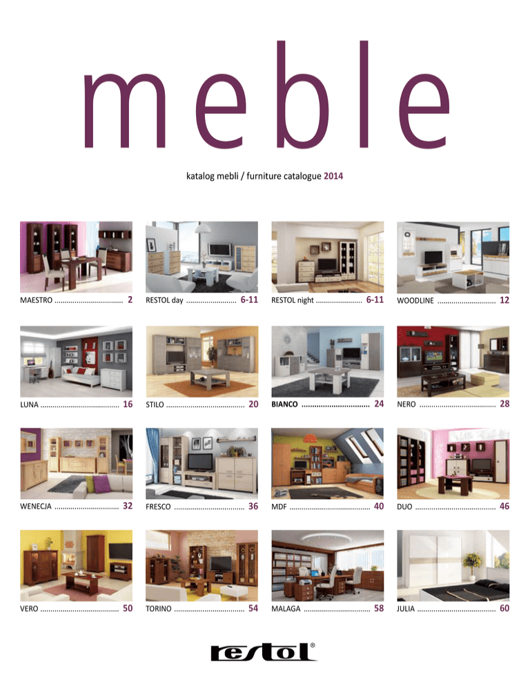 meble katalog mebli / furniture catalogue 2014 MAESTRO . ................................. 2 RESTOL day .......................... 6-11 RESTOL night . ...................... 6-11 WOODLINE .............................. 12 LUNA . ...................................... 16 STILO . ...................................... 20 BIANCO ................................. 24 NERO ....................................... 28 WENECJA ................................. 32 FRESCO .................................... 36 MDF ......................................... 40 DUO ......................................... 46 VERO . ...................................... 50 TORINO . .................................. 54 MALAGA .................................. 58 JULIA ........................................ 60 MAESTRO NOWOŚĆ / NOVELTY System modułowy składa się z 17 elementów Module system consists of 17 components Meble do samodzielnego montażu Ready-to-assemble furniture Projekt / Design: Tomasz Łaganowski Artefact MAESTRO to meble stworzone dla miłośników wyzwań. Wyszukany design jest idealny do jasnych pomieszczeń. Ciekawie zaprojektowane fronty połączone z oryginalnymi uchwytami z litego drewna nadają meblom wyjątkowy charakter. Oświetlenie pozwala na dodatkowe wydobycie urody zastosowanych elementów wykończeniowych, a ilość brył pozwala zaaranżować każde wnętrze w domu. MAESTRO is furniture created for these who love challenges. Sophisticated design is ideal for bright premises. Interesting design of the fronts in connection with original handles made of solid wood make the furniture exceptional. Lighting allows to bring additionally the beauty of the applied finishing elements to the surface, and the number of segments makes it possible to arrange each interior at your home. MAESTRO Witryna MEW-1 (3 szt.), półka MEP-2, komoda MEK-1, stół MEST-2, krzesło MESK-1 (3 szt.) MAESTRO Witryna MEW-3, półka MEP-2, szafka RTV METV-2, witryna MEW-1, ława MEST-2 MAESTRO Szafka MEK-2, szafka RTV METV-2, ława MEST-2 Kolory: sherwood mocca (korpus, fronty), cynamonowa akacja (fronty) Colours: sherwood mocca (body, fronts), cinnamon acacia (fronts) Oświetlenie diodowe jako opcja w witrynach Diode lighting as an option in the display cabinets Pogrubiony blat, specjalnie zaprojektowane obrzeże Thickened board, specially designed edge Bezpieczne hartowane półki szklane Safe tempered glass shelves Bezpieczne, hartowane szkło we frontach Secure, tempered glass in front panels Pogrubione boki z płyty melaminowanej Thickened sides made of melaminated board Z W R Ó Ć U W A G Ę / P a y a t t e n t i o n TO MAESTRO Witryna MEW-3 Ekonomiczne oświetlenie diodowe (opcjonalnie) w witrynach Economic diode lighting in the display cabinets (optionally) Lakierowane uchwyty z litego drewna w kolorze korpusu Varnished handles of solid wood in the same colour as the furniture body Stopki z tworzywa sztucznego w kolorze chrom mat Chrome matte plastic legs Szuflady z samozamykaczem / Drawers with self-closing system Zawiasy firmy Hettich z dożywotnią gwarancją / Hettich hinges with lifetime warranty MAESTRO Komoda MEK-1 MAESTRO – elementy systemu / components of the system NEO-3 NEO-3 witryna MEW-1 50,1/201,5/39,9 prawa/lewa witryna MEW-2 50,1/159,5/39,9 prawa/lewa witryna MEW-3 100,1/159,5/39,9 komoda MEK-1 150,1/80,9/45,3 szafka RTV METV-1 100,1/48,9/45,3 NEO-3 szafka MEK-2 100,1/80,9/45,3 szafka RTV METV-2 150,1/48,9/45,3 ława MEST-2 120/48,3/60 szafa MES-1 50,1/201,5/39,9 prawa/lewa szafa MES-2 100,1/201,5/54,9 biurko MEB-1 135/76/65 szafka MEK-3 100,1/80,9/45,3 stół MEST-2 140/75,9/80 krzesło MESK-1 48/100/46 regał MER-1 50,1/201,5/39,9 półka MEP-1 100,1/35,3/27,2 półka MEP-2 150,1/35,3/27,2 wymiary zewnętrzne: szerokość/wysokość/głębokość / external dimensions: width/hight/depth – element głęboki / deep component – oświetlenie diodowe jako opcja / diode lighting as an option – element narożny (patrz strona 62) / corner component (see p. 62) MAESTRO Regał MER-1, półka MEP-1 (4 szt.), szafka RTV METV-1 (2 szt.), regał MER-1, biurko MEB-1 day RESTOL NOWOŚĆ / NOVELTY night SYSTEM RESTOL day/night w ponad 100 wersjach kolorystycznych SYSTEM RESTOL day/night in more than a hundred (100) colour versions Meble do samodzielnego montażu / Ready-to-assemble furniture Czy marzyło Ci się, żeby fabryka wyprodukowała meble w różnych kolorach specjalnie dla Ciebie? Teraz jest to możliwe na wyciągnięcie ręki. Wybierając ten system sprzedawca nie powie Ci, że producent oferuje meble tylko w jednym kolorze, że trzeba na nie długo czekać i oferta nie jest na Twoją kieszeń. RESTOL day/night to kolekcja mebli, w której nie istnieje słowo kompromis, to system o nieograniczonych możliwościach i ewenement na skalę światową. Nasze kilkunastoletnie doświadczenie w produkcji frontów kuchennych, a zarazem pozycja jednego z liderów tego rynku, zaowocowały zaprojektowaniem mebla o dwóch kolorach korpusu, do którego można wybrać różne fronty z palety kolorów RESTOL. Meble świetnie nadają się do salonu, pokoju młodzieżowego, sypialni czy biura. Jeżeli masz połączony salon z aneksem kuchennym – to nasza oferta jest spełnieniem Twoich marzeń. Nie musisz na siłę dobierać koloru mebli kuchennych do mebli salonie. Teraz wystarczy, że dopasujesz kolor twojej kuchni do palety kolorów RESTOL i kupisz meble do salonu z kolekcji RESTOL day/night w wymarzonym kolorze. Kolor korpusu: jesion komi / Body colour: ash komi Kolor frontu: dowolny z palety kolorów Restol Front colour: any colour from the Restol palette of colours Możliwość wyboru oświetlenia wewnętrznego w szafie narożnej RES-5ND Options include internal lighting in the RES-5ND corner wardrobe RESTOL day Komoda REK-6D213 (2 szt), szafka RTV RETV-3D213, komoda REK-13BD213, ława REST-1D Have you ever dreamt that the plant would manufacture furniture in various colours specially for yo