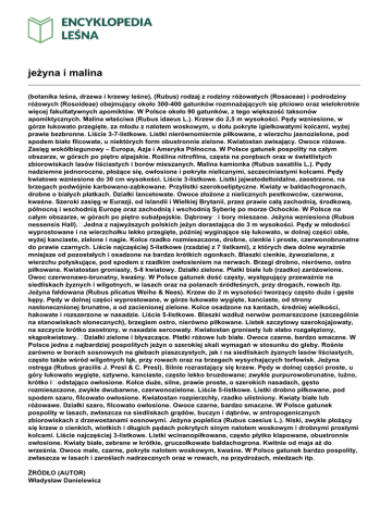 jeżyna i malina (botanika leśna, drzewa i krzewy leśne), (Rubus) rodzaj z rodziny różowatych (Rosaceae) i podrodziny różowych (Rosoideae) obejmujący około 300-400 gatunków rozmnażających się płciowo oraz wielokrotnie więcej fakultatywnych apomiktów. W Polsce około 90 gatunków, z tego większość taksonów apomiktycznych. Malina właściwa (Rubus idaeus L.). Krzew do 2,5 m wysokości. Pędy wzniesione, w górze łukowato przegięte, za młodu z nalotem woskowym, u dołu pokryte igiełkowatymi kolcami, wyżej prawie bezbronne. Liście 3-7-listkowe. Listki nierównomiernie piłkowane, z wierzchu jasnozielone, pod spodem biało filcowate, u niektórych form obustronnie zielone. Kwiatostan zwisający. Owoce różowe. Zasięg wokółbiegunowy – Europa, Azja i Ameryka Północna. W Polsce gatunek pospolity na całym obszarze, w górach po piętro alpejskie. Roślina nitrofilna, częsta na porębach oraz w świetlistych zbiorowiskach lasów liściastych i borów mieszanych. Malina kamionka (Rubus saxatilis L.). Pędy nadziemne jednoroczne, płożące się, owłosione i pokryte nielicznymi, szczeciniastymi kolcami. Pędy kwiatowe wzniesione do 30 cm wysokości. Liście 3-listkowe. Listki jajwatodeltoidalne, zaostrzone, na brzegach podwójnie karbowano-ząbkowane. Przylistki szerokoeliptyczne. Kwiaty w baldachogronach, drobne o białych płatkach. Działki lancetowate. Owoce złożone z nielicznych pestkowców, czerwone, kwaśne. Szeroki zasięg w Eurazji, od Islandii i Wielkiej Brytanii, przez prawie całą zachodnią, środkową, północną i wschodnią Europę oraz zachodnią i wschodnią Syberię po morze Ochockie. W Polsce na całym obszarze, w górach po piętro subalpejskie. Dąbrowy i bory mieszane. Jeżyna wzniesiona (Rubus nessensis Hall). Jedna z najwyższych polskich jeżyn dorastająca do 3 m wysokości. Pędy w młodości wyprostowane i na wierzchołku lekko przegięte, później wyginające się łukowato, w dolnej części obłe, wyżej kanciaste, zielone i nagie. Kolce rzadko rozmieszczone, drobne, cienkie i proste, czerwonobrunatne do prawie czarnych. Liście najczęściej 5-listkowe (rzadziej z 7 listkami), z których dwa dolne wyraźnie mniejsze od pozostałych i osadzone na bardzo krótkich ogonkach. Blaszki cienkie, żywozielone, z wierzchu połyskujące, pod spodem z rzadkim owłosieniem na nerwach. Brzegi drobno, nierówno, ostro piłkowane. Kwiatostan groniasty, 5-8 kwiatowy. Działki zielone. Płatki białe lub (rzadko) zaróżowione. Owoc czerwonawo-brunatny, kwaśny. W Polsce gatunek dość częsty, występujący przeważnie na siedliskach żyznych i wilgotnych, w lasach oraz na polanach śródleśnych, przy drogach, rowach itp. Jeżyna fałdowana (Rubus plicatus Weihe & Nees). Krzew do 2 m wysolości tworzący często duże i gęste kępy. Pędy w dolnej części wyprostowane, w górze łukowato wygięte, kanciaste, od strony nasłonecznionej brunatne, a od zacienionej zielone. Kolce osadzone na kantach, średniej wielkości, hakowate i rozszerzone w nasadzie. Liście 5-listkowe. Blaszki wzdłuż nerwów pomarszczone (szczególnie na stanowiskach słonecznych), brzegiem ostro, nierówno piłkowane. Listek szczytowy szerokojajowaty, na szczycie krótko zaostrzny, w nasadzie sercowaty. Kwiatostan groniasty lub słabo rozgałęziony, skąpokwiatowy. Działki zielone i błyszczące. Płatki różowe lub białe. Owoce czarne, bardzo smaczne. W Polsce jedna z najbardziej pospolitych jeżyn o szerokiej skali wymagań w stosunku do gleby. Rośnie zarówno w borach sosnowych na glebach piaszczystych, jak i na siedliskach żyznych lasów liściastych, często także wśród wilgotnych łąk, przy rowach oraz na brzegach wysychających torfowisk. Jeżyna ostręga (Rubus gracilis J. Presl & C. Presl). Silnie rozrastający się krzew. Pędy w dolnej części proste, u góry łukowato wygięte, sztywne, kanciaste, często lekko bruzdowane; zwykle purpurowobrunatne, luźno, krótko i odstająco owłosione. Kolce duże, silne, prawie proste, o szerokich nasadach, gęsto rozmieszczone, zwykle dwubarwne, czerwonozielone. Liście 5-listkowe. Listki drobno piłkowane, pod spodem szaro, filcowato owłosione. Kwiatostan rozpierzchły, rzadko ulistniony. Kwiaty białe lub różowawe. Działki szaro, filcowato owłosione. Owoce czarne, bardzo smaczne. W Polsce gatunek pospolity w lasach, zwłaszcza na siedliskach grądów, buczyn i dąbrów, w antropogenicznych zbiorowiskach z drzewostanami sosnowymi. Jeżyna popielica (Rubus caesius L.). Niski, zwykle płożący się krzew o cienkich, wiotkich i długich pędach pokrytych sinym nalotem woskowym i drobnymi prostymi kolcami. Liście najczęściej 3-listkowe. Listki wcinanopiłkowane, często płytko klapowane, obustronnie owłosione. Kwiaty białe, zebrane w krótkie, gruczołkowate baldachogrona. Kwitnie od maja aż do września. Owoce małe, czarne, pokryte nalotem woskowym, kwaśne. W Polsce gatunek bardzo pospolity, zwłaszcza w lasach i zaroślach nadrzecznych oraz w rowach, na przydrożach, miedzach itp. ŹRÓDŁO (AUTOR) Władysław Danielewicz