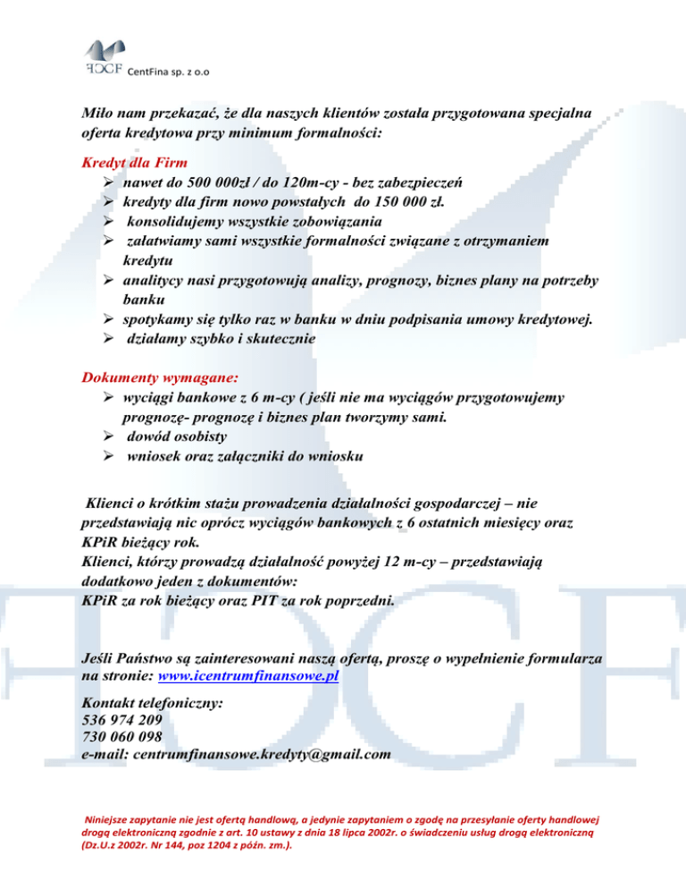 CentFina sp. z o.o Miło nam przekazać, że dla naszych klientów została przygotowana specjalna oferta kredytowa przy minimum formalności: Kredyt dla Firm nawet do 500 000zł / do 120m-cy - bez zabezpieczeń kredyty dla firm nowo powstałych do 150 000 zł. konsolidujemy wszystkie zobowiązania załatwiamy sami wszystkie formalności związane z otrzymaniem kredytu analitycy nasi przygotowują analizy, prognozy, biznes plany na potrzeby banku spotykamy się tylko raz w banku w dniu podpisania umowy kredytowej. działamy szybko i skutecznie Dokumenty wymagane: wyciągi bankowe z 6 m-cy ( jeśli nie ma wyciągów przygotowujemy prognozę- prognozę i biznes plan tworzymy sami. dowód osobisty wniosek oraz załączniki do wniosku Klienci o krótkim stażu prowadzenia działalności gospodarczej – nie przedstawiają nic oprócz wyciągów bankowych z 6 ostatnich miesięcy oraz KPiR bieżący rok. Klienci, którzy prowadzą działalność powyżej 12 m-cy – przedstawiają dodatkowo jeden z dokumentów: KPiR za rok bieżący oraz PIT za rok poprzedni. Jeśli Państwo są zainteresowani naszą ofertą, proszę o wypełnienie formularza na stronie: www.icentrumfinansowe.pl Kontakt telefoniczny: 536 974 209 730 060 098 e-mail: [email protected] Niniejsze zapytanie nie jest ofertą handlową, a jedynie zapytaniem o zgodę na przesyłanie oferty handlowej drogą elektroniczną zgodnie z art. 10 ustawy z dnia 18 lipca 2002r. o świadczeniu usług drogą elektroniczną (Dz.U.z 2002r. Nr 144, poz 1204 z późn. zm.).