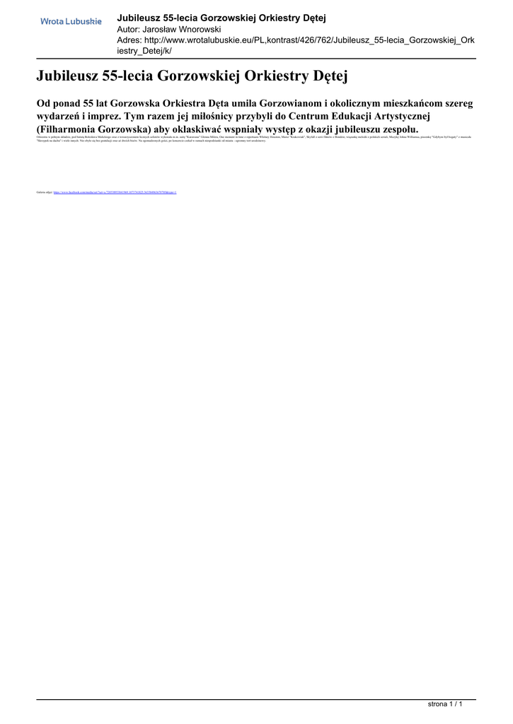 Jubileusz 55-lecia Gorzowskiej Orkiestry Dętej Autor: Jarosław Wnorowski Adres: http://www.wrotalubuskie.eu/PL,kontrast/426/762/Jubileusz_55-lecia_Gorzowskiej_Ork iestry_Detej/k/ Jubileusz 55-lecia Gorzowskiej Orkiestry Dętej Od ponad 55 lat Gorzowska Orkiestra Dęta umila Gorzowianom i okolicznym mieszkańcom szereg wydarzeń i imprez. Tym razem jej miłośnicy przybyli do Centrum Edukacji Artystycznej (Filharmonia Gorzowska) aby oklaskiwać wspniały występ z okazji jubileuszu zespołu. Orkiestra w pełnym składzie, pod batutą Bolesława Malickiego oraz z towarzyszeniem licznych solistów wykonała m.in. suitę "Karawana" Glenna Milera, One moment in time z repertuaru Whitney Houston, Marsz "Krakowiak", Skyfall z serii filmów o Bondzie, wiązankę melodii z polskich seriali, Muzykę Johna Williamsa, pisoenkę "Gdybym był bogaty" z musicalu "Skrzypek na dachu" i wiele innych. Nie obyło się bez gratulacji oraz aż dwóch bisów. Na zgomadzonych gości, po koncercie czekał w ramach niespodzianki od miasta - ogromny tort urodzinowy. Galeria zdjęć: https://www.facebook.com/media/set/?set=a.728538953841969.1073741825.363584963670705&type=1 strona 1 / 1 Powered by TCPDF (www.tcpdf.org)