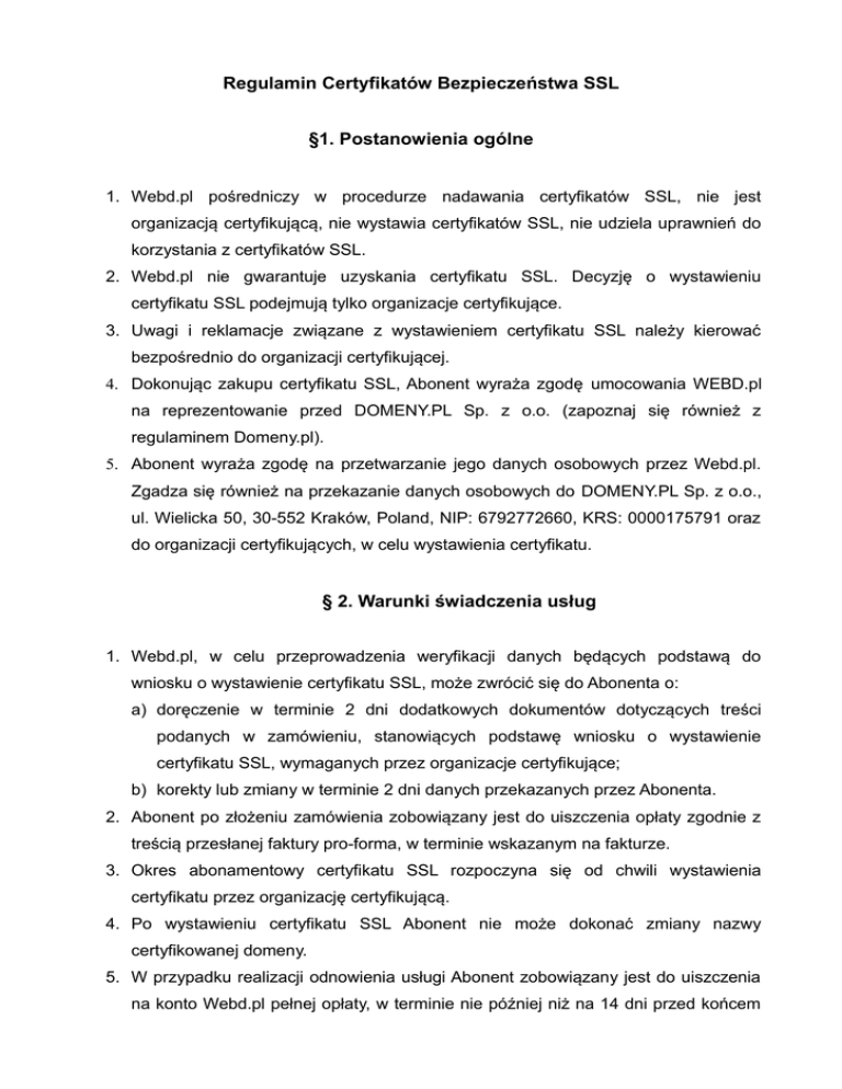 Regulamin Certyfikatów Bezpieczeństwa SSL §1. Postanowienia ogólne 1. Webd.pl pośredniczy w procedurze nadawania certyfikatów SSL, nie jest organizacją certyfikującą, nie wystawia certyfikatów SSL, nie udziela uprawnień do korzystania z certyfikatów SSL. 2. Webd.pl nie gwarantuje uzyskania certyfikatu SSL. Decyzję o wystawieniu certyfikatu SSL podejmują tylko organizacje certyfikujące. 3. Uwagi i reklamacje związane z wystawieniem certyfikatu SSL należy kierować bezpośrednio do organizacji certyfikującej. 4. Dokonując zakupu certyfikatu SSL, Abonent wyraża zgodę umocowania WEBD.pl na reprezentowanie przed DOMENY.PL Sp. z o.o. (zapoznaj się również z regulaminem Domeny.pl). 5. Abonent wyraża zgodę na przetwarzanie jego danych osobowych przez Webd.pl. Zgadza się również na przekazanie danych osobowych do DOMENY.PL Sp. z o.o., ul. Wielicka 50, 30-552 Kraków, Poland, NIP: 6792772660, KRS: 0000175791 oraz do organizacji certyfikujących, w celu wystawienia certyfikatu. § 2. Warunki świadczenia usług 1. Webd.pl, w celu przeprowadzenia weryfikacji danych będących podstawą do wniosku o wystawienie certyfikatu SSL, może zwrócić się do Abonenta o: a) doręczenie w terminie 2 dni dodatkowych dokumentów dotyczących treści podanych w zamówieniu, stanowiących podstawę wniosku o wystawienie certyfikatu SSL, wymaganych przez organizacje certyfikujące; b) korekty lub zmiany w terminie 2 dni danych przekazanych przez Abonenta. 2. Abonent po złożeniu zamówienia zobowiązany jest do uiszczenia opłaty zgodnie z treścią przesłanej faktury pro-forma, w terminie wskazanym na fakturze. 3. Okres abonamentowy certyfikatu SSL rozpoczyna się od chwili wystawienia certyfikatu przez organizację certyfikującą. 4. Po wystawieniu certyfikatu SSL Abonent nie może dokonać zmiany nazwy certyfikowanej domeny. 5. W przypadku realizacji odnowienia usługi Abonent zobowiązany jest do uiszczenia na konto Webd.pl pełnej opłaty, w terminie nie później niż na 14 dni przed końcem okresu ważności obecnego certyfikatu SSL. 6. Webd.pl nie ponosi odpowiedzialności za skutki upływu ważności certyfikatu SSL oraz nie nadania na rzecz Abonenta ponownego certyfikatu SSL. 7. W sprawach, które nie zostały uregulowane w niniejszym Regulaminie Certyfikatów Bezpieczeństwa SSL mają zastosowanie zapisy głównego Regulaminu Webd.pl dostępnego na stronie www.webd.pl.