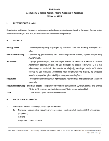 REGULAMIN Abonamenty w Teatrze Wielkim – Operze Narodowej w Warszawie SEZON 2016/2017 I. PRZEDMIOT REGULAMINU Przedmiotem niniejszego Regulaminu jest wprowadzenie Abonamentów obowiązujących w Bieżących Sezonie, w tym określenie ich rodzajów oraz cen, jak również ustanowienie zasad ich sprzedaży. II. DEFINICJE Bieżący sezon - sezon artystyczny, który rozpoczyna się 1 września 2016 roku a kończy 31 sierpnia 2017 roku; Bilet abonamentowy - jednorazowy, jednoosobowy bilet z dodatkowym oznakowaniem, napisem lub pieczęcią: ABONAMENT. Abonament - grupa jednorazowych, jednoosobowych biletów na określone spektakle w Sezonie. Abonamenty obejmują miejsca na Sali Moniuszki w strefach cenowych I-V i w Sali Młynarskiego w strefie I-III. Abonamenty nie obejmują najtańszych miejsc w VI strefie cenowej w Sali Moniuszki. Abonament może obejmować inne miejsca, niż wskazane powyżej w przypadku, gdy spektakl jest grany poza siedzibą Teatru; Regulamin - niniejszy Regulamin w sprawie wprowadzenia Abonamentów na Bieżący Sezon i zasad ich sprzedaży; Regulamin rezerwacji i sprzedaży biletów – Regulamin wprowadzony zarządzeniem Dyrektora teatru z dnia 20 maja 2016 r. Nr 11, dostępny na stronie internetowej Teatru – www.teatrwielki.pl; Teatr - Teatr Wielki - Opera Narodowa w Warszawie; III. RODZAJE ABONAMENTÓW 1. W Bieżącym Sezonie obowiązują następujące Abonamenty: (a) Premiery - Abonament na wszystkie premiery operowe i baletowe w Sali Moniuszki i Sali Młynarskiego (7 spektakli): Goplana Chopiniana / Bolero / Chroma 1 Czarodziejski flet Turek we Włoszech Jezioro łabędzie Umarłe miasto Darkness (b) Opera: Arcydzieła literatury - Abonament operowy (6 spektakli): Pasażerka Goplana* Oniegin Wilhelm Tell Traviata Moby Dick (c) Opera: Orient Express - Abonament operowy (6 spektakli) Straszny dwór Głos ludzki Nabucco Turek we Włoszech* Matsukaze Madame Butterfly (d) Balet: Wielka klasyka - Abonament baletowy (6 spektakli) Bajadera Chopiniana / Bolero / Chroma* Dziadek do orzechów i król myszy Don Kichot Poskromienie złośnicy Jezioro łabędzie* (e) Balet: Tylko u nas - Abonament baletowy (6 spektakli) Persona Burza Chopiniana / Bolero / Chroma* Obsesje Casanova w Warszawie Darkness* 2 (f) Opera i Balet: Abonament dla dużych i małych Goplana* Czarodziejski flet* Dziadek do orzechów i król myszy Bajko, gdzie jesteś? (baśń muzyczna) Teatr bez kurtyny (projekt edukacyjny) (g) Abonamenty edukacyjne WIELKI DLA MAŁYCH 5+ - Poranki Muzyczne (z opiekunem) WIELKI DLA 10+ - Spotkania z Wirtuozem (z opiekunem) - Uniwersytet Wiedzy Operowej (bez opiekuna) WIELKI DLA 25+ - Uniwersytet Wiedzy Operowej (h) Mój Abonament: Mój Teatr Wielki - Opera Narodowa - 7 dowolnych, różnych tytułów spektakli operowych i/lub baletowych z oferty repertuarowej Teatru (po jednym bilecie na tytuł). Nie obejmuje spotkań w ramach działań edukacyjnych. Nie dotyczy spektakli w dniu premiery. IV. CENY ABONAMENTÓW 1. Cena jednego Abonamentu to suma aktualnych cen biletów standardowych na spektakle w ramach Abonamen tu, z zastrzeżeniem następujących zwyżek i rabatów: (a) przy Abonamencie premierowym stosowana jest zwyżka 25% na każdy bilet; (b) przy Abonamencie Mój Abonament stosowana jest zwyżka 15% na każdy bilet; (c) przy Abonamentach: Opera: Arcydzieła literatury, Opera: Orient Express, Balet: Wielka klasyka, Balet: Tylko u nas, Opera i Balet: Abonament dla dużych i małych stosowana jest zniżka 10%. (d) przy abonamentach edukacyjnych: (i) Poranki muzyczne - ceny zostały ustalone na poziomie 15 zł opiekun i 10 zł dziecko za udział w jednych zajęciach. Abonament obejmuje 6 spotkań. Opiekun ma prawo wykupić Abonament maksymalnie dla piątki dzieci. (ii) Spotkania z wirtuozem instrumentu - ceny zostały ustalone na poziomie 23 zł opiekun i 18 zł dziecko za udział w jednych zajęciach. Abonament obejmuje 5 spotkań. Opiekun ma prawo wy kupić Abonament maksymalnie dla piątki dzieci. 3 (iii) Uniwersytet wiedzy operowej dla dzieci – cena została ustalona na poziomie 13 zł od osoby (wejście bez opiekunów) za udział w jednych zajęciach. Abonament obejmuje 9 spotkań. W zajęciach udział biorą wyłącznie dzieci. Dodatkowo w ramach Abonamentu przysługuje udział w spotkaniu Teatr bez kurtyny. W zajęciach udział biorą wyłącznie dzieci. (iv) Uniwersytet wiedzy operowej dla dorosłych - cena została ustalona na poziomie 23 zł od osoby za udział w jednych zajęciach. Abonament obejmuje 9 spotkań. Dodatkowo w ramach Abonamentu przysługuje udział w spotkaniu Teatr bez kurtyny. 2. Przy zakupie Abonamentów nie obowiązują zniżki określone w regulaminie rezerwacji i sprzedaży biletów. V. SPRZEDAŻ: ZASADY, MECHANIZM, OKRESY SPRZEDAŻY 1. Abonamenty zakładane są poza kasami, w osobnym stanowisku w Biurze Organizacji Widowni (BOW) z wykupem w kasie Teatru. 2. Przy zakupie Abonamentu widz deklaruje jego rodzaj i strefę cenową miejsc, z których chciałby skorzystać , a Teatr oferuje dostępne miejsca oraz daty spektakli w ramach zadeklarowanego Abonamentu. 3. Widz nie może zmieniać tytułów, dat ani ilości spektakli w ramach zakupionego Abonamentu. 4. Do każdego Abonamentu dołącza się formularz umożliwiający pozostawienie danych osobowych i ankietę do wypełnienia przez widza. Ankieta wypełniania jest w chwili zakładania Abonamentu. Wzór formularza wraz z ankietą stanowi Załącznik nr 1 do Regulaminu; 5. Widz powierza Teatrowi swoje dane teleadresowe wypełniając ankietę. Dane teleadresowe służą celom związanym z obsługą Abonamentów, a w szczególności informowania abonentów o wszelkich kwestiach związanych z wykupionymi przez nich Abonamentami (przykładowo: o odwołaniu, zmianie terminu spektaklu, zmianach w obsadzie itp.). Dane teleadresowe mogą zostać również wykorzystane w celach marketingowych, a w szczególności do wysyłki newslettera oraz komunikowania o możliwych zmianach w repertuarze Teatru i/l