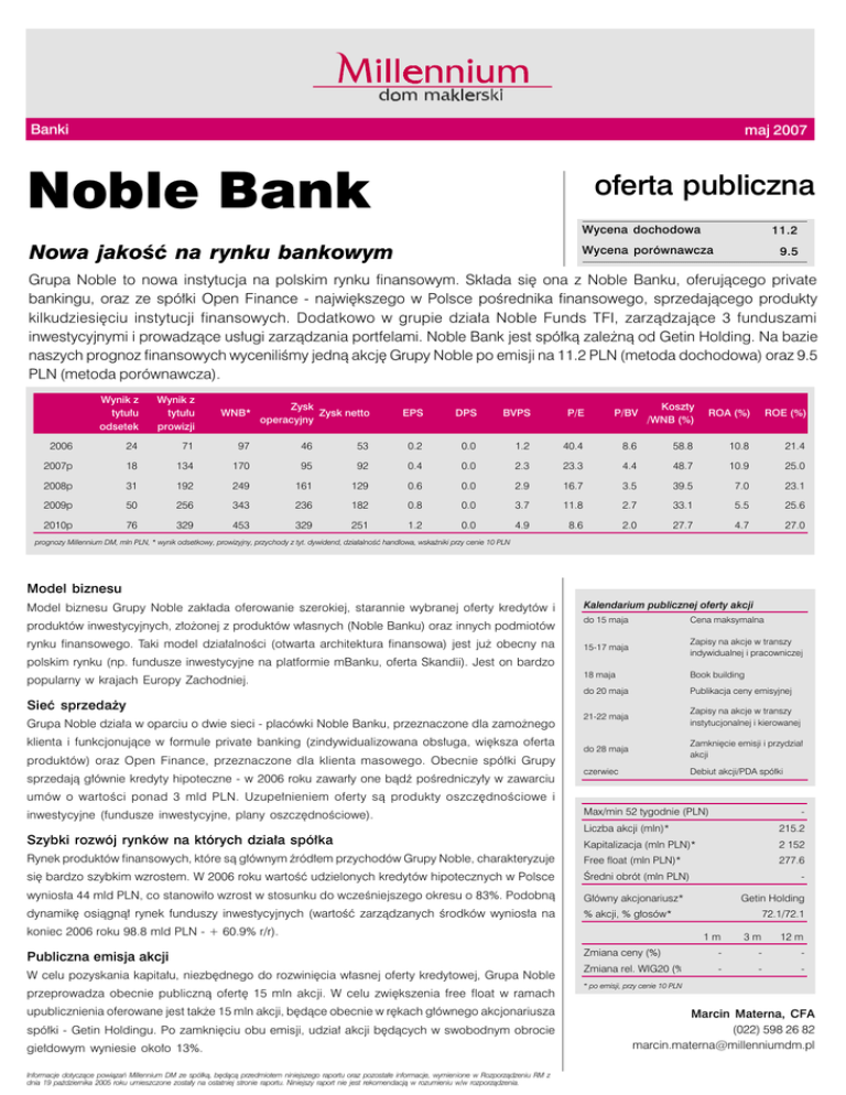 Banki maj 2007 Noble Bank oferta publiczna Wycena dochodowa Nowa jakość na rynku bankowym 11.2 Wycena porównawcza 9.5 Grupa Noble to nowa instytucja na polskim rynku finansowym. Składa się ona z Noble Banku, oferującego private bankingu, oraz ze spółki Open Finance - największego w Polsce pośrednika finansowego, sprzedającego produkty kilkudziesięciu instytucji finansowych. Dodatkowo w grupie działa Noble Funds TFI, zarządzające 3 funduszami inwestycyjnymi i prowadzące usługi zarządzania portfelami. Noble Bank jest spółką zależną od Getin Holding. Na bazie naszych prognoz finansowych wyceniliśmy jedną akcję Grupy Noble po emisji na 11.2 PLN (metoda dochodowa) oraz 9.5 PLN (metoda porównawcza). Wynik z tytu³u odsetek Wynik z tytu³u prowizji WNB* 2006 24 71 97 46 2007p 18 134 170 2008p 31 192 2009p 50 256 2010p 76 329 Zysk Zysk netto operacyjny EPS DPS BVPS P/E P/BV Koszty /WNB (%) ROA (%) ROE (%) 53 0.2 0.0 1.2 40.4 8.6 58.8 10.8 21.4 95 92 0.4 0.0 2.3 23.3 4.4 48.7 10.9 25.0 249 161 129 0.6 0.0 2.9 16.7 3.5 39.5 7.0 23.1 343 236 182 0.8 0.0 3.7 11.8 2.7 33.1 5.5 25.6 453 329 251 1.2 0.0 4.9 8.6 2.0 27.7 4.7 27.0 prognozy Millennium DM, mln PLN, * wynik odsetkowy, prowizyjny, przychody z tyt. dywidend, dzia³alnoæ handlowa, wskaniki przy cenie 10 PLN Model biznesu Model biznesu Grupy Noble zakłada oferowanie szerokiej, starannie wybranej oferty kredytów i produktów inwestycyjnych, złożonej z produktów własnych (Noble Banku) oraz innych podmiotów rynku finansowego. Taki model działalności (otwarta architektura finansowa) jest już obecny na Kalendarium publicznej oferty akcji do 15 maja Cena maksymalna 15-17 maja Zapisy na akcje w transzy indywidualnej i pracowniczej 18 maja Book building do 20 maja Publikacja ceny emisyjnej 21-22 maja Zapisy na akcje w transzy instytucjonalnej i kierowanej do 28 maja Zamkniêcie emisji i przydzia³ akcji czerwiec Debiut akcji/PDA spó³ki polskim rynku (np. fundusze inwestycyjne na platformie mBanku, oferta Skandii). Jest on bardzo popularny w krajach Europy Zachodniej. Sieć sprzedaży Grupa Noble działa w oparciu o dwie sieci - placówki Noble Banku, przeznaczone dla zamożnego klienta i funkcjonujące w formule private banking (zindywidualizowana obsługa, większa oferta produktów) oraz Open Finance, przeznaczone dla klienta masowego. Obecnie spółki Grupy sprzedają głównie kredyty hipoteczne - w 2006 roku zawarły one bądź pośredniczyły w zawarciu umów o wartości ponad 3 mld PLN. Uzupełnieniem oferty są produkty oszczędnościowe i inwestycyjne (fundusze inwestycyjne, plany oszczędnościowe). Max/min 52 tygodnie (PLN) - Liczba akcji (mln)* 215.2 Szybki rozwój rynków na których działa spółka Kapitalizacja (mln PLN)* 2 152 Rynek produktów finansowych, które są głównym źródłem przychodów Grupy Noble, charakteryzuje Free float (mln PLN)* 277.6 się bardzo szybkim wzrostem. W 2006 roku wartość udzielonych kredytów hipotecznych w Polsce redni obrót (mln PLN) wyniosła 44 mld PLN, co stanowiło wzrost w stosunku do wcześniejszego okresu o 83%. Podobną G³ówny akcjonariusz* dynamikę osiągnął rynek funduszy inwestycyjnych (wartość zarządzanych środków wyniosła na % akcji, % g³osów* koniec 2006 roku 98.8 mld PLN - + 60.9% r/r). Publiczna emisja akcji W celu pozyskania kapitału, niezbędnego do rozwinięcia własnej oferty kredytowej, Grupa Noble przeprowadza obecnie publiczną ofertę 15 mln akcji. W celu zwiększenia free float w ramach upublicznienia oferowane jest także 15 mln akcji, będące obecnie w rękach głównego akcjonariusza spółki - Getin Holdingu. Po zamknięciu obu emisji, udział akcji będących w swobodnym obrocie giełdowym wyniesie około 13%. Informacje dotyczące powiązań Millennium DM ze spółką, będącą przedmiotem niniejszego raportu oraz pozostałe informacje, wymienione w Rozporządzeniu RM z dnia 19 października 2005 roku umieszczone zostały na ostatniej stronie raportu. Niniejszy raport nie jest rekomendacją w rozumieniu w/w rozporządzenia. Getin Holding 72.1/72.1 1m 3m 12 m Zmiana ceny (%) - - - Zmiana rel. WIG20 (% - - - * po emisji, przy cenie 10 PLN Marcin Materna, CFA (022) 598 26 82 [email protected] SPIS TREŚCI Podsumowanie inwestycyjne ……………………………………………………………………3 3 Czynniki ryzyka …………………………………………………………………… 5 5 Emisja nowych akcji …………………………………………………………………… 7 Wycena …………………………………………………………………… 8 7 8 Metoda ROE-P/BV …………………………………………………………………… 8 8 Metoda porównawcza …………………………………………………………………… 9 Noble Bank …………………………………………………………………… 11 Model biznesu …………………………………………………………………… 11 11 11 Z WBC do Noble Banku …………………………………………………………………… 12 Akcjonariat …………………………………………………………………… 13 9 12 13 Oferowane usługi …………………………………………………………………… 13 13 Produkty inwestycyjne i oszczędnościowe …………………………………………………………………… 14 Noble TFI …………………………………………………………………… 14 14 14 Produkty kredytowe …………………………………………………………………… 16 16 Potencjalni klienci …………………………………………………………………… 17 17 Współpraca z innymi podmiotami …………………………………………………………………… 18 Sieć sprzedaży ……………………………………………………………………