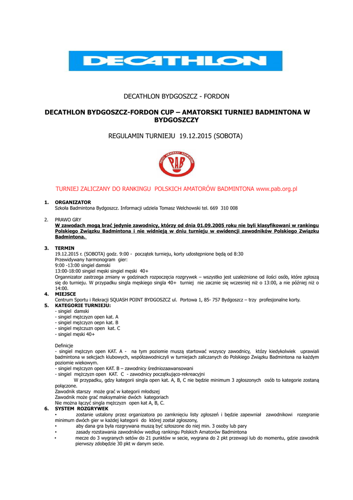 DECATHLON BYDGOSZCZ - FORDON DECATHLON BYDGOSZCZ-FORDON CUP – AMATORSKI TURNIEJ BADMINTONA W BYDGOSZCZY REGULAMIN TURNIEJU 19.12.2015 (SOBOTA) TURNIEJ ZALICZANY DO RANKINGU POLSKICH AMATORÓW BADMINTONA www.pab.org.pl 1. ORGANIZATOR Szkoła Badmintona Bydgoszcz. Informacji udziela Tomasz Welchowski tel. 669 310 008 2. PRAWO GRY W zawodach mogą brać jedynie zawodnicy, którzy od dnia 01.09.2005 roku nie byli klasyfikowani w rankingu Polskiego Związku Badmintona i nie widnieją w dniu turnieju w ewidencji zawodników Polskiego Związku Badmintona. 3. TERMIN 19.12.2015 r. (SOBOTA) godz. 9:00 - początek turnieju, korty udostępnione będą od 8:30 Przewidywany harmonogram gier: 9:00 -13:00 singiel damski 13:00-18:00 singiel męski singiel męski 40+ Organnizator zastrzega zmiany w godzinach rozpoczęcia rozgrywek – wszystko jest uzależnione od ilości osób, które zgłoszą się do turnieju. W przypadku singla męskiego singla 40+ turniej nie zacznie się wczesniej niż o 13:00, a nie później niż o 14:00. MIEJSCE Centrum Sportu i Rekracji SQUASH POINT BYDGOSZCZ ul. Portowa 1, 85- 757 Bydgoszcz – trzy profesjonalne korty. KATEGORIE TURNIEJU: - singiel damski - singiel mężczyzn open kat. A - singiel mężczyzn oepn kat. B - singiel mężczuzn open kat. C - singiel męski 40+ 4. 5. 6. Definicje - singiel mężczyn open KAT. A - na tym poziomie muszą startować wszyscy zawodnicy, któzy kiedykolwiek uprawiali badmintona w sekcjach klubowych, współzawodniczyli w turniejach zaliczanych do Polskiego Związku Badmintona na każdym poziomie wiekowym. - singiel mężczyzn open KAT. B – zawodnicy średniozaawansowani - singiel mężczyzn open KAT. C - zawodnicy początkująco-rekreacyjni W przypadku, gdzy kategorii singla open kat. A, B, C nie będzie minimum 3 zgłoszonych osób to kategorie zostaną połączone. Zawodnik starszy może grać w kategorii młodszej Zawodnik może grać maksymalnie dwóch kategoriach Nie można łączyć singla mężczyzn open kat A, B, C. SYSTEM ROZGRYWEK • zostanie ustalony przez organizatora po zamknięciu listy zgłoszeń i będzie zapewniał zawodnikowi rozegranie minimum dwóch gier w każdej kategorii do której został zgłoszony, • aby dana gra była rozgrywana muszą być szłoszone do niej min. 3 osoby lub pary • zasady rozstawania zawodników według rankingu Polskich Amatorów Badmintona • mecze do 3 wygranych setów do 21 punktów w secie, wygrana do 2 pkt przewagi lub do momentu, gdzie zawodnik pierwszy zdobędzie 30 pkt w danym secie. 7. LOTKI • • • 8. 9. dostarczają uczestnicy obowiązuja lotki piórowe, chyba że bezpośrednio zainteresowani postanowia inaczej, organnizator zabezpiecza możliwość nabycia lotek na miejscu. OPŁATA STARTOWA W KATEGORIACH INDYWIDUALNYCH • 25 zł za start w jednej kategorii turnieju • 40 zł za start w dwóch kategoriach turnieju • opłata startowa jest dokonywana bezpośrednio przed turniejem u organizatora. OPIEKA MEDYCZNA • zawodnicy biorą udział w zawodach na własną odpowiedzialność 10. NAGRODY • zdobywcy miejsc 1-3 w każdej grze/kategorii otrzymuja puchary 11. SPONSORZY i PARTNERZY • DECATHLON BYDGOSZCZ • BABOLAT POLSKA • KLUB METRO BYDGOSZCZ • BOOST UP BYDGOSZCZ • SQUASH POINT BYDGOSZCZ • BYDGOSKA SZKOŁA BADMINTONA • PORTAL – TYM ŻYJĘ BYDGOSZCZ (ZDJĘCIA) Turniej rozgrywany zgodnie z przepisami Polskiego Związku Badmintona oraz Polskich Amatorów Badmintona W imieniu oragnizatorów zaprasza serdecznie Tomasz Welchowski FORMULARZ ZGŁOSZENIOWY DO TURNIEJU: Dokonując zgłoszenia akcetpuję Regulamin Turnieju. 1. Imię i nazwisko zawodnika …....................................................................... 2. Data urodzenia: …........................................................................................ 3. Miasto: ….................................................................................................... 4. Telefon kontaktowy: ….................................................................................. 5. Kategorie: • singiel damski • singiel mężczyzn open kat. A tak/nie* • sinigiel męzczyzn open kat. B tak/nie* • singiel mężczyzn open kaT C tak/ nie* • singiel mężczyzn kat. 40+ tak/nie* * niepotrzebne skreślić Zgłoszenie przyjmowane będą do 18 grudnia do godz. 18:00