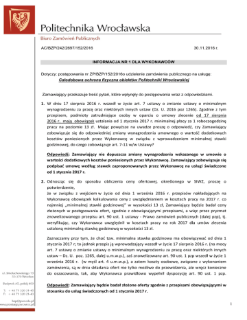 AC/BZP/242/2697/152/2016 30.11.2016 r. INFORMACJA NR 1 DLA WYKONAWCÓW Dotyczy: postępowania nr ZP/BZP/152/2016o udzielenie zamówienia publicznego na usługę: Całodobowa ochrona fizyczna obiektów Politechniki Wrocławskiej Zamawiający przekazuje treść pytań, które wpłynęły do postępowania wraz z odpowiedziami. 1. W dniu 17 sierpnia 2016 r. wszedł w życie art. 7 ustawy o zmianie ustawy o minimalnym wynagrodzeniu za pracę oraz niektórych innych ustaw (Dz. U. 2016 poz 1265). Zgodnie z tym przepisem, podmioty zatrudniające osoby w oparciu o umowy zlecenie od 17 sierpnia 2016 r. mają obowiązek ustalania od 1 stycznia 2017 r. minimalnej płacy za 1 roboczogodzinę pracy na poziomie 13 zł. Mając powyższe na uwadze proszę o odpowiedź, czy Zamawiający zobowiązuje się do odpowiedniej zmiany wynagrodzenia umownego o wartość dodatkowych kosztów poniesionych przez Wykonawcę w związku z wprowadzeniem minimalnej stawki godzinowej, do czego zobowiązuje art. 7-11 w/w Ustawy? Odpowiedź: Zamawiający nie dopuszcza zmiany wynagrodzenia wskazanego w umowie o wartości dodatkowych kosztów poniesionych przez Wykonawcę. Zamawiający zobowiązuje się podpisać umowę według stawek zaproponowanych przez Wykonawcę na usługi świadczone od 1 stycznia 2017 r. 2. Odnosząc się do sposobu obliczenia ceny ofertowej, określonego w SIWZ, proszę o potwierdzenie, że w związku z wejściem w życie od dnia 1 września 2016 r. przepisów nakładających na Wykonawcę obowiązek kalkulowania ceny z uwzględnianiem w kosztach pracy na 2017 r. co najmniej „minimalnej stawki godzinowej” w wysokości 13 zł, Zamawiający będzie badał ceny złożonych w postępowaniu ofert, zgodnie z obowiązującymi przepisami, a więc przez pryzmat znowelizowanego przepisu art. 90 ust. 1 ustawy - Prawo zamówień publicznych (dalej pzp), tj. weryfikując, czy Wykonawca uwzględnił w kosztach pracy na rok 2017 dla umów zlecenia ustaloną minimalną stawkę godzinową w wysokości 13 zł. Zaznaczamy przy tym, że choć tzw. minimalna stawka godzinowa ma obowiązywać od dnia 1 stycznia 2017 r; to jednak przepis ją wprowadzający wszedł w życie 17 sierpnia 2016 r. (na mocy art. 7 ustawy o zmianie ustawy o minimalnym wynagrodzeniu za pracę oraz niektórych innych ustaw – Dz. U. poz. 1265, dalej u.m.w.p.), zaś znowelizowany art. 90 ust. 1 pzp wszedł w życie 1 września 2016 r. (w myśl art. 4 u.m.w.p.), a zatem koszty osobowe, związane z wykonaniem zamówienia, są w dniu składania ofert nie tylko możliwe do przewidzenia, ale wręcz konieczne do oszacowania, tak, aby Wykonawca prawidłowo wypełnił dyspozycję art. 90 ust. 1 pzp. Odpowiedź: Zamawiający będzie badał złożone oferty zgodnie z przepisami obowiązującymi w stosunku do usług świadczonych od 1 stycznia 2017 r. 1 3. Czy w związku z ogłoszeniem wysokości minimalnego wynagrodzenia za pracę na 2017 r. (Rozporządzenie Rady Ministrów z dnia 9 września 2016 r. - Dz. U. z 2016 r. poz. 1456) oraz wysokości minimalnej stawki godzinowej (Obwieszczenie Prezesa Rady Ministrów z dnia 21 września 2016 r.w sprawie wysokości minimalnej stawki godzinowej w 2017 r. – M.P. nr 934) Wykonawca winien w cenie swej oferty skalkulować koszty pracy na 2017r. w znanej na dzień składania ofert wysokości, tj. min. 2000 zł na umowę o pracę oraz min. 13 zł za 1 roboczogodzinę pracy na umowę - zlecenie, czy też Zamawiający nie stawia takiego wymagania i po zawarciu umowy, na wniosek Wykonawcy, dokona odpowiedniej waloryzacji wynagrodzenia umownego o wartość dodatkowych kosztów poniesionych przez Wykonawcę w związku ze zmianą wysokości minimalnego wynagrodzenia za pracę oraz wprowadzeniem minimalnej stawki godzinowej? Odpowiedź: Zamawiający nie dopuszcza waloryzacji wynagrodzenia zawartego w umowie o wartość dodatkowych kosztów poniesionych przez Wykonawcę. 4. Czy każdy Konsorcjant uczestniczący w postępowaniu powinien posiadać certyfikat ISO, czy wystarczy żeby jeden z nich go miał? Odpowiedź: Każdy Konsorcjant uczestniczący w postępowaniu przetargowym, powinien posiadać certyfikat ISO. KANCLERZ Politechniki Wrocławskiej dr inż. Jarosław M. Janiszewski 2