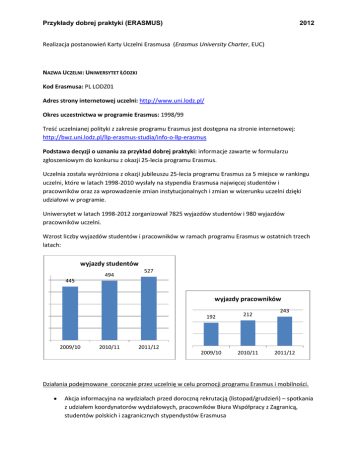 Przykłady dobrej praktyki (ERASMUS) 2012 Realizacja postanowień Karty Uczelni Erasmusa (Erasmus University Charter, EUC) NAZWA UCZELNI: UNIWERSYTET ŁÓDZKI Kod Erasmusa: PL LODZ01 Adres strony internetowej uczelni: http://www.uni.lodz.pl/ Okres uczestnictwa w programie Erasmus: 1998/99 Treść uczelnianej polityki z zakresie programu Erasmus jest dostępna na stronie internetowej: http://bwz.uni.lodz.pl/llp-erasmus-studia/info-o-llp-erasmus Podstawa decyzji o uznaniu za przykład dobrej praktyki: informacje zawarte w formularzu zgłoszeniowym do konkursu z okazji 25-lecia programu Erasmus. Uczelnia została wyróżniona z okazji jubileuszu 25-lecia programu Erasmus za 5 miejsce w rankingu uczelni, które w latach 1998-2010 wysłały na stypendia Erasmusa najwięcej studentów i pracowników oraz za wprowadzenie zmian instytucjonalnych i zmian w wizerunku uczelni dzięki udziałowi w programie. Uniwersytet w latach 1998-2012 zorganizował 7825 wyjazdów studentów i 980 wyjazdów pracowników uczelni. Wzrost liczby wyjazdów studentów i pracowników w ramach programu Erasmus w ostatnich trzech latach: wyjazdy studentów 494 527 445 wyjazdy pracowników 2009/10 2010/11 2011/12 192 212 2009/10 2010/11 243 2011/12 Działania podejmowane corocznie przez uczelnię w celu promocji programu Erasmus i mobilności. Akcja informacyjna na wydziałach przed doroczną rekrutacją (listopad/grudzień) – spotkania z udziałem koordynatorów wydziałowych, pracowników Biura Współpracy z Zagranicą, studentów polskich i zagranicznych stypendystów Erasmusa Przykłady dobrej praktyki (ERASMUS) 2012 Organizacja Staff Training Week Darmowe 3-miesięczne kursy języków obcych (angielski, francuski, niemiecki, portugalski, hiszpański, włoski) dla zakwalifikowanych na wyjazd Erasmus polskich studentów Wizyty monitorujące w uczelniach partnerskich połączone z targami, infomarketami itp. Udział ekspertów (koordynatorów ECTS i Erasmus, kadry zarządzającej, jednostek i administracji) w seminariach krajowych i zagranicznych podejmujących tematykę mobilności i internacjonalizacji studiów. Wydarzenia, które według uczelni najlepiej promowały mobilność edukacyjną wśród studentów lub mobilność pracowników. Stworzenie LipDub’a z udziałem studentów Erasmus (r.2009). Debaty ogólnouczelniane na temat mobilności (listopad 2009, marzec 2012 – obydwa wydarzenia pod hasłem „Dzień mobilności w UŁ”). Konkursy dla studentów na plakaty promujące program Erasmus oraz na filmy/zdjęcia związane z pobytem na stypendium. Wpływ programu Erasmus na zmiany instytucjonalne i wizerunek uczelni. Wpływ udziału uczelni w programie Erasmus na przygotowanie lub istotną zmianę misji/strategii rozwoju uczelni, planu internacjonalizacji, współpracy partnerskiej, zmiany systemowe. Najnowsza strategia rozwoju uczelni w większym niż wcześniej stopniu uwzględnia internacjonalizację, współpracę naukową i dydaktyczną w ramach projektów międzynarodowych. Doświadczenia i kontakty związane z uczestnictwem w programie Erasmus spowodowały powołanie nowych komórek organizacyjnych (Sekcja Studentów Zagranicznych, Biuro Międzynarodowych Programów Edukacyjnych), przygotowanie nowych modułów w programach nauczania i nowych kierunków studiów (np. italianistyki, kultury krajów germańskich, europeistyki, studiów regionalnych, gender studies), systematyczny udział przedstawicieli UŁ w międzynarodowych targach edukacyjnych. Idea mobilności i internacjonalizacji wpisywana jest w misje i strategie poszczególnych wydziałów. Udział studentów i wykładowców w wymianie Erasmus sprzyja większej akceptacji i efektywności zmian na poziomie jakości kształcenia w uczelni w związku z wprowadzaniem Krajowych Ram Kwalifikacji. Korzystanie ze szkoleń w ramach Erasmus wpływa na zmianę myślenia o mobilności, zwiększa otwartość na obcokrajowców, zachęca pracowników administracyjnych uczelni do uczenia się języków obcych. Zmiany w strukturze organizacyjnej uczelni Utworzenie Sekcji Studentów Zagranicznych w strukturze Biura Współpracy z Zagranicą. Wprowadzenie elektronicznego systemu rejestracji studentów UŁ ubiegających się o wyjazdy stypendialne Erasmus, elektroniczna kwalifikacja na wyjazdy. Przykłady dobrej praktyki (ERASMUS) 2012 System i zasady współpracy między wydziałami, ułatwiający studentom przyjeżdżającym korzystanie z oferty dydaktycznej całej uczelni. Możliwość rejestrowania zagranicznych studentów w systemie USOS. Kadencyjne powoływanie Uczelnianej Komisji ds. Erasmus, Pełnomocnika Rektora ds. Programu Erasmus, Pełnomocnika Rektora ds. ECTS i Procesu Bolońskiego (ściśle współpracujących z Prorektorem ds. współpracy z zagranicą), zespołu wydziałowych i kierunkowych koordynatorów Erasmus i ECTS. Udział przedstawicieli ścisłego grona koordynatorów Erasmus i ECTS w innych ważnych organach uczelnianych, mających wpływ na podejmowanie decyzji w zakresie mobilności i internacjonalizacji studiów (np. Uczelnianej Komisji Dydaktycznej, Uczelnianej Rady ds. Jakości Kształcenia). Tworzenie na poziomie uczelni procedur prawnych regulujących kwestie związane z przebiegiem programu Erasmus i innych programów wymian (m.in. Zarządzenie Rektora UŁ w sprawie zasad zaliczania studentom UŁ okresów studiów realizowanych w uczelniach partnerskich w ramach programów wymiany LLP – Erasmus, Campus Europae i innych pokrewnych), wprowadzające m.in. dokument uzupełniający Learning Agreement. Potwierdzenie znaczenia mobilności i internacjonalizacji studiów, np. przez rozwój programu Erasmus w uczelni (uchwała senatu w sprawie systemu jakości kształcenia w UŁ). Utworzenie nowej matrycy opisu przedmiotu w języku polskim i angielskim, tworzącej bazę do generowania katalogu przedmiotów (pakietu ECTS) na wydziałach/kierunkach. Największe wymienione przez uczelnię sukcesy związane z realizacją mobilności w progr