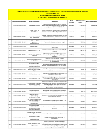 Lista zweryfikowanych technicznie wniosków o dofinansowanie realizacji projektów w ramach konkursu Działanie 3.2 A,B,C 3.2 Efektywność energetyczna w MŚP nr naboruŁ RPDS.03.02.00-IP.01-02-136/16 Lp. Nr wniosku o dofinansowanie Nazwa Wnioskodawcy Tytuł projektu Wynik weryfikacji 1. RPDS.03.02.00-02-0033/16 TERMY JAN KROGSGAARD Wykorzystanie zasobów geotermalnych Szklarskiej Poręby w celu zwiększenia efektywności energetycznej przedsiębiorstwa TERMY JAN KROGSGAARD. negatywny 9 999 900,00 5 089 500,00 2. RPDS.03.02.00-02-0034/16 „ELTOR” sp. z o.o. sp. komandytowa Głęboka modernizacja energetyczna hali przemysłowej zlokalizowanej przy Alei Niepodległości 12A w Lubaniu. pozytywny 3 109 138,74 1 450 455,48 3. RPDS.03.02.00-02-0035/16 Mini Browar i Restauracja „Spiż” Arkadiusz Spiż Głęboka modernizacja energetyczna obiektu owczarni należącego do kompleksu pałacowego w Miłkowie – etap I pozytywny 2 497 596,23 952 269,43 4. RPDS.03.02.00-02-0036/16 Zamek Kliczków Spółka z ograniczoną odpowiedzialnością Termomodernizacja Zamku Kliczków - etap II pozytywny 1 766 337,31 790 500,63 5. RPDS.03.02.00-02-0037/16 Dębowy Dwór s.c. Kompleksowa modernizacja energetyczna budynku Dębowy Dwór pozytywny 1 168 252,74 620 932,14 6. RPDS.03.02.00-02-0038/16 M&M Electronics sp. z o.o. Termomodernizacja obiektu przy ul. Grunwaldzkiej 29 w Głuszycy. pozytywny 1 846 310,10 980 742,33 7. RPDS.03.02.00-02-0039/16 POLARNIK F.U.H. Baranowski Roman Jan Głęboka termomodernizacja budynku magazynowobiurowego zlokalizowanego w Jeleniej Górze przy ul. Podgórze 1B. pozytywny 684 571,51 285 581,25 8. RPDS.03.02.00-02-0040/16 pozytywny 1 505 968,95 894 265,96 9. RPDS.03.02.00-02-0041/16 POLIMARKT SPÓŁKA Z OGRANICZONĄ ODPOWIEDZIALNOŚCIĄ Przebudowa i nadbudowa oraz termomodernizacja budynku usługowego w Bolesławcu przy ul. Zabobrze 1 pozytywny 1 446 321,09 766 076,03 10. RPDS.03.02.00-02-0042/16 Dolnośląskie Centrum Medyczne DOLMED Spółka akcyjna „Przebudowa I i II piętra z termomodernizacją budynku DCM DOLMED S.A. we Wrocławiu" pozytywny 7 211 943,30 1 743 417,74 11. RPDS.03.02.00-02-0043/16 DKBK Properties sp. z o.o. Głęboka modernizacja energetyczna zabytkowej Villi Karla Erfurta w Jeleniej Górze. pozytywny 1 059 698,52 541 704,03 12. RPDS.03.02.00-02-0044/16 Termy Cieplickie sp. z o.o. Głęboka modernizacja energetyczna hali sportowej wraz z towarzyszącym budynkiem przy ul. Złotniczej 12 w Jeleniej Górze pozytywny 2 173 601,03 796 669,89 13. RPDS.03.02.00-02-0045/16 Przedsiębiorstwo ProjektowoUsługowe EKO-TECH Sp.j. A.Mierzwa i W.Kurpaski Wymiana oświetlenia na oświetlenie energooszczędne oraz zakup i montaż elektrowni fotowoltaicznej o mocy wyjściowej 40 kW na dachu chemiczno-fizycznej oczyszczalni ścieków przemysłowych i odpadów przemysłowych w Jelczu-Laskowicach pozytywny 362 850,00 191 750,00 14. RPDS.03.02.00-02-0046/16 Legnicka Spółdzielnia Mieszkaniowa Kompleksowa modernizacja energetyczna budynku przedsiębiorstwa Legnickiej Spółdzielni Mieszkaniowej pozytywny 5 768 275,42 2 587 908,18 15. RPDS.03.02.00-02-0047/16 INTELLOGS SPÓŁKA Z OGRANICZONĄ ODPOWIEDZIALNOŚCIĄ Głęboka termomodernizacja hali magazynowej przy ul. Dąbrowskiego 44 w PIeńsku pozytywny 1 850 094,62 839 117,94 16. RPDS.03.02.00-02-0048/16 LEO SPÓŁKA Z OGRANICZONĄ ODPOWIEDZIALNOŚCIĄ MANAGEMENT SPÓŁKA KOMANDYTOWA Termomodernizacja obiektu przy ul. Berenta 33 we Wrocławiu pozytywny 308 269,87 138 149,25 17. RPDS.03.02.00-02-0049/16 TRIUMPHUS SPÓŁKA Z OGRANICZONĄ ODPOWIEDZIALNOŚCIĄ SPÓŁKA KOMANDYTOWA Termomodernizacja obiektu przy ul. Asnyka 36 we Wrocławiu pozytywny 694 231,89 367 375,51 18. RPDS.03.02.00-02-0050/16 pozytywny 2 269 601,88 1 199 383,09 19. RPDS.03.02.00-02-0051/16 Panda Trzebnica spółka z ograniczoną odpowiedzialnością Głęboka termomodernizacja obiektu przy ul. Wrocławskiej 9 pozytywny 460 611,88 206 714,66 RPDS.03.02.00-02-0052/16 Leszek Cieśla Firma "LECH" Import-Export Głęboka modernizacja energetyczna budynku agroturystyki w Brzeźnicy mająca na celu zwiększenie efektywności energetycznej, poprzez zmniejszenie strat ciepła oraz zużycia energii elektrycznej w wyniku zastosowania paneli fotowoltaicznych(OZE) pozytywny 261 365,61 173 024,15 20. MODERNIZACJA ENERGETYCZNA BUDYNKU Dolnośląska Izba Rzemieślnicza DOLNOŚLĄSKIEJ IZBY RZEMIEŚLNICZEJ PRZY PL. SOLNYM we Wrocławiu 13 WE WROCŁAWIU Technika Biurowa - BIS D.Arndt Modernizacja budynku w Bolesławcu przy ulicy Kubika 1 Sp.j. Całkowita wartość projektu Kwota dofinansowania RPDS.03.02.00-02-0053/16 Leszek Cieśla Firma "LECH" Import-Export Głęboka modernizacja energetyczna budynku przy ul. Rynek 5 w Ząbkowicach Śląskich mająca na celu zwiększenie efektywności energetycznej, poprzez zmniejszenie strat ciepła. pozytywny 148 455,61 98 846,15 22. RPDS.03.02.00-02-0054/16 ZAKŁAD USŁUG KOMUNALNYCH W STRZEGOMIU SPÓŁKA Z OGRANICZONĄ ODPOWIEDZIALNOŚCIĄ Ograniczenie zużycia energii i emisji CO2 poprzez podniesienie sprawności kotłowni miejskiej w Strzegomiu z wykorzystaniem nowoczesnych energetycznych technologii hybrydowych pozytywny 8 010 370,14 2 948 177,31 23. RPDS.03.02.00-02-0055/16 P.H.U. "KOL-BENZ" Kazimierz Koleśnik Kompleksowa termomodernizacja obiektu należącego do P.H.U. "KOL-BENZ" z zastosowaniem instalacji fotowoltaicznej o mocy 40 KW na terenie miasta Nowa Ruda pozytywny 385 659,44 222 648,08 24. RPDS.03.02.00-02-0056/16 P.H.U "KOL-BENZ" Kazimierz Koleśnik Zwiększenie efektywności energetycznej obiektu turystycznego w Sokolcu poprzez termomodernizację i budowę instalacji fotowoltaicznej pozytywny 204 412,20 112 789,76 25. RPDS.03.02.00-02-0057/16 ZŁOTY STOK GRUPA SPÓŁKA AKCYJNA Efekt ekologiczny termomodernizacji budynków przemysłowych podmiotu ZŁOTY STOK GRUPA SPÓŁKA AKCYJNA w celu uzyskania oszczędności energetycznej pozytywny 8 338 960,15 3 729 803,32 26. RPDS.03.02.00-02-0058/16 DOM TOWAROWY Wojciech Zborowski