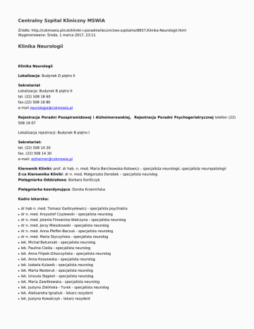 Centralny Szpital Kliniczny MSWiA Źródło: http://cskmswia.pl/csk/kliniki-i-poradnie/lecznictwo-szpitalne/8657,Klinika-Neurologii.html Wygenerowano: Środa, 1 marca 2017, 23:11 Klinika Neurologii Klinika Neurologii Lokalizacja: Budynek D piętro II Sekretariat Lokalizacja: Budynek B piętro II tel. (22) 508 18 60 fax.(22) 508 18 80 e-mail [email protected] Rejestracja Poradni Pozapiramidowej i Alzheimerowskiej, Rejestracja Poradni Psychogeriatrycznej telefon (22) 508 19 07 Lokalizacja rejestracji: Budynek B piętro I Sekretariat: tel. (22) 508 14 20 fax. (22) 508 14 30 e-mail: [email protected] Kierownik Kliniki: prof. dr hab. n. med. Maria Barcikowska-Kotowicz – specjalista neurologii, specjalista neuropatologii Z-ca Kierownika Kliniki: dr n. med. Małgorzata Dorobek – specjalista neurolog Pielęgniarka Oddziałowa: Barbara Korólczyk Pielęgniarka koordynująca: Dorota Krzemińska Kadra lekarska: ● dr hab n. med. Tomasz Garbryelewicz - specjalista psychiatra ● dr n. med. Krzysztof Czyżewski - specjalista neurolog ● dr n. med. Jolanta Finowicka-Walczyna - specjalista neurolog ● dr n. med. Jerzy Mieszkowski - specjalista neurolog ● dr n. med. Anna Pfeffer-Baczuk - specjalista neurolog ● dr n. med. Maria Styczyńska - specjalista neurolog ● lek. Michał Balcerzak - specjalista neurolog ● lek. Paulina Cieśla - specjalista neurolog ● lek. Anna Filipek-Gliszczyńska - specjalista neurolog ● lek. Anna Kossowska - specjalista neurolog ● lek. Izabela Kulawik - specjalista neurolog ● lek. Marta Nesteruk - specjalista neurolog ● lek. Urszula Stępień - specjalista neurolog ● lek. Maria Zawitkowska - specjalista neurolog ● lek. Justyna Zielińska - Turek - specjalista neurolog ● lek. Aleksandra Ignatiuk - lekarz rezydent ● lek. Justyna Kowalczyk - lekarz rezydent W strukturze Kliniki znajdują się: ● Oddział neurologiczny z Pododdziałem Udarowym oraz Salą Intensywnego Nadzoru Neurologicznego (34 łóżka) - zajmuje się leczeniem i diagnostyką pacjentów ze schorzeniami układu nerwowego. Szczególny nacisk położony jest na opiekę nad chorymi z udarem mózgu. Pododdział posiada obecnie 6 stanowisk zapewniających pełne monitorowanie podstawowych funkcji życiowych (EKG, liczba oddechów, ciśnienie tętnicze, pulsoksymetria, temperatura) łącznie z centralą zbiorczą w dyżurce pielęgniarek. Leczenie pacjentów z ostrym udarem mózgu odbywa się w Pododdziale Udarowym (w tym 1-3 doby na sali monitorowanej). W Klinice stosuje się nowoczesne metody leczenia udaru, w tym leczenie fibrynolityczne. Należy podkreślić ścisłe współdziałanie Pododdziału Udarowego ze Szpitalnym Oddziałem Ratunkowym z Zespołami Ratownictwa Medycznego. Dzięki temu możliwe jest skrócenie do minimum czasu od wystąpienia udaru do wdrożenia leczenia. Po ustąpieniu ostrego okresu udaru możliwa jest rehabilitacja w ramach Oddziału Rehabilitacji Neurologicznej , z którym Klinika ściśle współpracuje. ● Pracownie diagnostyczne: Elektroencefalografii (EEG), Elektromiografii (EMG) i Potencjałów Wywołanych (PW), USG – Doppler tętnic domózgowych, umożliwiają szczegółową diagnostykę pacjentów. Badania wykonywane są przy użyciu nowoczesnego sprzętu zarówno dla pacjentów hospitalizowanych jak i leczonych ambulatoryjnie ● Przykliniczne Poradnie Specjalistyczne Odwiedziny w sali Intensywnego Nadzoru Neurologicznego są możliwe do godz. 13:00 Przykliniczne Poradnie Specjalistyczne Lokalizacja: Budynek B piętro I Rejestracja do specjalistów tel. (22) 508 15 52, (22) 508 15 79 w punktach Rejestracji. Zobacz więcej w dziale Zapisy i rejestracja - podstawowe informacje 1. Poradnia Neurologiczna ogólna Oddział Udarowy Kliniki Neurologii Kadra Lekarska: ● dr n. med. Małgorzata Dorobek - specjalista neurolog ● dr. n med Jolanta Finowicka - Walczyna - specjalista neurolog, pracownia EEG ● dr n med Jerzy Mieszkowski - specjalista neurolog ● lek. Michał Balcerzak - specjalista neurolog ● lek. Paulina Cieśla - specjalista neurolog ● lek. Anna Kossowska - specjalista neurolog ● lek. Urszula Stępień - specjalista neurolog ● lek. Justyna Zielińska - Turek - specjalista neurolog ● dr Marek Odrobiński - specjalista kardiolog ● lek. Ewa Salamon - Kłobud - w trakcie specjalizacji z neurologii Program Leczenia Stwardnienia Rozsianego Kadra Lekarska: ● dr n. med. Małgorzata Dorobek - specjalista neurolog ● lek. Urszula Stępień - specjalista neurolog ● lek. Anna Czajka - Bełz - specjalista neurolog ● lek. Justyna Zielińska - Turek - specjalista neurolog Poradnia Neurologiczna Kadra Lekarska: ● lek. Izabela Kulawik- specjalista neurolog ● lek. Maria Zawitkowska - specjalista neurolog Poradnia Pozapiramidowa i Alzheimerowska Rejestracja tel. (22) 508 19 07 Poradnia prowadzi terapię indywidualną i grupy terapeutyczne w zakresie pamięci a także poradnictwo i wsparcie psychologiczne dla opiekunów. Kadra Lekarska: ● prof. dr hab. n. med. Tomasz Gabryelewicz specjalista psychiatra ● dr n. med. Krzysztof Czyżewski - specjalista neurolog ● dr n. med. Ann Pfeffer - Baczuk ● lek. Anna Filipek - Gliszczyńska - specjalista neurolog ● dr n. med. Maria Styczyńska - specjalista neurolog ● dr n. med. Marta Nesteruk - specjalista neurolog ● lek. Kamila Bojakowska - specjalista neurolog Wykaz dokumentów i rzeczy osobistych niezbędnych do planowanego przyjęcia: Wykaz niezbędnych dokumentów: ● skierowanie do szpitala ● dowód osobisty Wykaz niezbędnych rzeczy osobistych: ● przybory toaletowe ● piżama ● ręczniki ● kapcie ● szlafrok Drukuj Generuj PDF Powiadom znajomego Wstecz